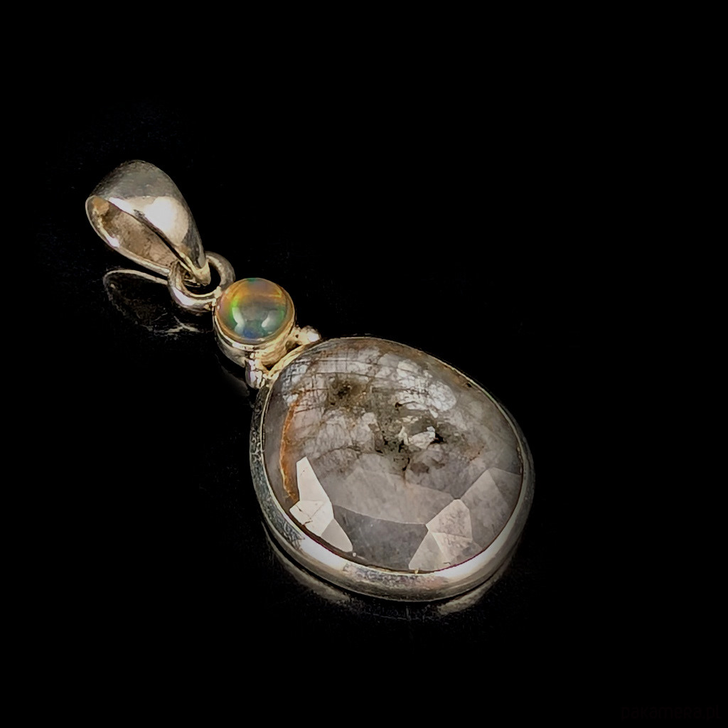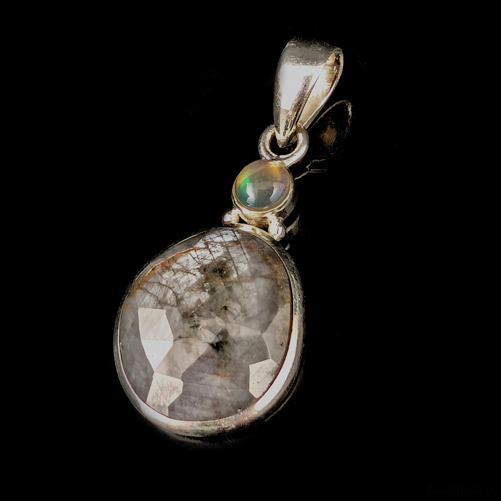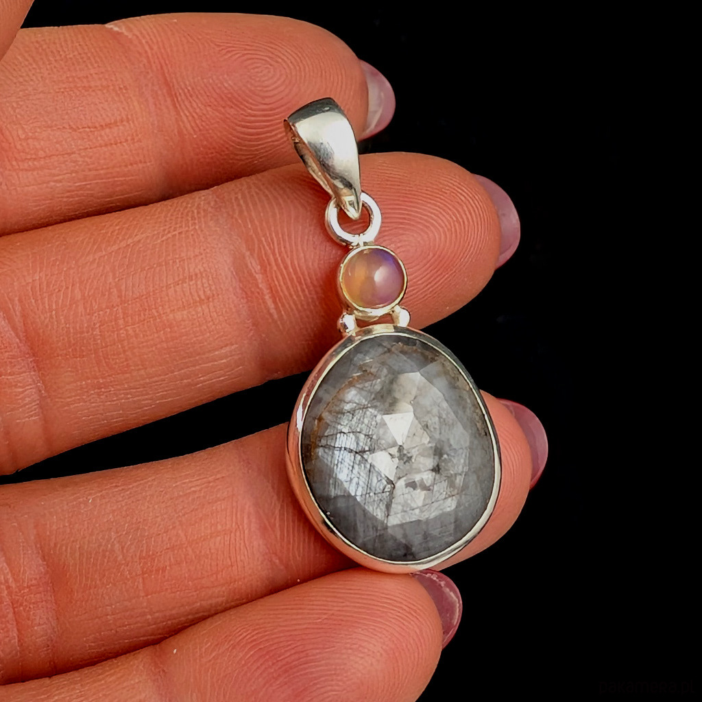 Subtelny wisiorek wykonany ze srebra próby 925 oraz pięknego, fasetowanego szafiru o srebrzystym odcieniu. Towarzyszy mu opal etiopski. Wymiary oprawy kamienia 18 x 16 mm. Długość z krawatką 38 mm. Waga 5 g. Wykonany przez dostawcę kamieni. Zawieszka zostanie zapakowana w ozdobne pudełeczko.