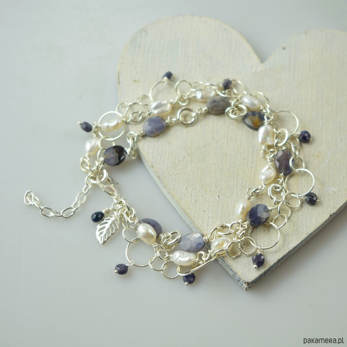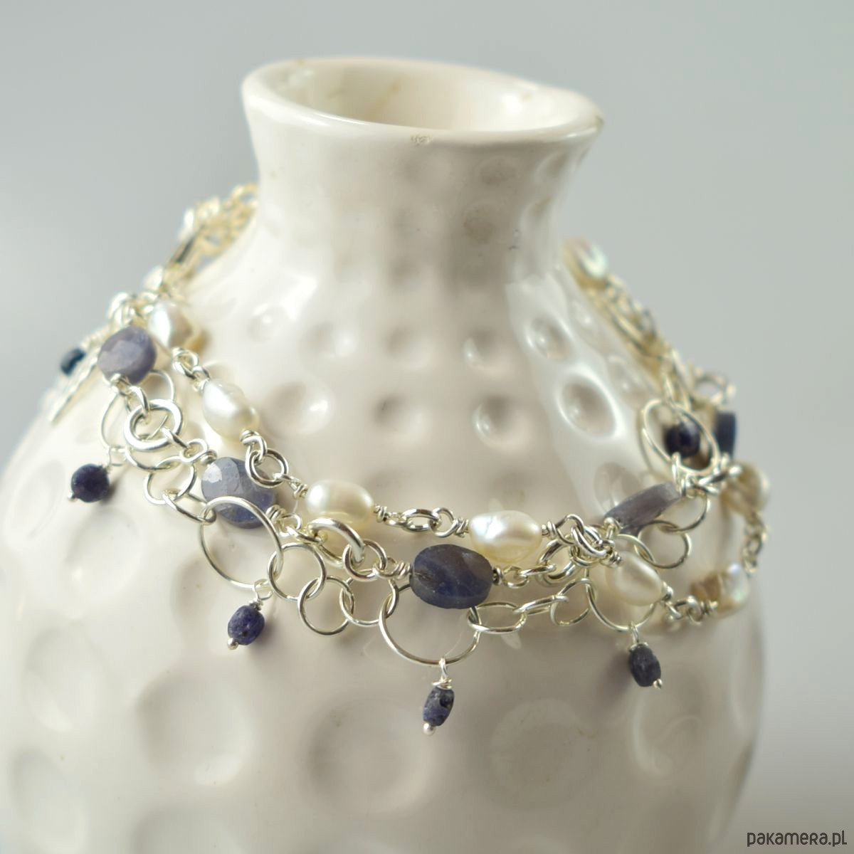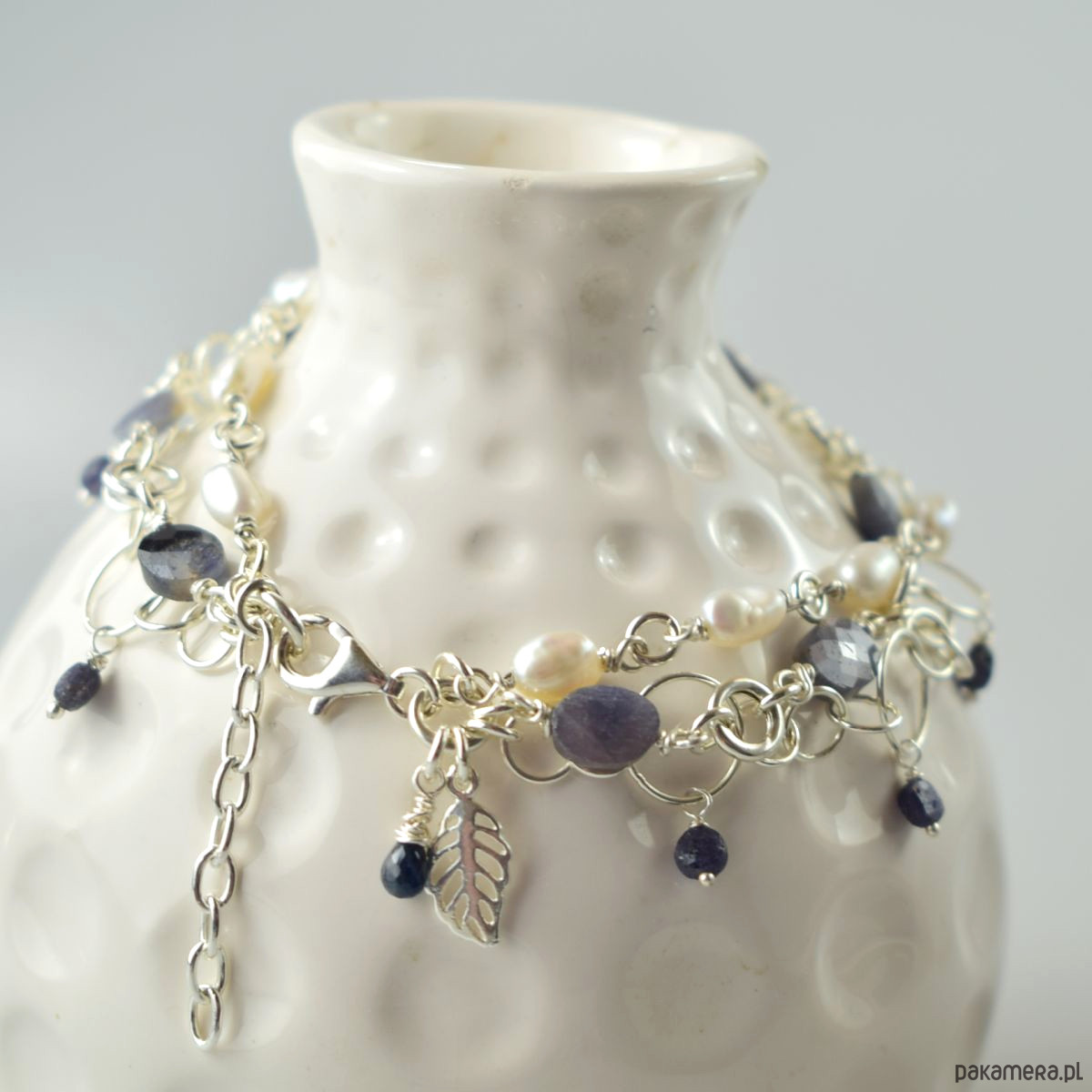 Bransoletka wykonana w całości ze srebra (próba 925) z szafirem i perłami. Długość regulowana 21 - 24 cm. Biżuteria zostanie ozdobnie zapakowana.