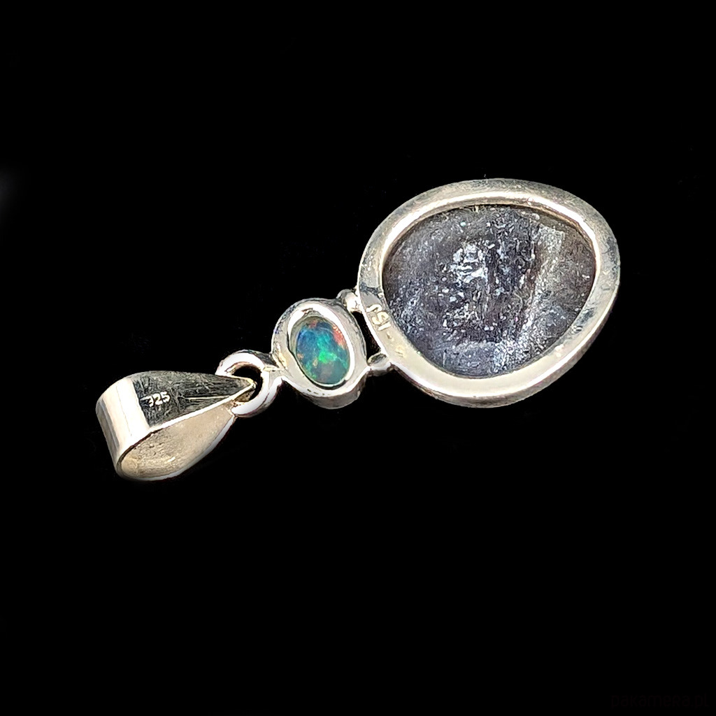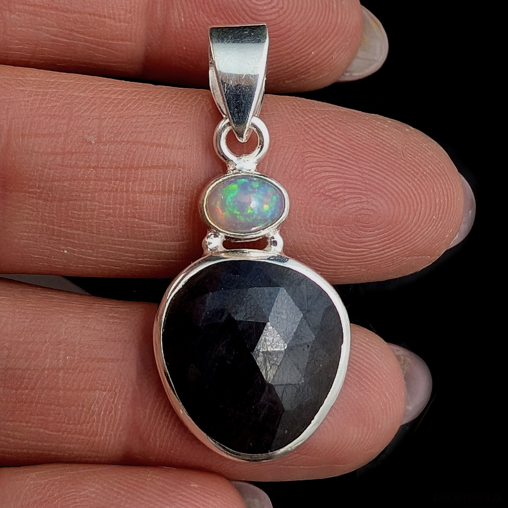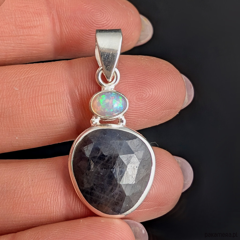 Subtelny wisiorek wykonany ze srebra próby 925 oraz pięknego, fasetowanego szafiru. Towarzyszy mu multibarwny opal etiopski. Wymiary oprawy kamienia 17 x 16 mm. Długość z krawatką 37 mm. Waga 4 gramy. Wykonany przez dostawcę kamieni. Zawieszka zostanie zapakowana w ozdobne pudełeczko.