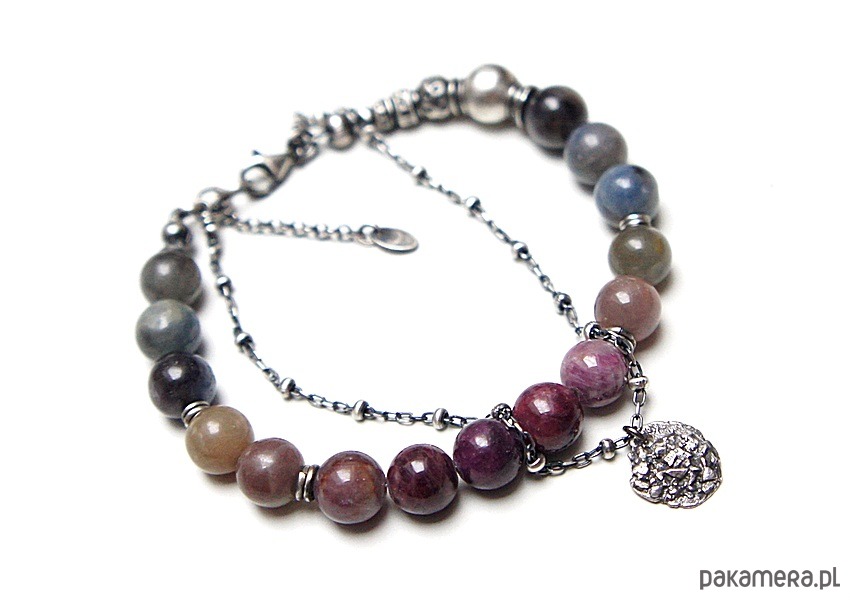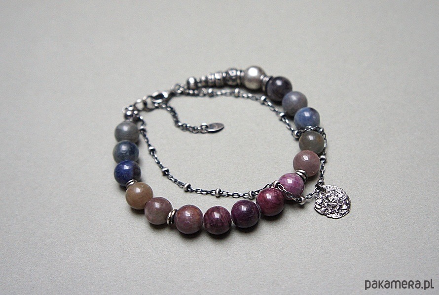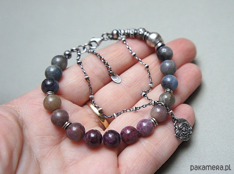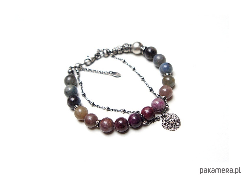 Bransoletka wykonana ze srebra [pr.925] w połączeniu z kuleczkami szafirów i rubinów [10mm ]. Całość oksydowana i przetarta. Całkowita długość bransoletki:18,5cm plus ozdobna przedłużka . Biżuteria ozdobnie zapakowana.