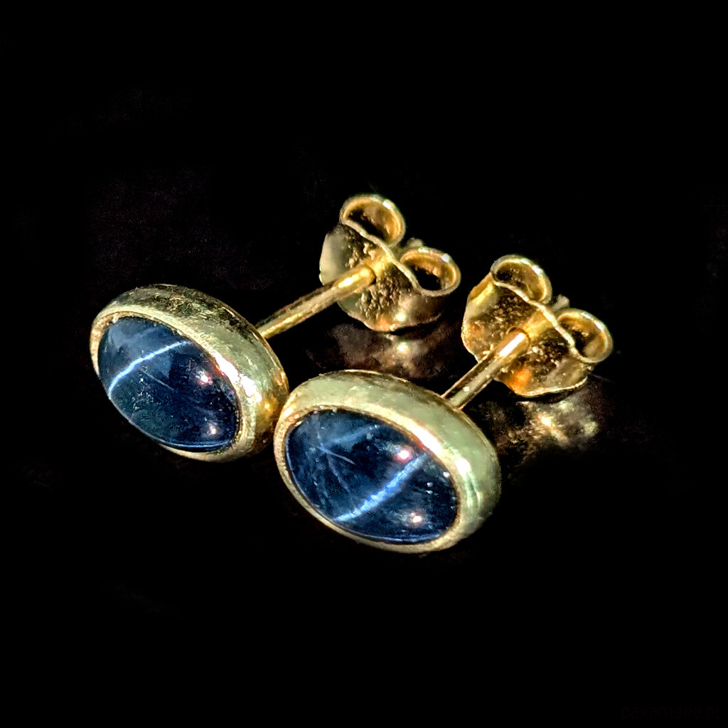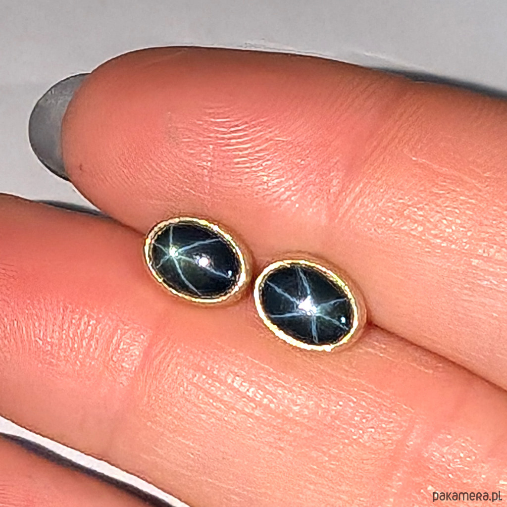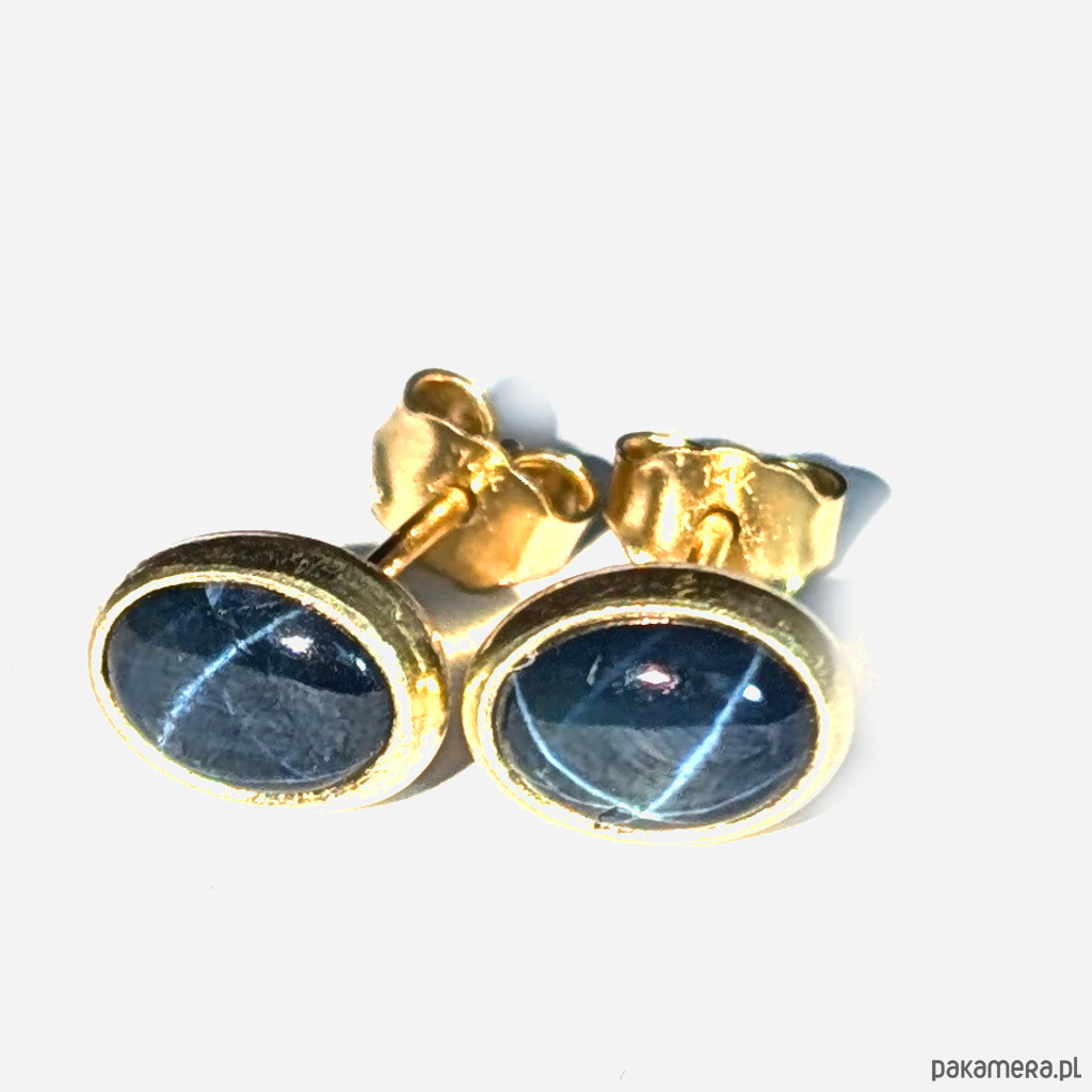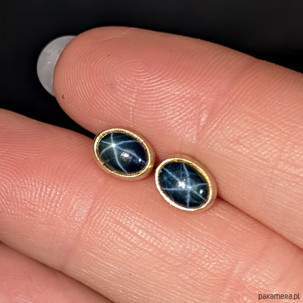 Piękne, eleganckie kolczyki wykonane ze złota próby 585, 14 K. Ozdobą sztyftów są przepiękne szafiry gwiaździste ze zjawiskiem asteryzmu- bardzo wyraźna gwiazda, zjawisko widoczne w skupionym świetle (żarówka, halogen, słońce) porusza się wraz ze źródłem światła. Tańczące na ciemnej tafli gwiazdy tworzą wyjątkową kompozycję. Kamienie dyfuzjowane. Polecam z pięknym pierścieniem praz wisiorkiem do kompletu. Wymiary oprawy kamienia 7 x 6 mm, Waga jednego kolczyka 0,88 grama. Kolczyki zapakowane w ozdobne pudełeczko