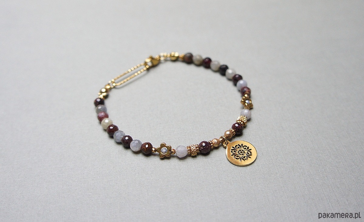 Delikatna bransoletka wykonana w całości ze stali szlachetnej pozłacanej, szlachetnych kamieni - szafirów i rubinów fasetowanych [4,5mm], szafirów platerowanych w kolorze błękitnym [1,5mm], hematytu fasetowanego, platerowanego [2mm i 3mm], kwiatków z hematytu [6mm]. Całkowita długość bransoletki 18,8cm. Biżuteria ozdobnie zapakowana.