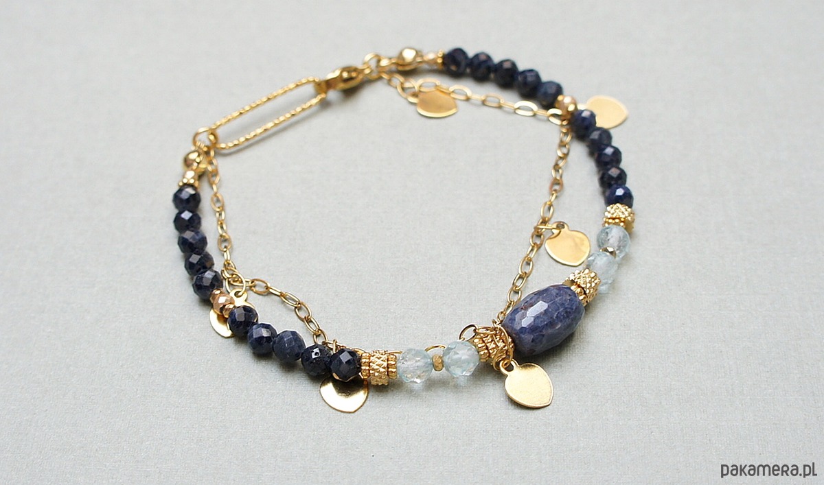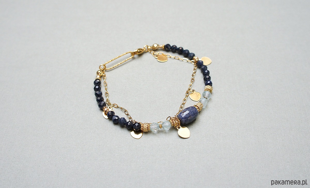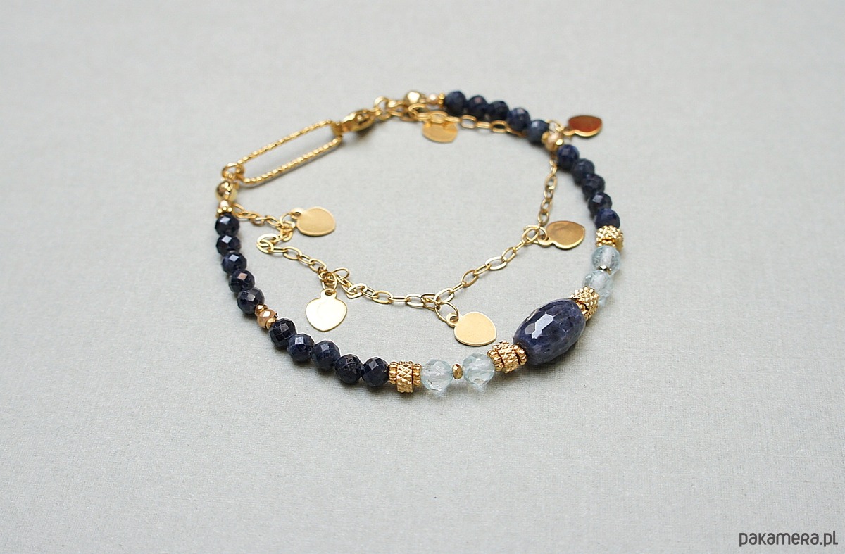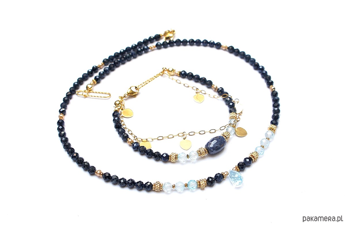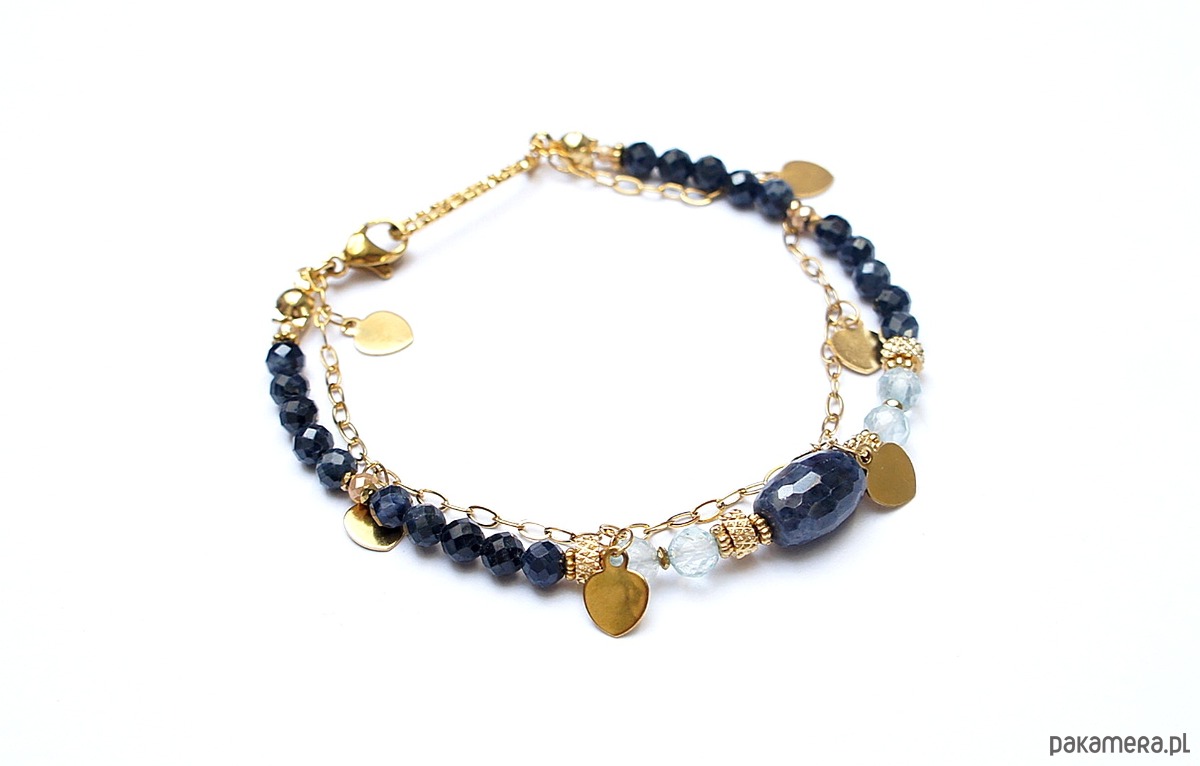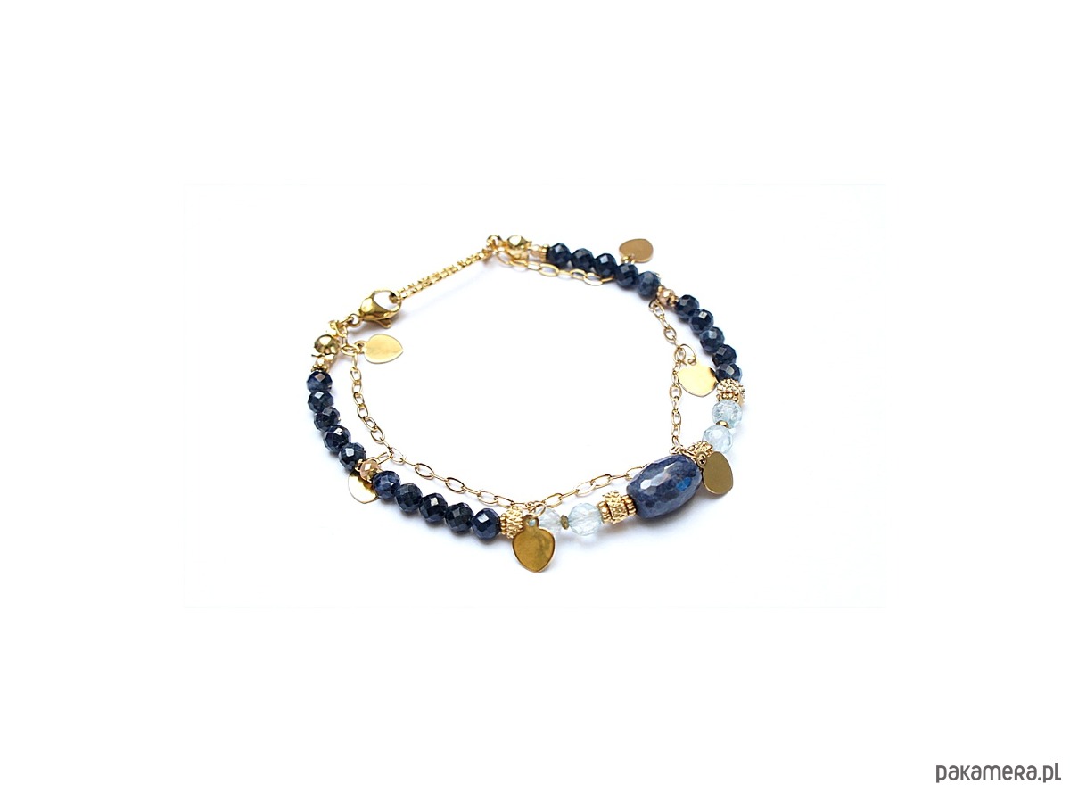 Delikatna bransoletka wykonana w całości z pozłacanej stali szlachetnej oraz naturalnych, szlachetnych kamieni - fasetowanych szafirów [4mm], fasetowanych niebieskich topazów [4mm], fasetowanej oliwki szafiru [11 x 7mm], fasetowanych, platerowanych hematytów [2mm i 3mm], przekładek z hematytów [1mm]. Całkowita długość bransoletki: 18,7mm (możemy dopasować na inny nadgarstek - wcześniej prosimy o kontakt). Do kompletu można dokupić naszyjnik przedstawiony na zdjęciach. Biżuteria ozdobnie zapakowana.
