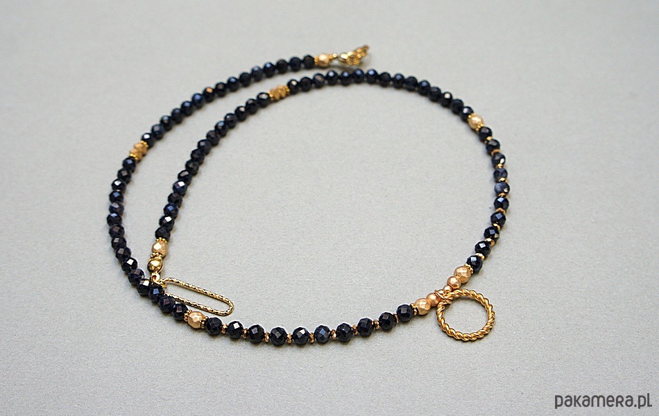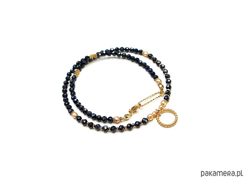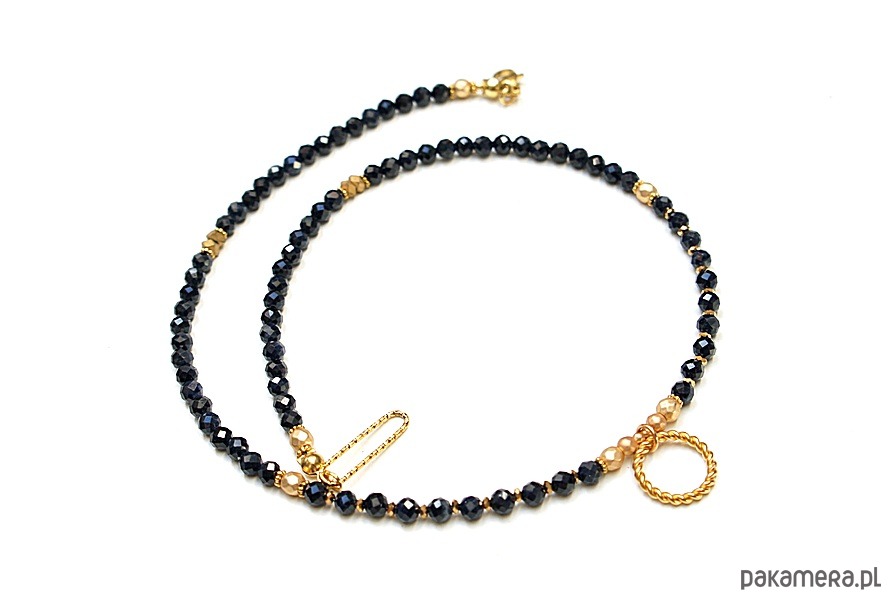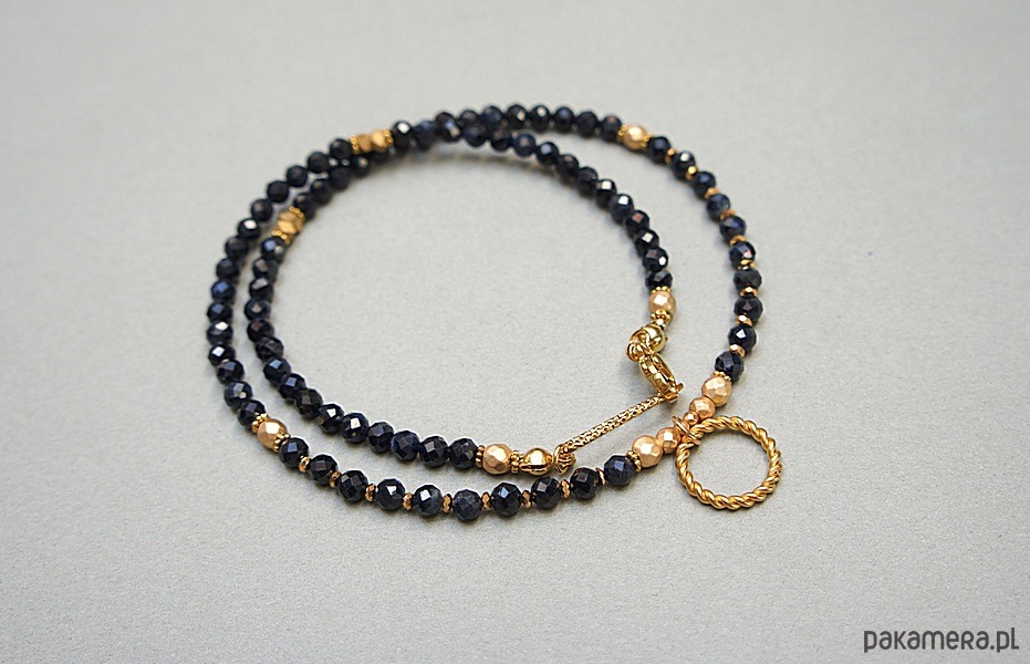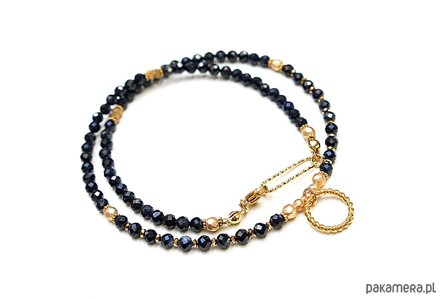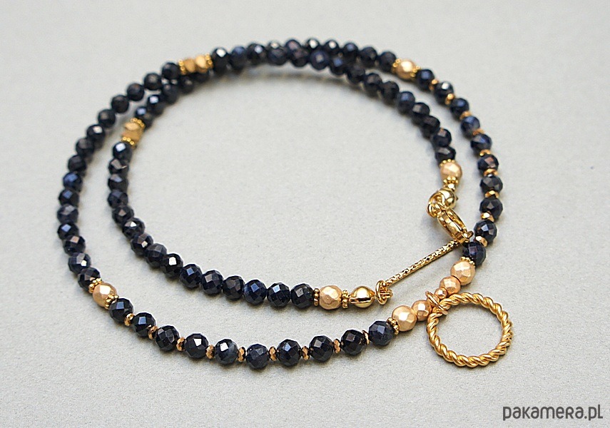 Krótki, delikatny naszyjnik wykonany w całości z pozłacanej stali szlachetnej oraz naturalnych, szlachetnych kamieni - szafiry fasetowane [4mm], przekładek z hematytu [1mm, 2mm, 3mm, 3 x 2mm, 4mm]. Naszyjnik o długości 44cm.