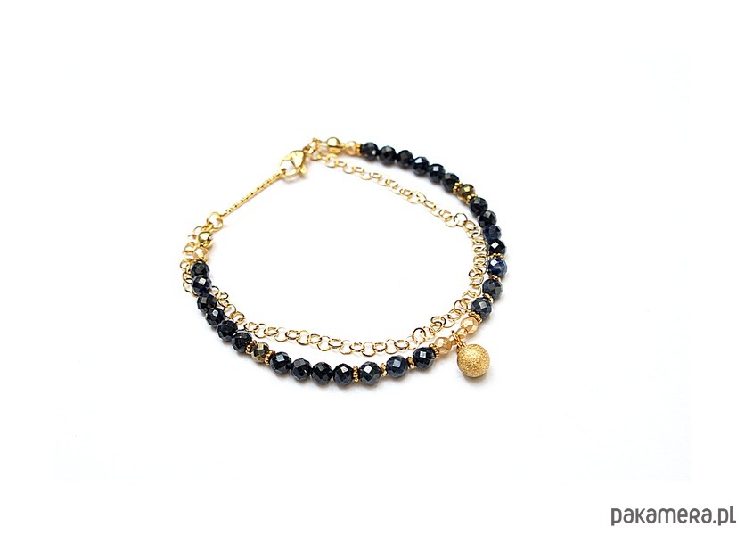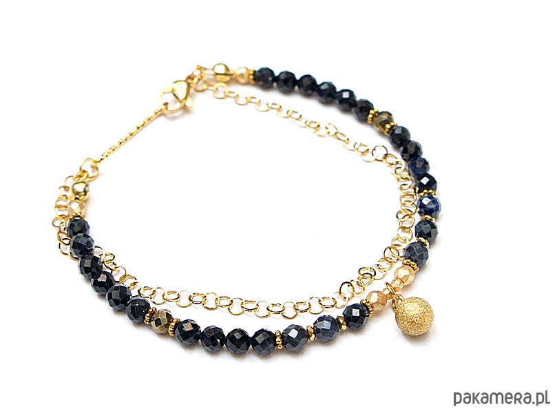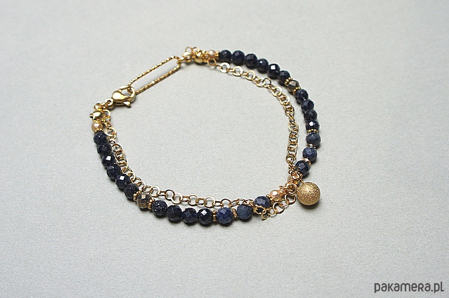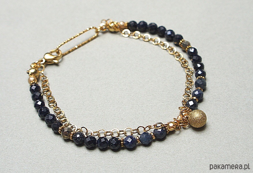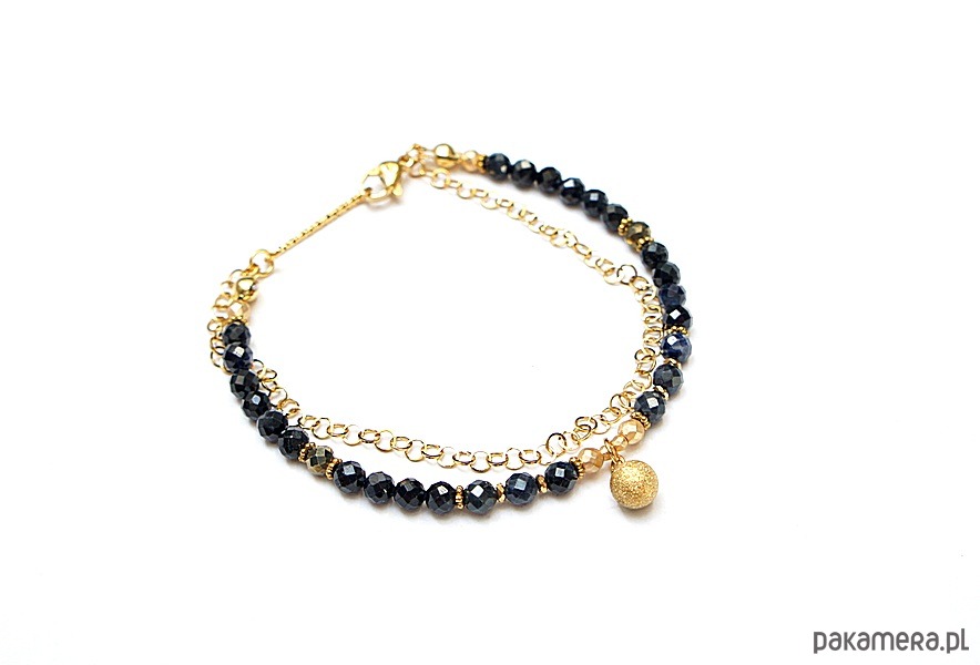 Delikatna bransoletka wykonana w całości z pozłacanej stali szlachetnej oraz naturalnych, szlachetnych kamieni - fasetowanych szafirów [4mm], fasetowanych pirytów [4mm], fasetowanych, platerowanych hematytów [3mm], przekładek z hematytów [1mm]. Bransoletka pasuje na nadgarstek 15 - 16cm. Biżuteria ozdobnie zapakowana.