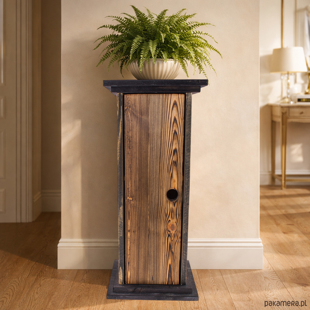 Szafka została zaprojektowana z myślą o przechowywaniu 1-4 butelki alkoholu w eleganckiej, zabudowanej formie. Na górnej półce wewnątrz szafki znajduje jest też miejsce na 4 duże kieliszki. To ciekawy sposób na wyeksponowanie ulubionego trunku, a jednocześnie stylowy element wystroju wnętrza. Naturalna struktura drewna, postarzana powierzchnia i ciemniejsze akcenty konstrukcyjne nadają całości wyjątkowego charakteru inspirowanego stylem vintage, loft oraz rustykalnym rzemiosłem.
