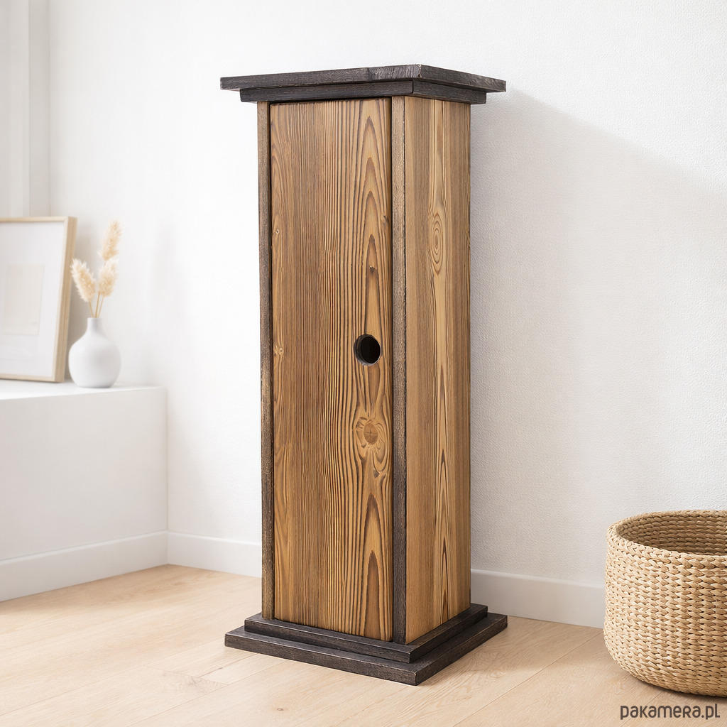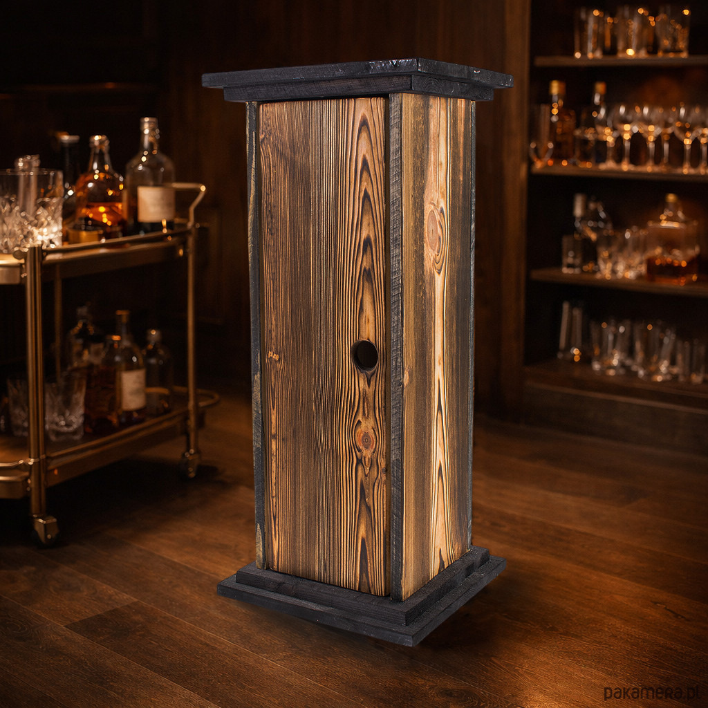 Dzięki swojej pionowej konstrukcji produkt prezentuje się jak wąski, dekoracyjny słupek barowy. Nie zajmuje dużo miejsca, a jednocześnie przyciąga wzrok i buduje klimat wnętrza. Może pełnić funkcję eleganckiej osłony na butelkę, prezentowego opakowania premium lub nietuzinkowej dekoracji do przestrzeni domowej i komercyjnej.
