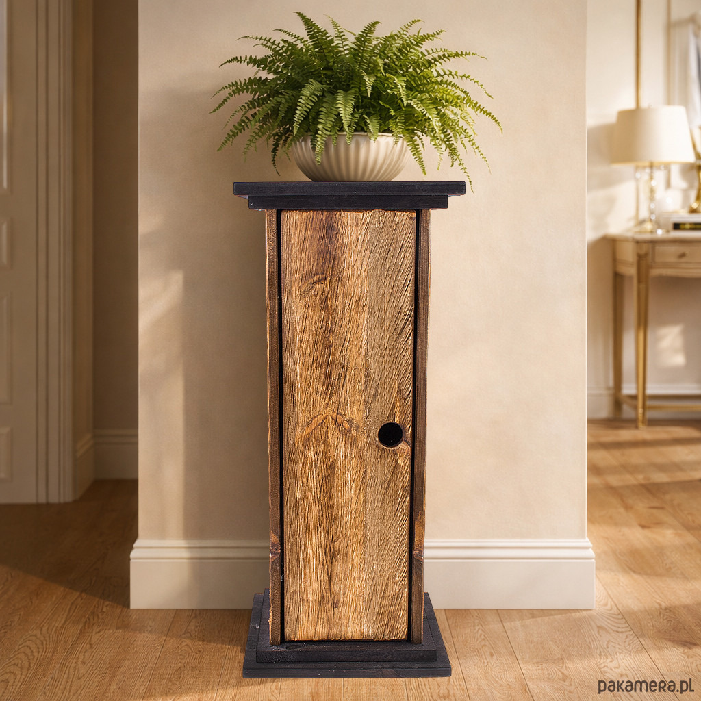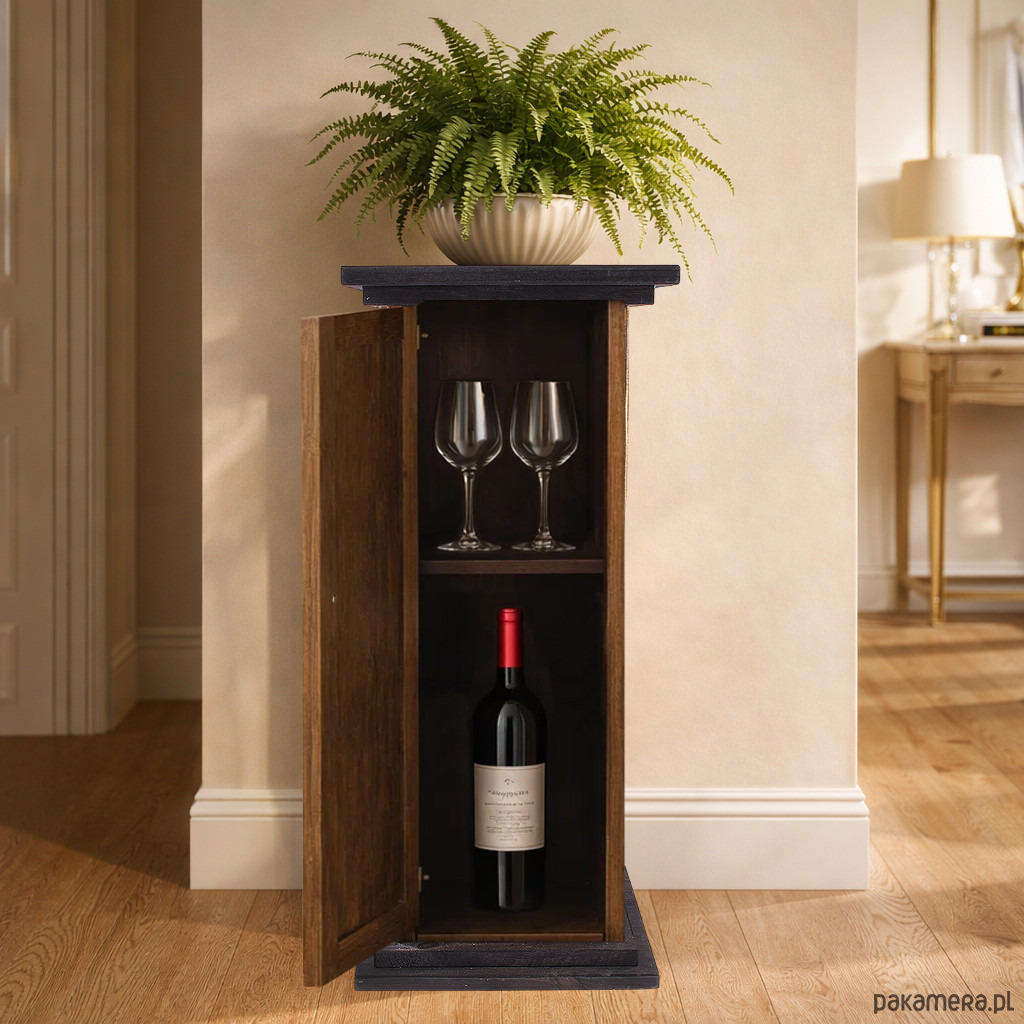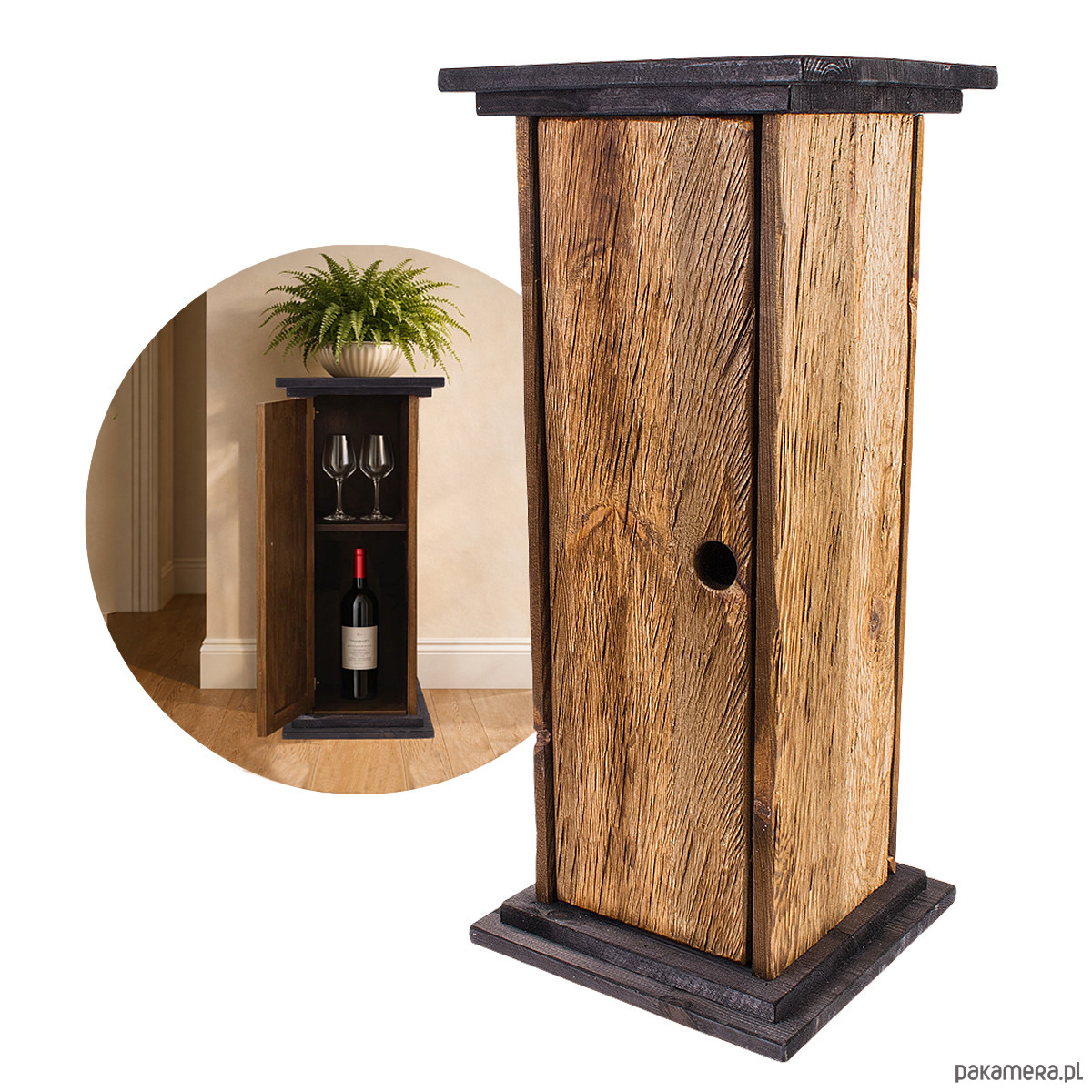 Szafka została zaprojektowana z myślą o przechowywaniu 1-4 butelki alkoholu w eleganckiej, zabudowanej formie. Na górnej półce wewnątrz szafki znajduje jest też miejsce na 4 duże kieliszki. To ciekawy sposób na wyeksponowanie ulubionego trunku, a jednocześnie stylowy element wystroju wnętrza. Naturalna struktura drewna, postarzana powierzchnia i ciemniejsze akcenty konstrukcyjne nadają całości wyjątkowego charakteru inspirowanego stylem vintage, loft oraz rustykalnym rzemiosłem.