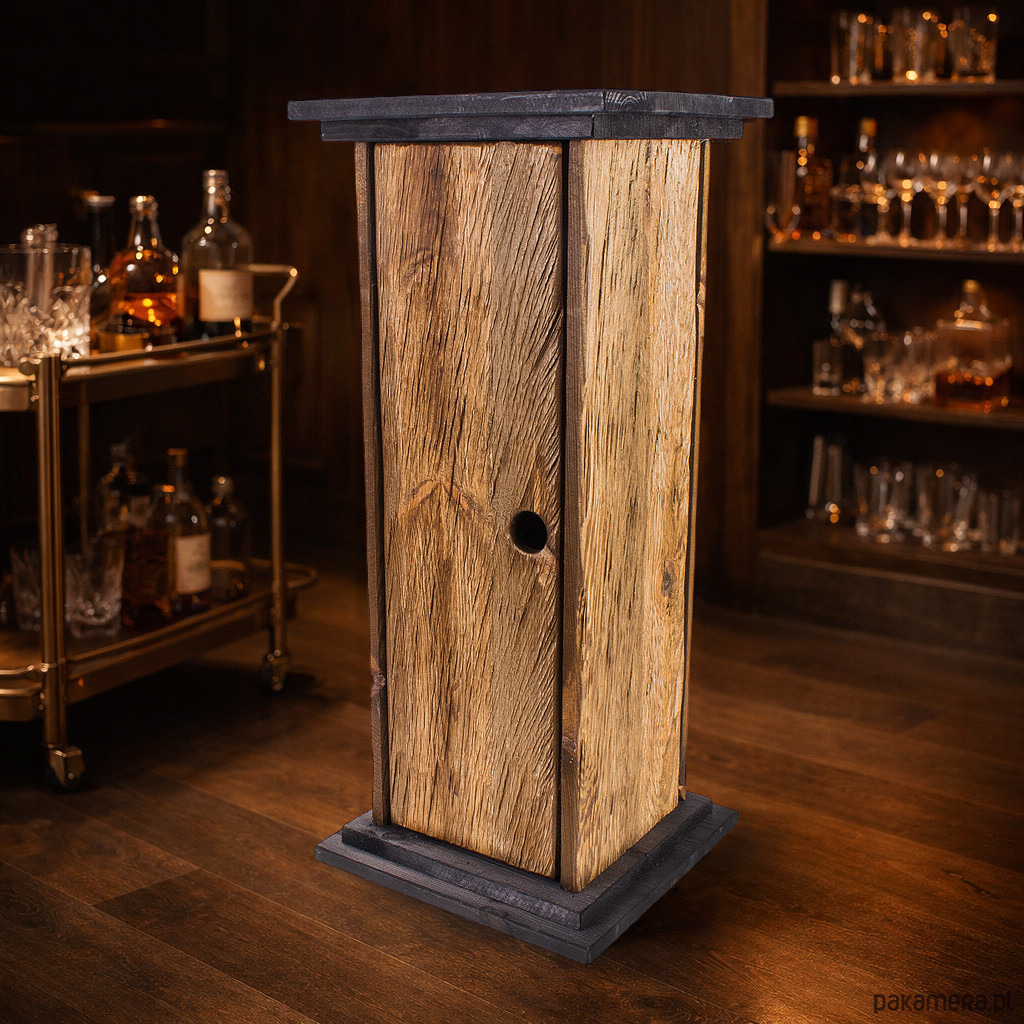 Dzięki swojej pionowej konstrukcji produkt prezentuje się jak wąski, dekoracyjny słupek barowy. Nie zajmuje dużo miejsca, a jednocześnie przyciąga wzrok i buduje klimat wnętrza. Może pełnić funkcję eleganckiej osłony na butelkę, prezentowego opakowania premium lub nietuzinkowej dekoracji do przestrzeni domowej i komercyjnej.