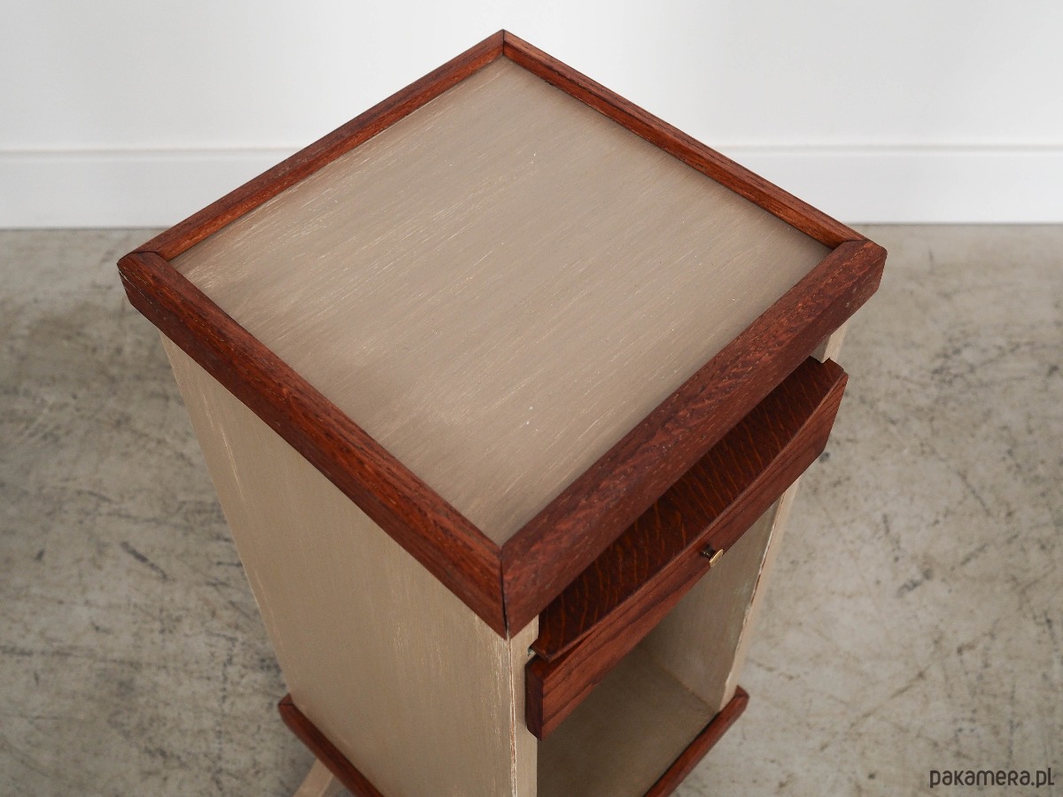 Konstrukcja pokryta jest fornirem dębowym. Szafka umieszczona została na drewnianym cokole. Mebel wybarwiono na kolor szary metodą shabby chic. Powierzchnia po odświeżeniu. Wewnątrz przestrzeń została wypełniona praktyczną szufladką.