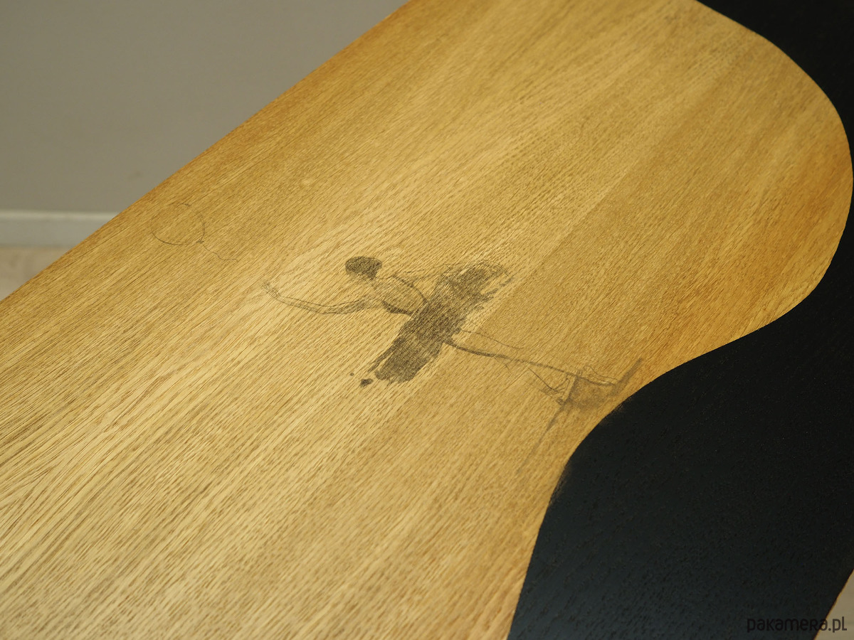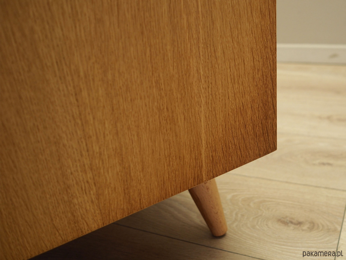 Konstrukcja pokryta jest fornirem jesionowym. Nogi zostały wykonane z litego drewna. Powierzchnia po odświeżeniu. Wewnątrz przestrzeń została wypełniona dwiema półkami z możliwością regulacji wysokości. Szafka posiada praktyczne rozwiązanie drzwi przesuwnych, dzięki czemu ograniczamy konieczność pozostawienia dużej wolnej przestrzeni przed meblem, jednocześnie nie ograniczając sobie dostępu do jego wnętrza. Ponadto przesuwne drzwi są idealnym rozwiązaniem, aby wykorzystać mebel pod sprzęt audio.