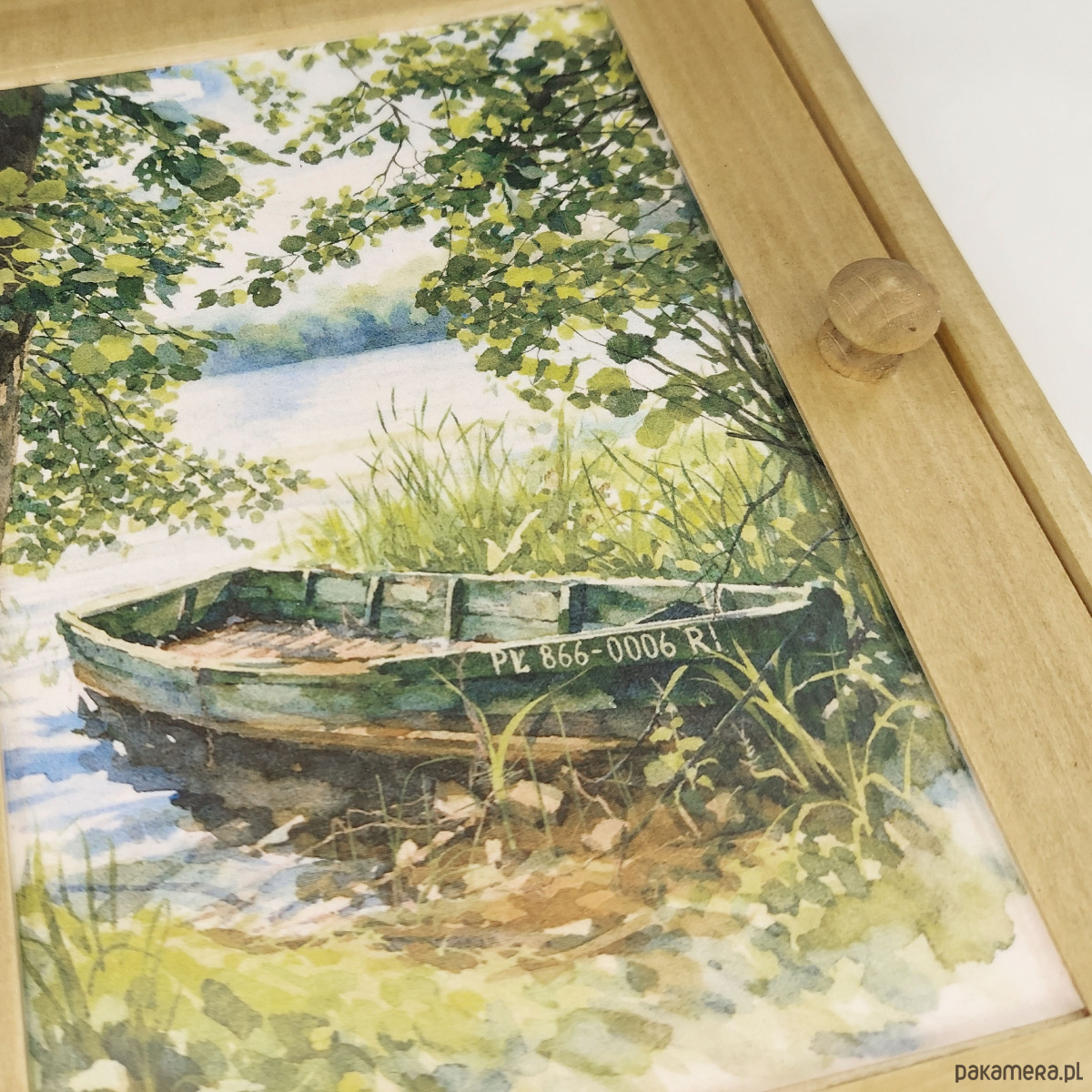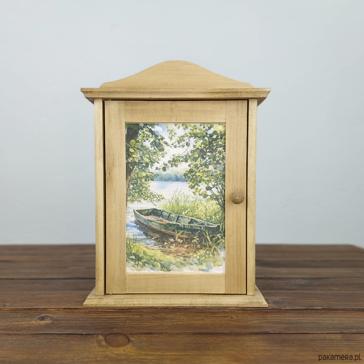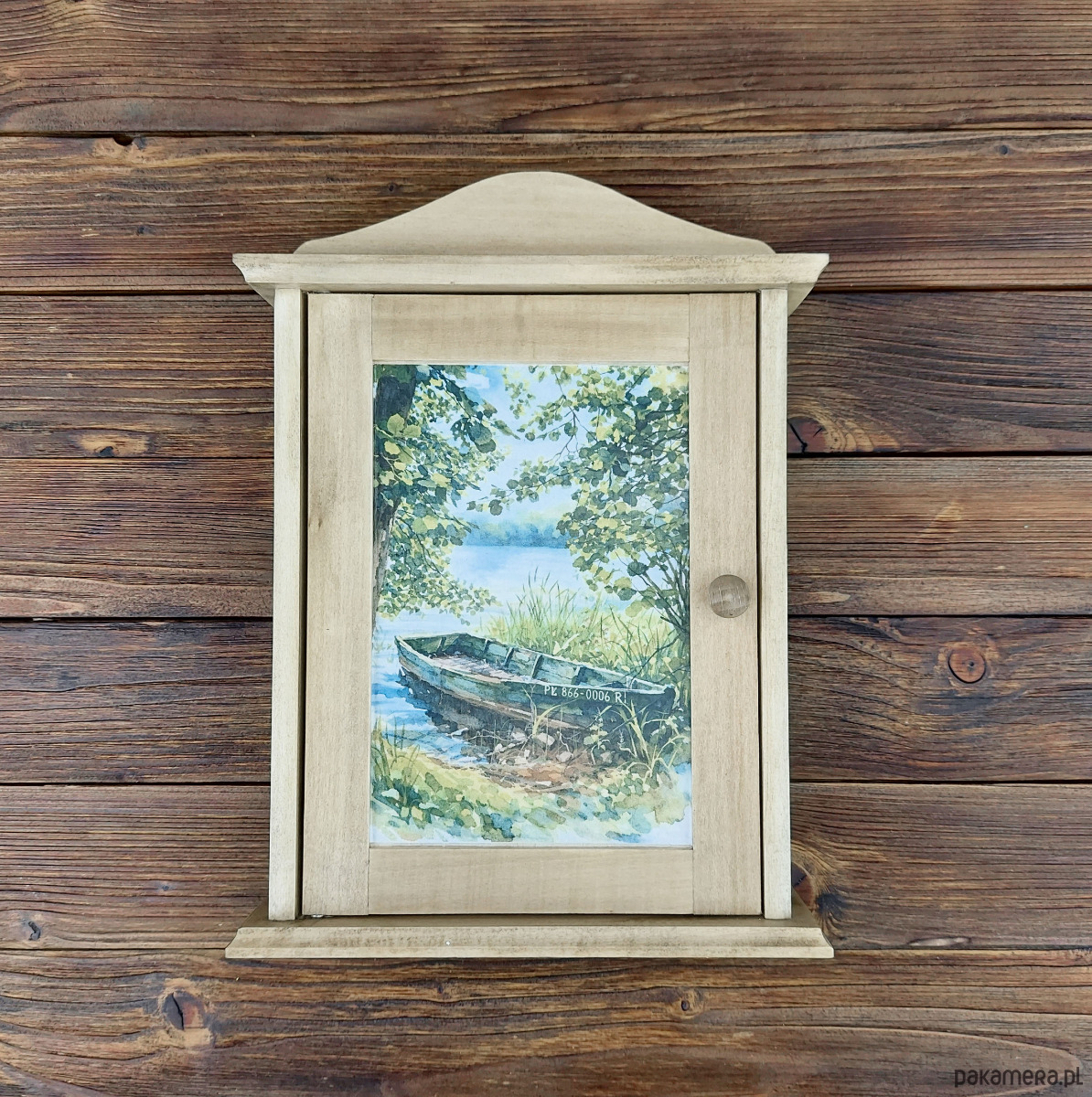 Niewielka, drewniana szafka na klucze może stać się praktyczną ozdobą każdego domu. Teraz już nigdy nie będziesz tracić czasu na poszukiwanie zagubionych kluczyków 😉 Szafkę ozdobiliśmy grafiką przygotowaną na podstawie własnej fotografii. Pogodna wiosna, spokojne jezioro, zieleń i łódka na wodzie – to przyjemny widok, który będzie nas witał po wejściu do domu.