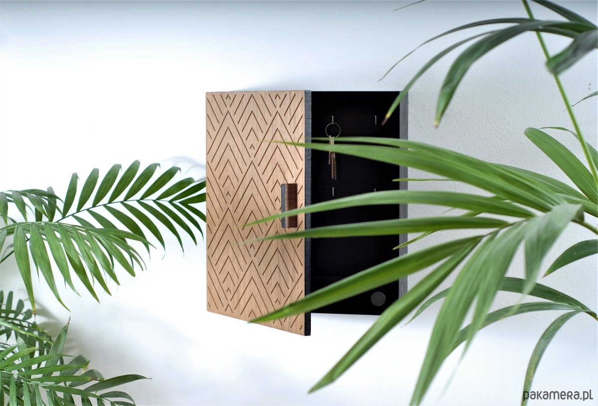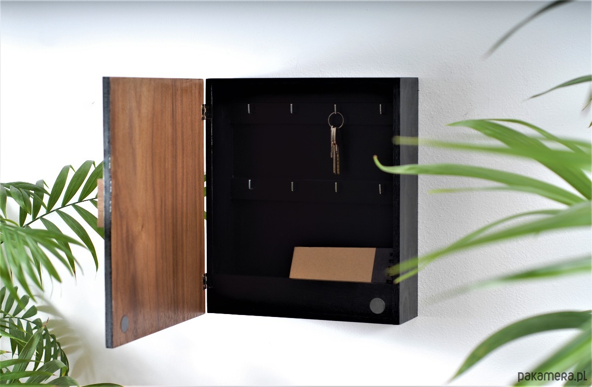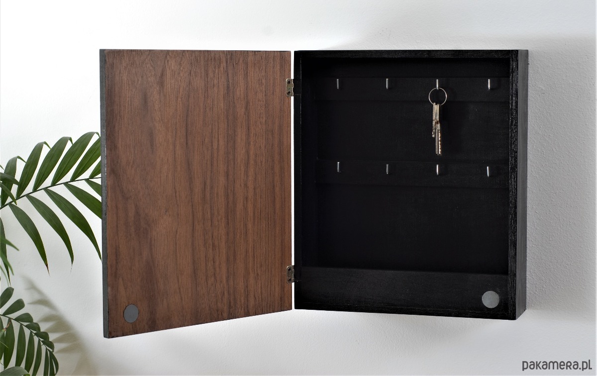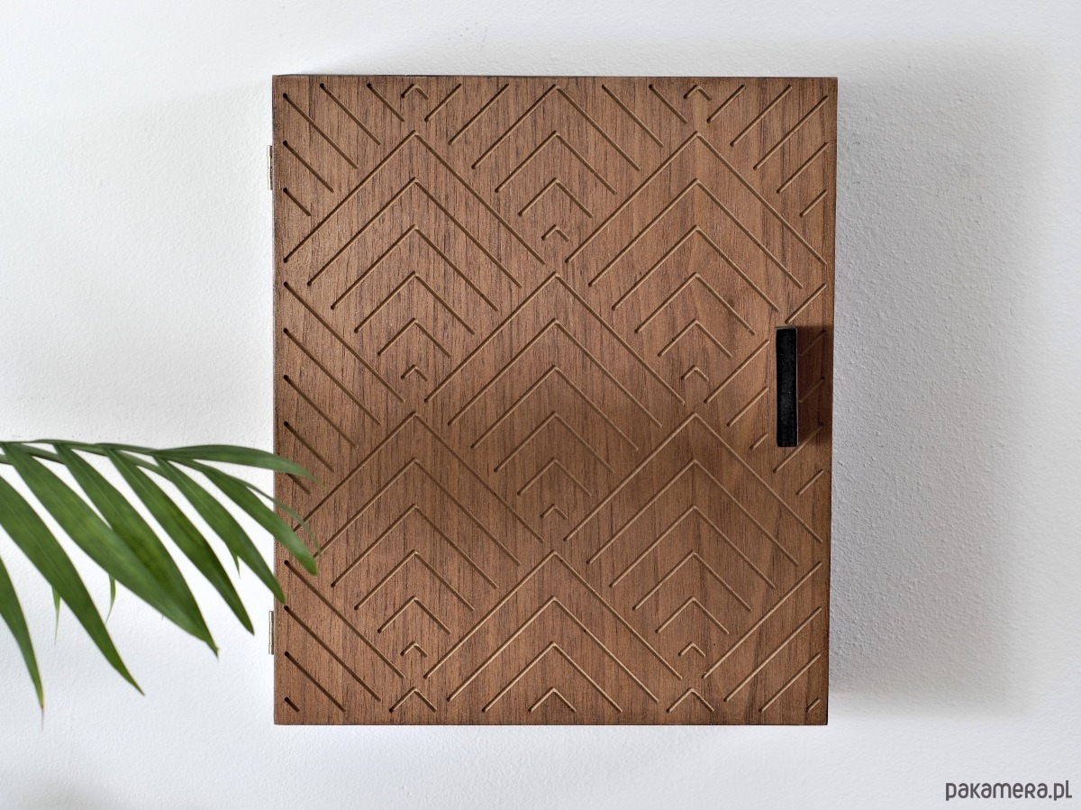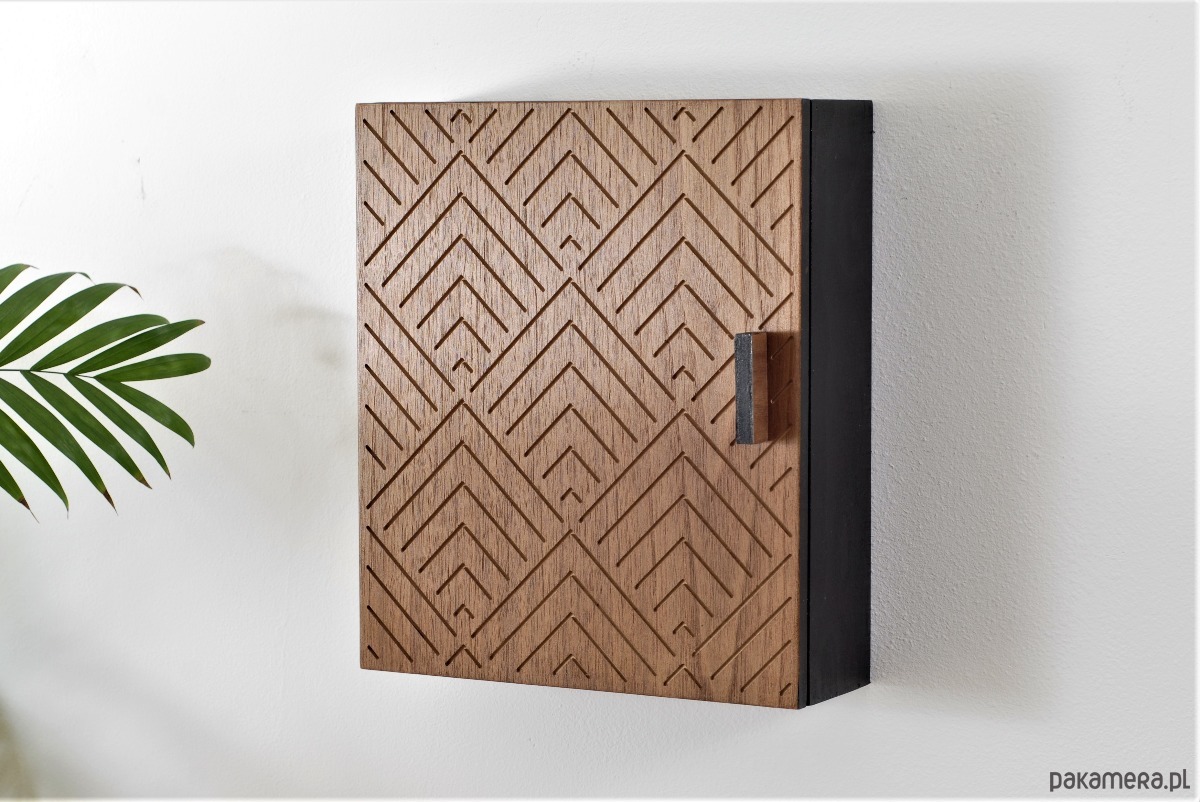 Praktyczna, oryginalna skrzynka na klucze - idealna do przedpokoju, do gabinetu czy biura. Ozdobny, nowoczesny wzór wycięty jest naturalnym fornirze z orzecha. Tył skrzynki i boki pomalowane są na kolor czarny.