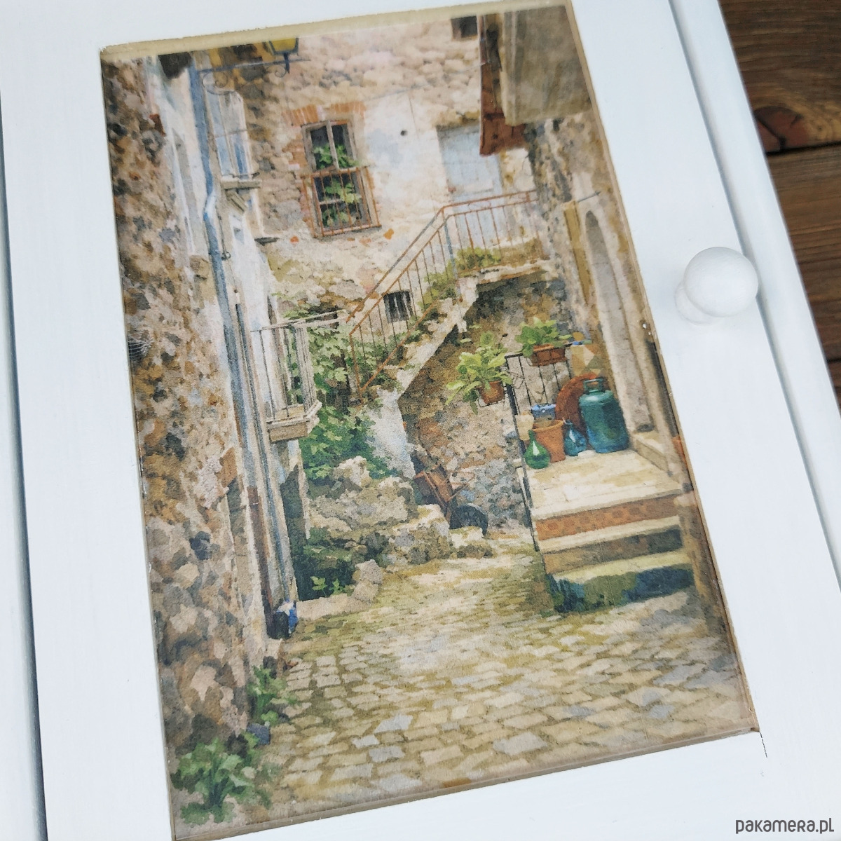 Szafkę ozdobiliśmy grafiką przygotowaną na podstawie własnej fotografii niewielkiego zaułka w jednym z toskańskich miasteczek. Wprowadzi odrobinę wakacyjnego klimatu do każdego domu.