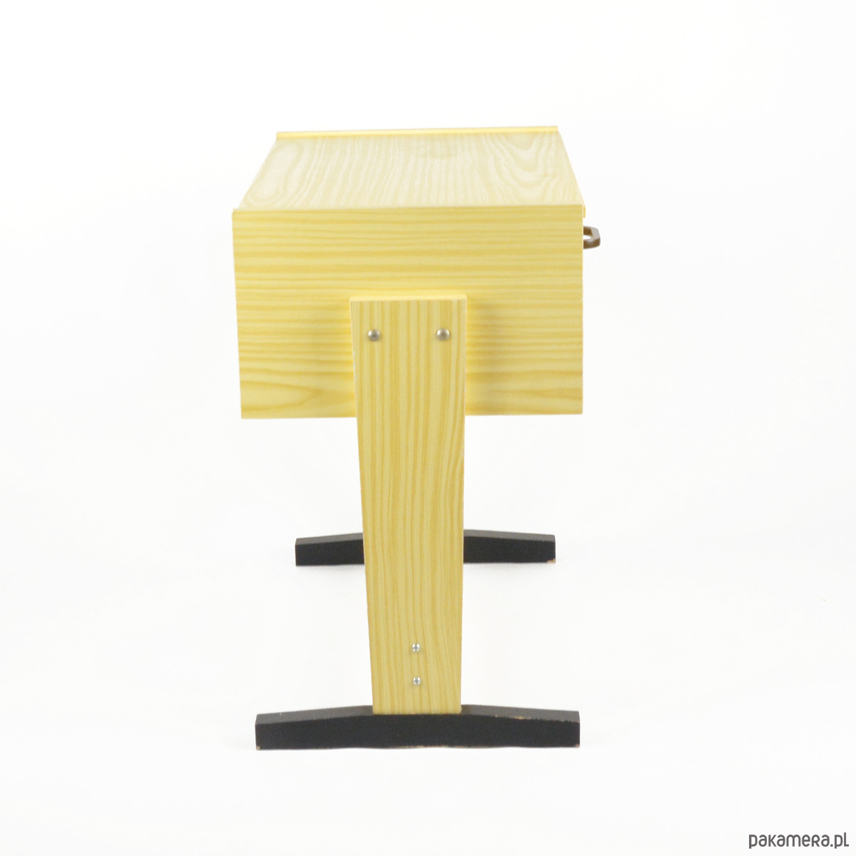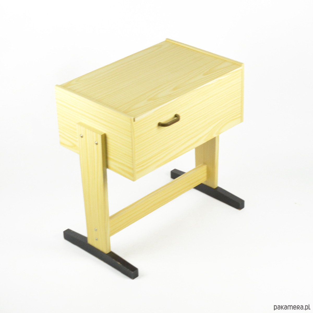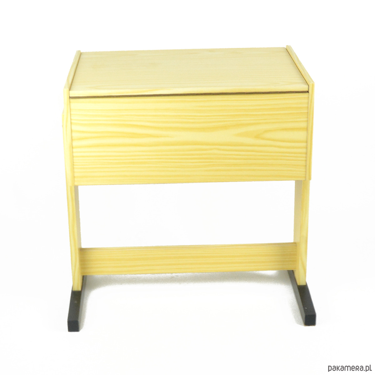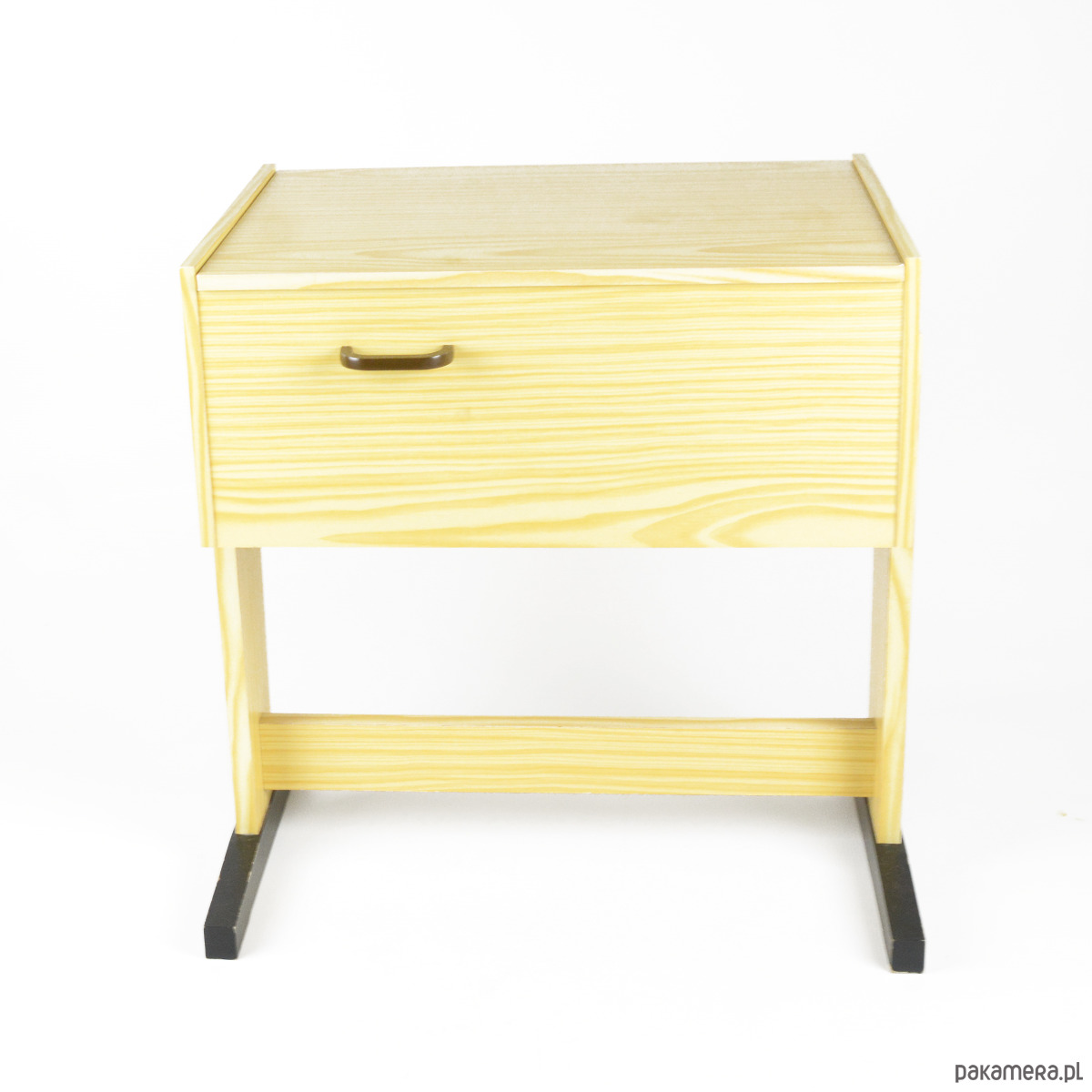 Szafka nocna lub niciak z lat 70. produkcji niemieckiej. Szafka z wiekiem otwieranym do góry w środku przybornik pod skrzynią z przybornikiem. Skrzynia wykonana z płyty meblowej wykończona okleiną imitującą drewno, nogi proste zakończone czarnymi płozami z masywu bukowego. stanowią stelaż mebla. Stolik w stanie oryginalnym dobrym, nosi normalne ślady użytkowania.