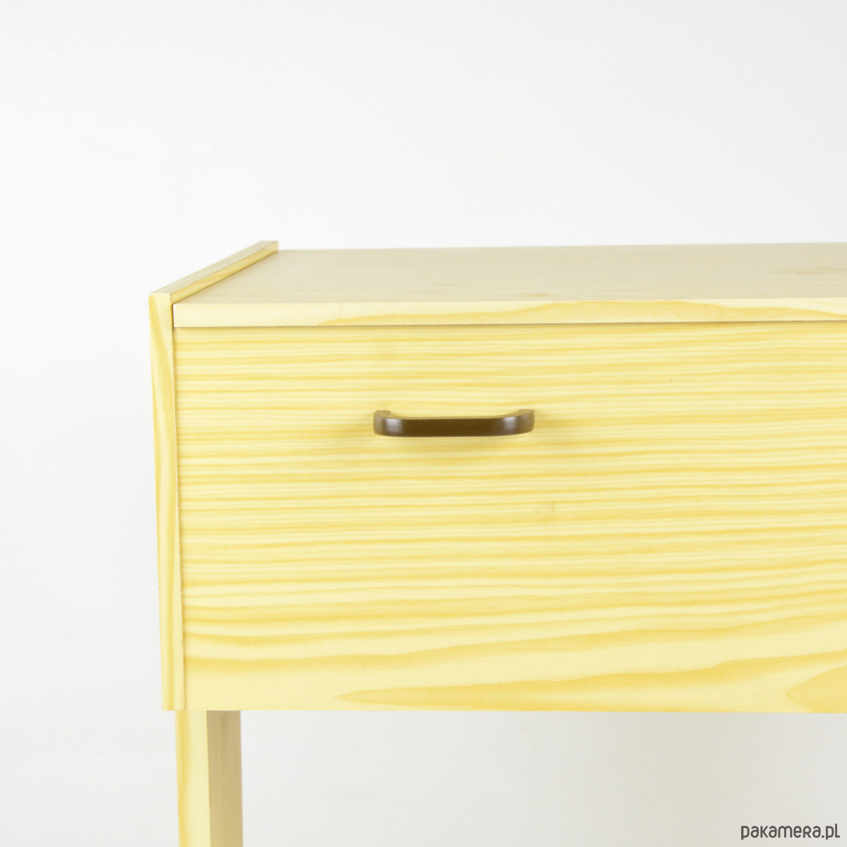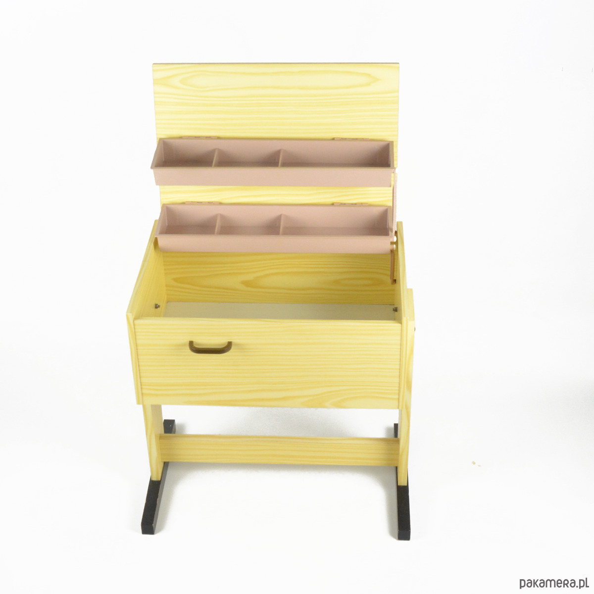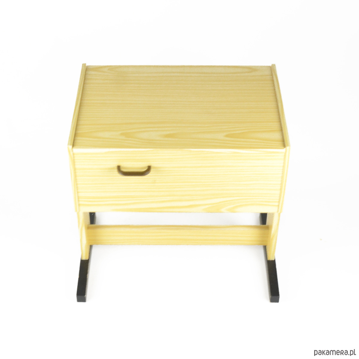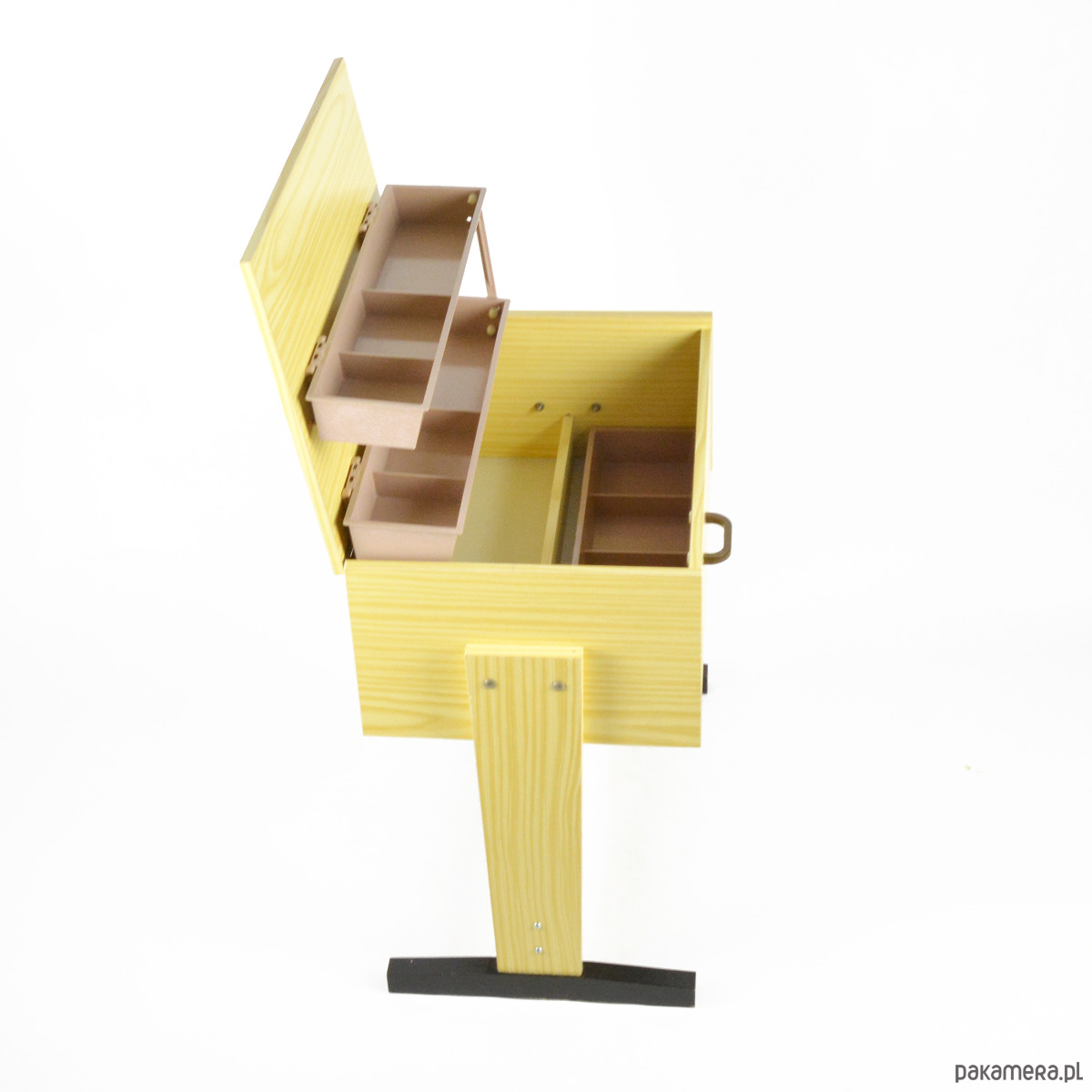 Szafka nocna lub niciak z lat 70. produkcji niemieckiej. Szafka z wiekiem otwieranym do góry w środku przybornik pod skrzynią z przybornikiem. Skrzynia wykonana z płyty meblowej wykończona okleiną imitującą drewno, nogi proste zakończone czarnymi płozami z masywu bukowego. stanowią stelaż mebla. Stolik w stanie oryginalnym dobrym, nosi normalne ślady użytkowania.