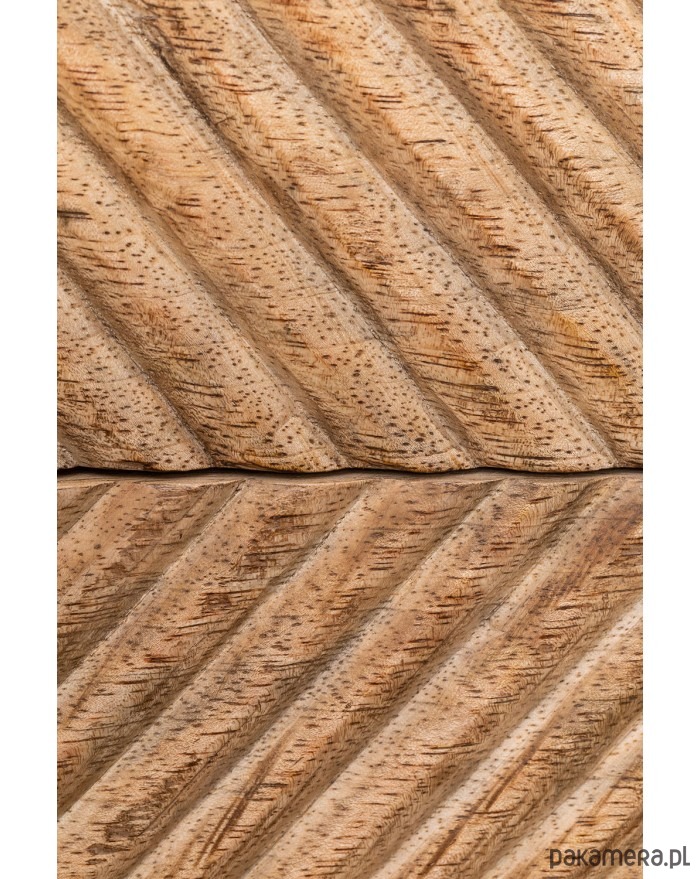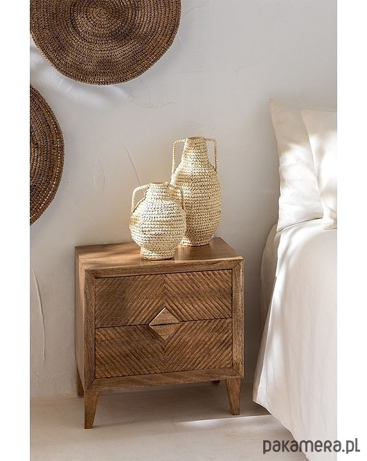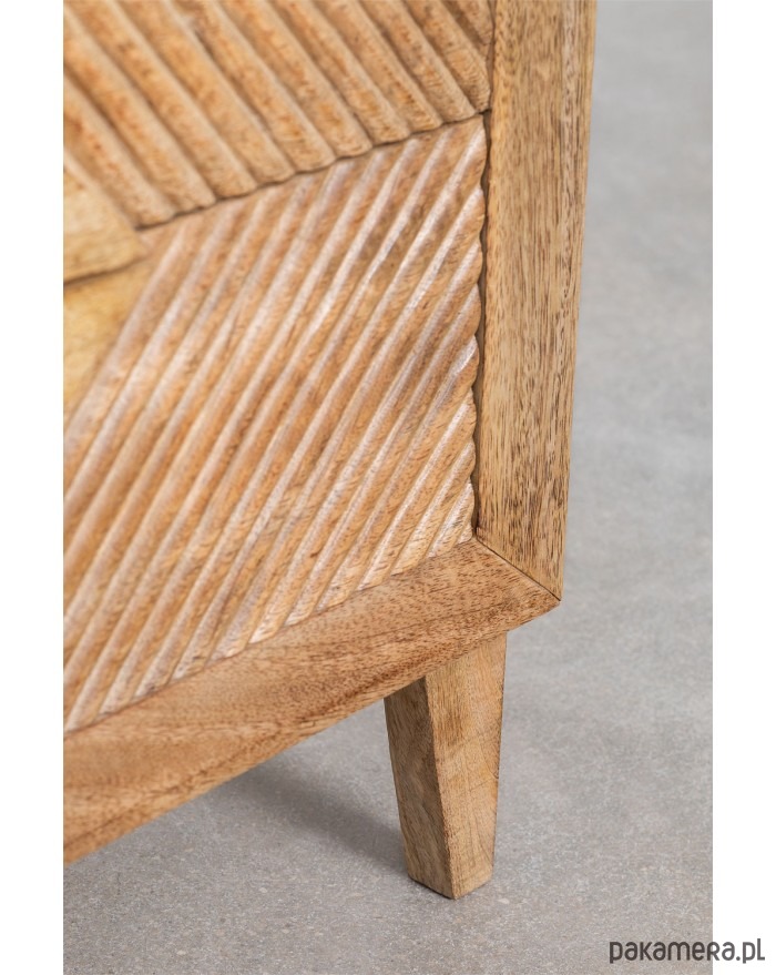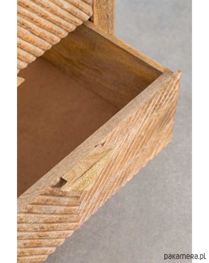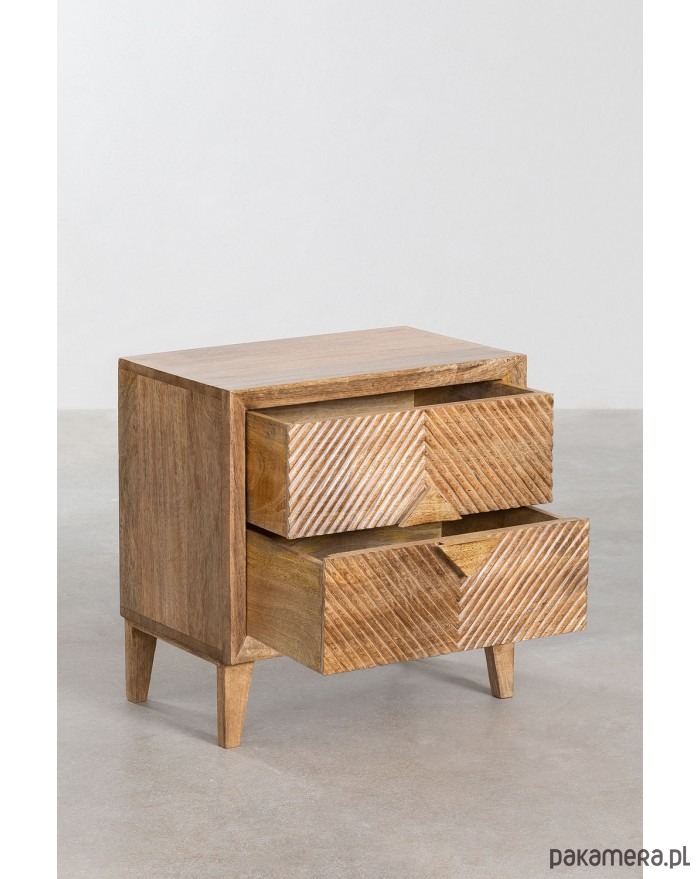 Stolik nocny wykonany z drewna mango oraz MDF. Solidny i odporny na uszkodzenia. Posiada subtelny charakter dzięki ręcznym rzeźbieniom tworzące geometryczny wzór. Posiada dwie szuflady.