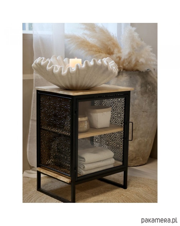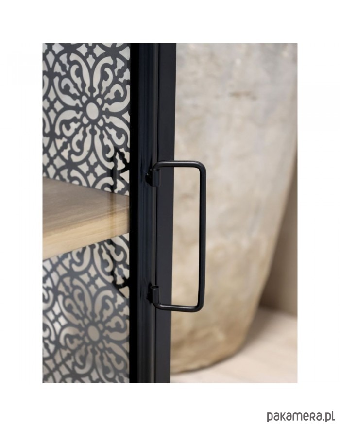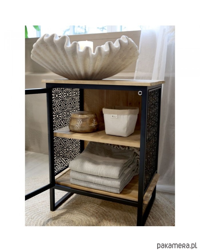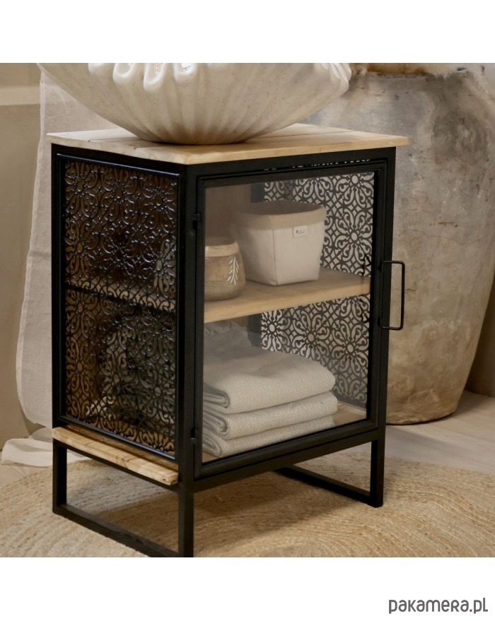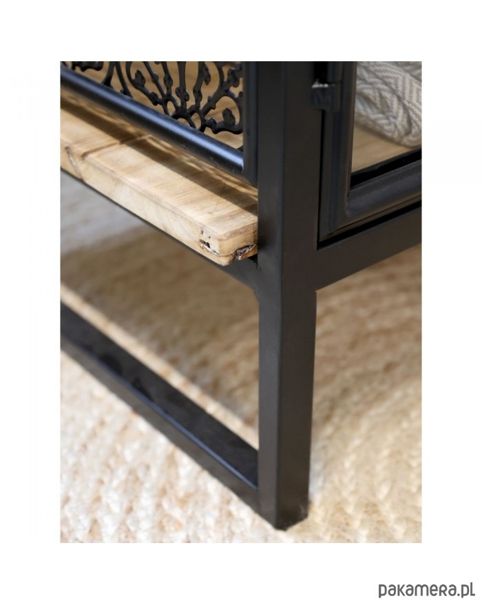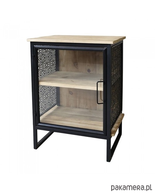 Bardzo ciekawa szafka nocna wykonana z metalu malowanego proszkowo na kolor czarny. Boczne ściany mają piękne, ażurowe wycięcie. Drzwi przeszklone. Wewnątrz półki wykonane z drewna jodłowego.
