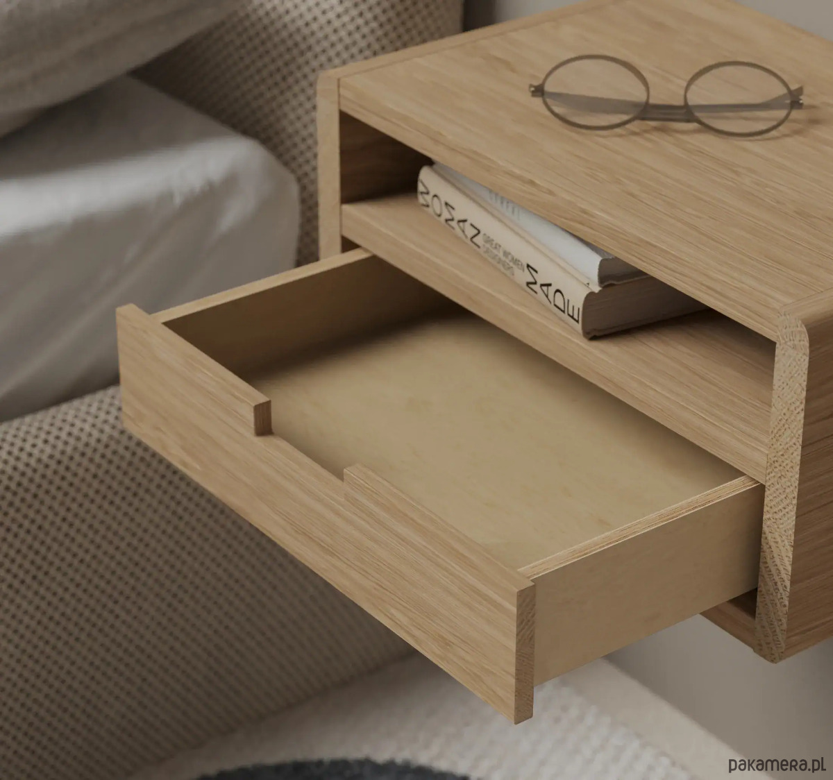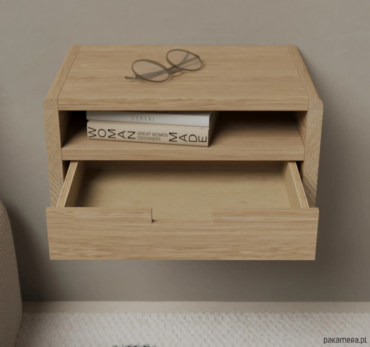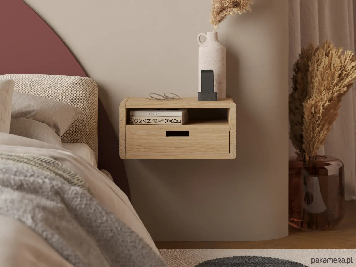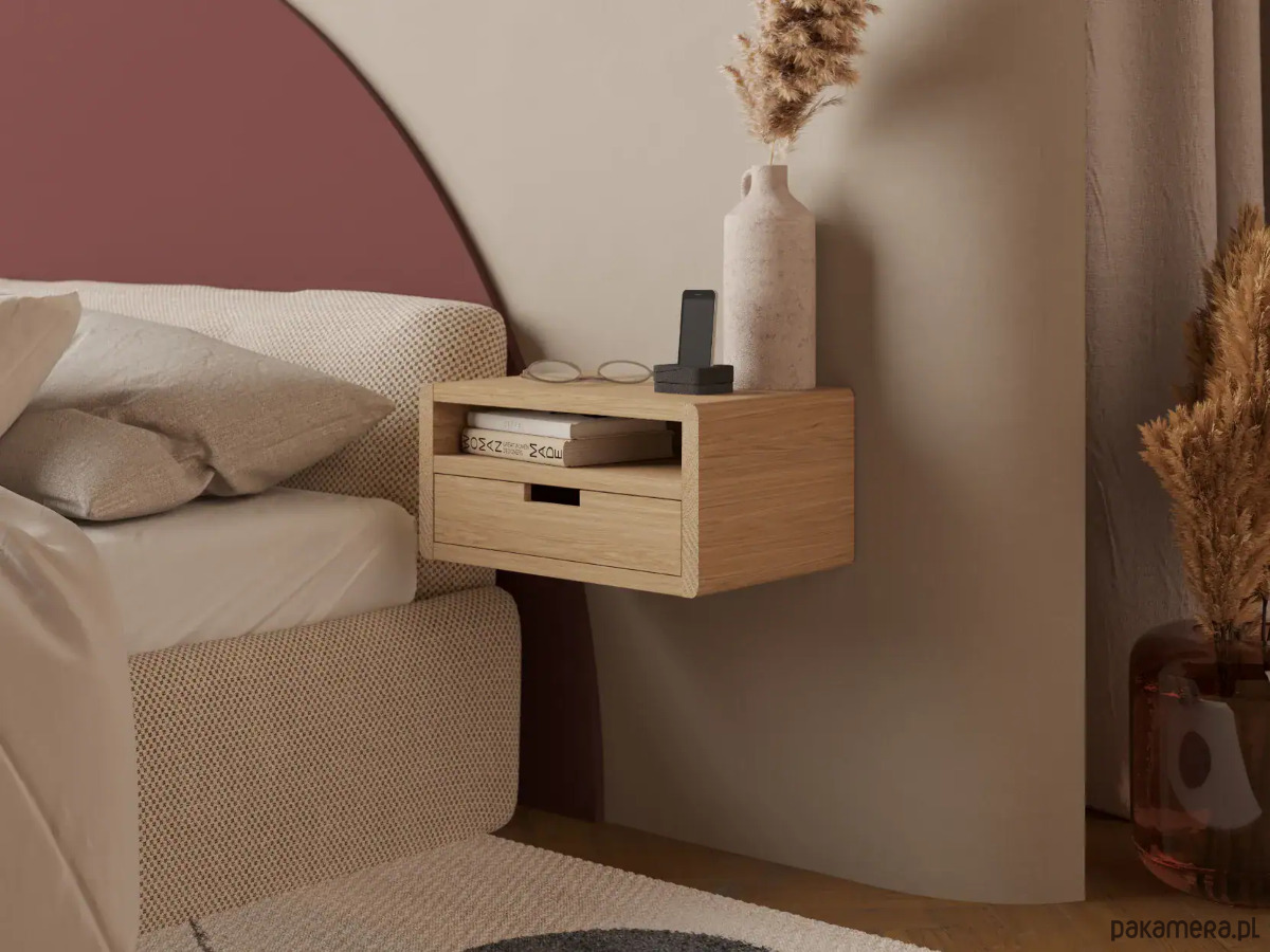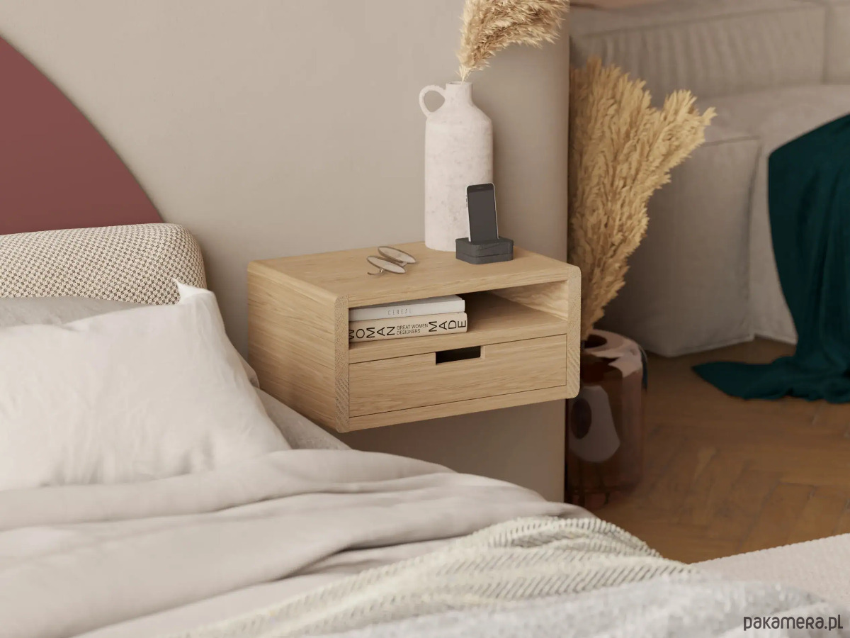 Podwieszana drewniana szafka nocna z litego dębu to elegancki i funkcjonalny dodatek do nowoczesnej sypialni. Zaokrąglone boki i minimalistyczny design podkreślają styl, a solidne wykonanie gwarantuje trwałość na lata.