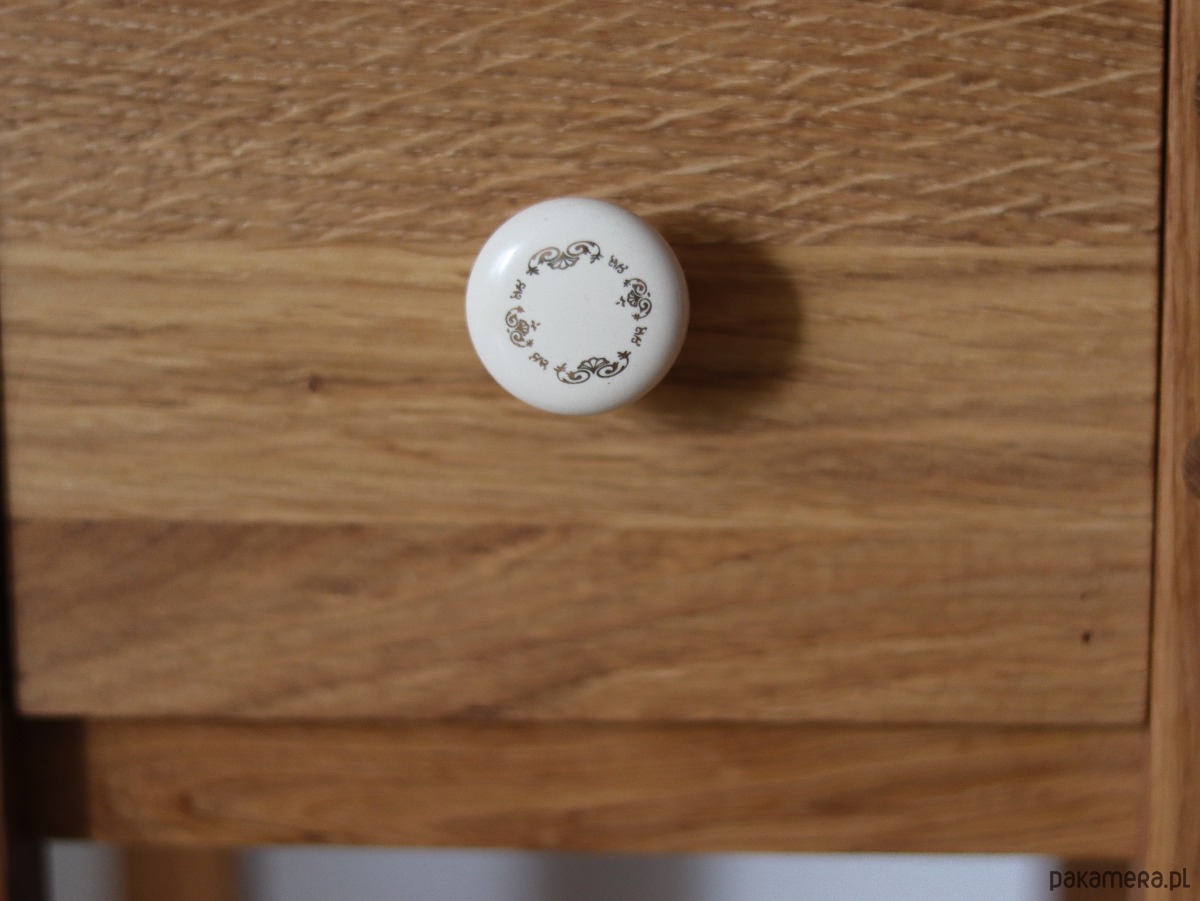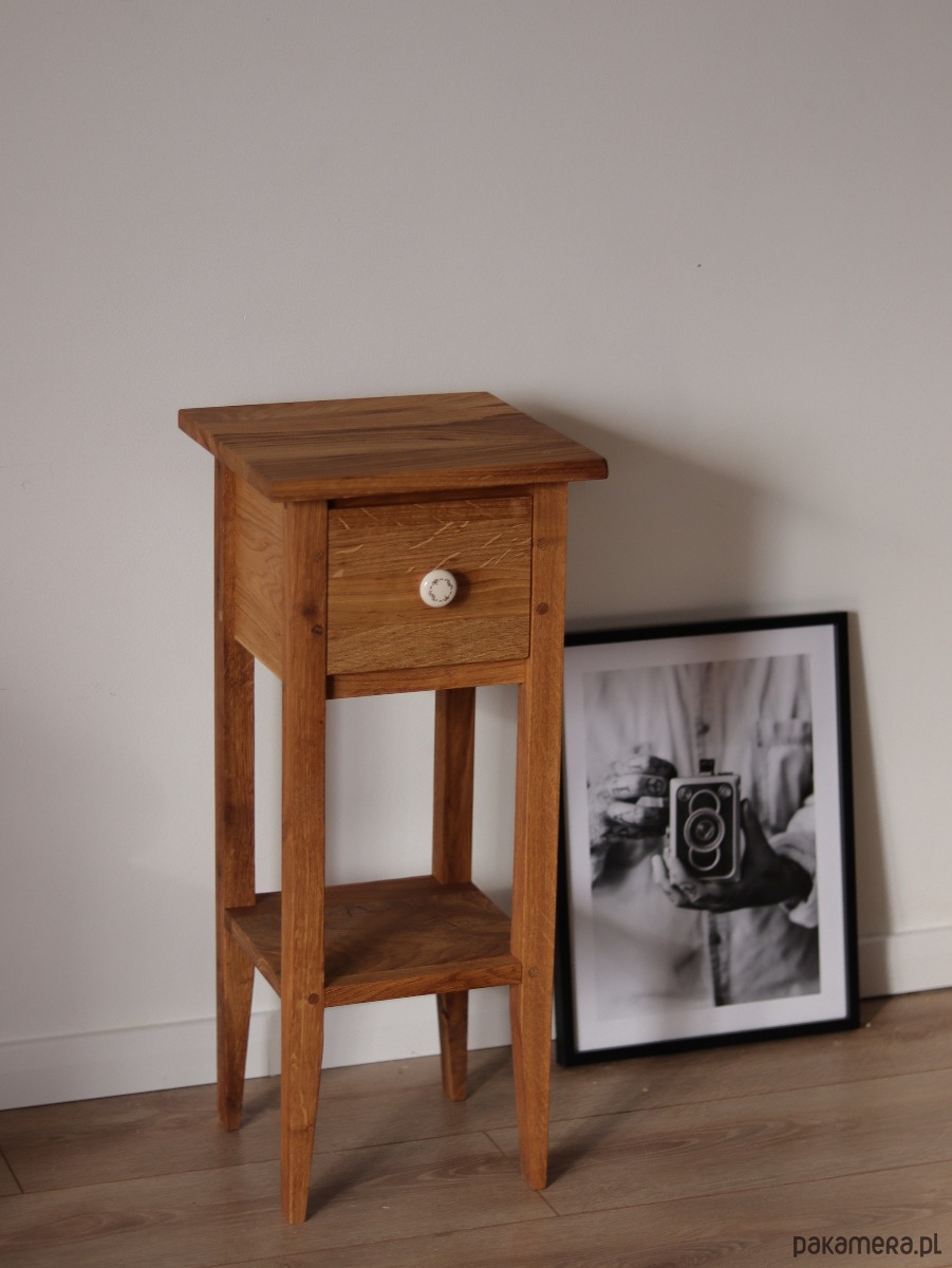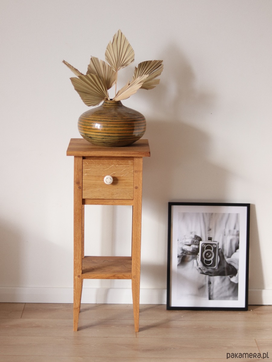 Wysoki stolik z szufladą wykończoną ozdobną gałką i półeczką, jest niezwykle funkcjonalny i estetyczny.