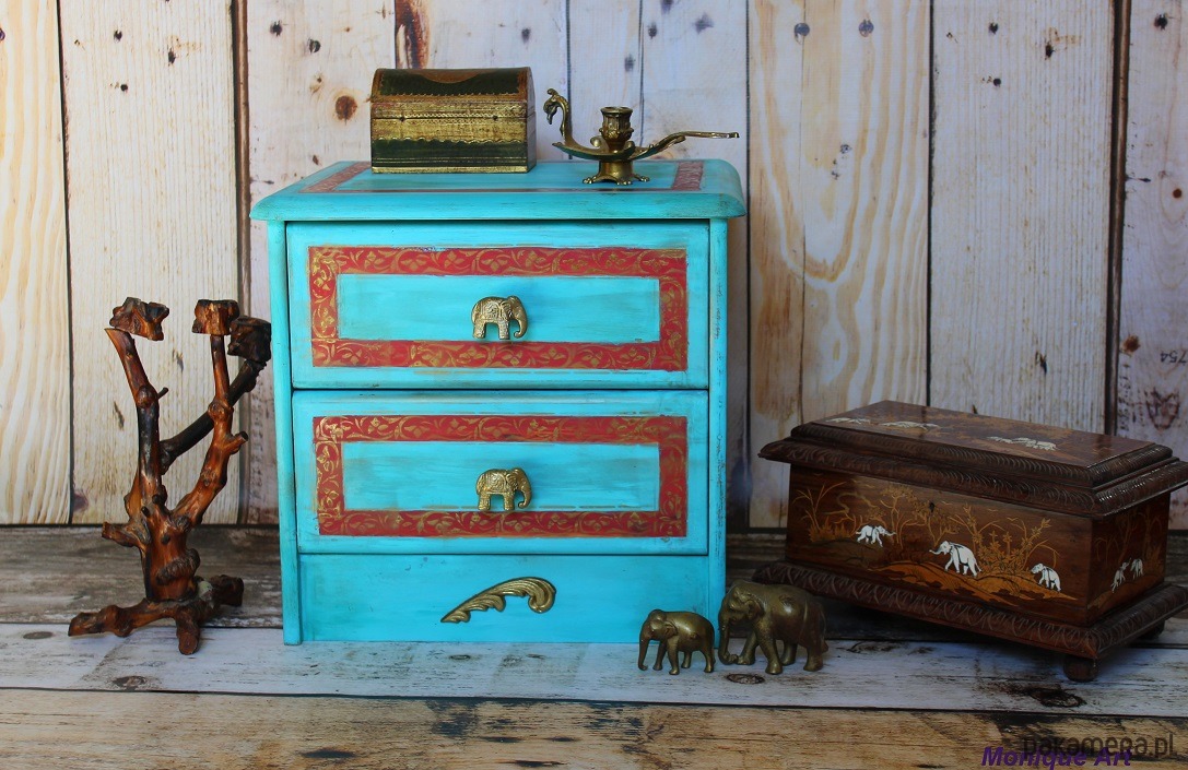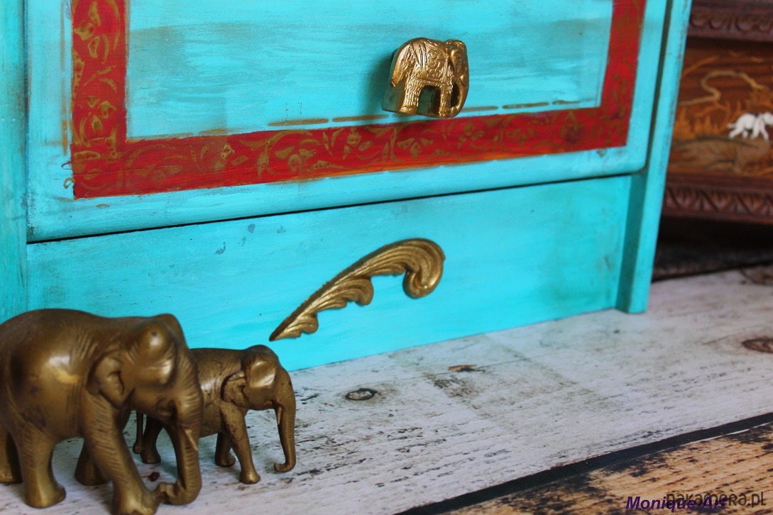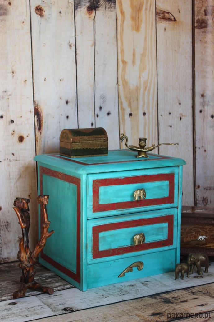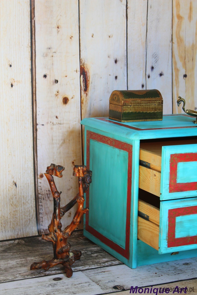 W sprzedaży odnowiona, drewniana szafka ozdobiona przy pomocy farb kredowych w kolorze turkusu i czerwieni. Zabezpieczona woskiem. Dużym atutem są gałki w kształcie słonia oraz ciekawa kolorystyka. Miejscami widoczne delikatne przetarcia i cieniowania (przy pomocy wosku postarzającego )mające na celu podkreślić niepowtarzalność szafki. Szafka jest stylizowana w stylu shabby chic.