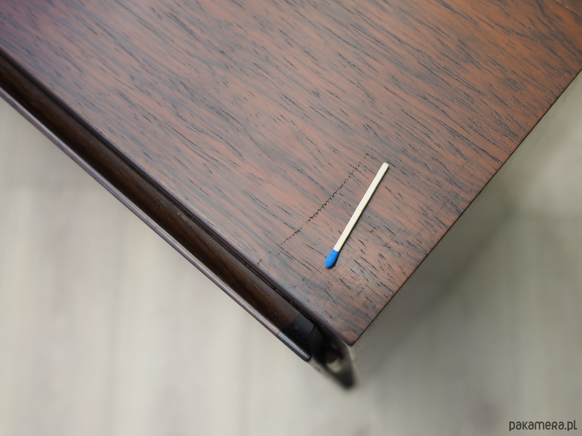 Konstrukcja pokryta jest fornirem palisandrowym. Nogi wykonane z litego drewna wybarwionego na kolor czarny. Powierzchnia po odświeżeniu. Wewnątrz przestrzeń została wypełniona czterema praktycznymi półkami z możliwością regulacji wysokości. Szafka z klasycznym rozwiązaniem drzwi otwieranych, dzięki czemu mamy wygodny dostęp do całego wnętrza.