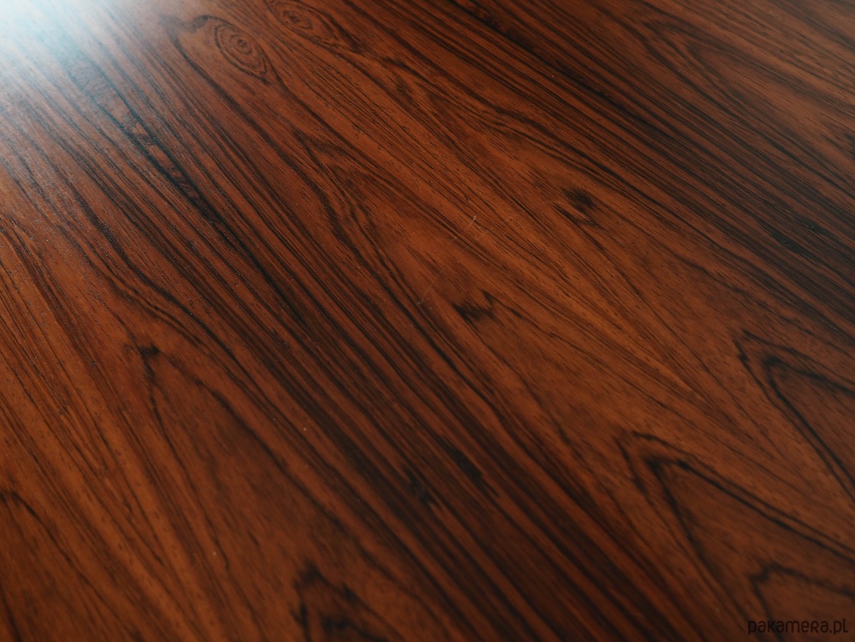 Konstrukcja pokryta jest fornirem palisandrowym. Nogi wykonane z litego drewna wybarwionego na kolor czarny. Powierzchnia po odświeżeniu. Wewnątrz przestrzeń została wypełniona praktyczną półką z możliwością regulacji wysokości. Szafka z klasycznym rozwiązaniem drzwi otwieranych, dzięki czemu mamy wygodny dostęp do całego wnętrza mebla.
