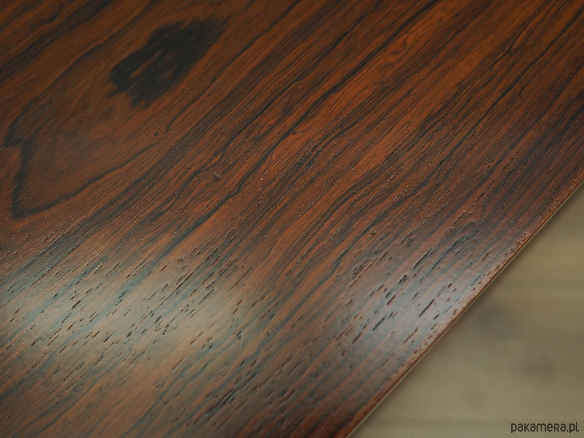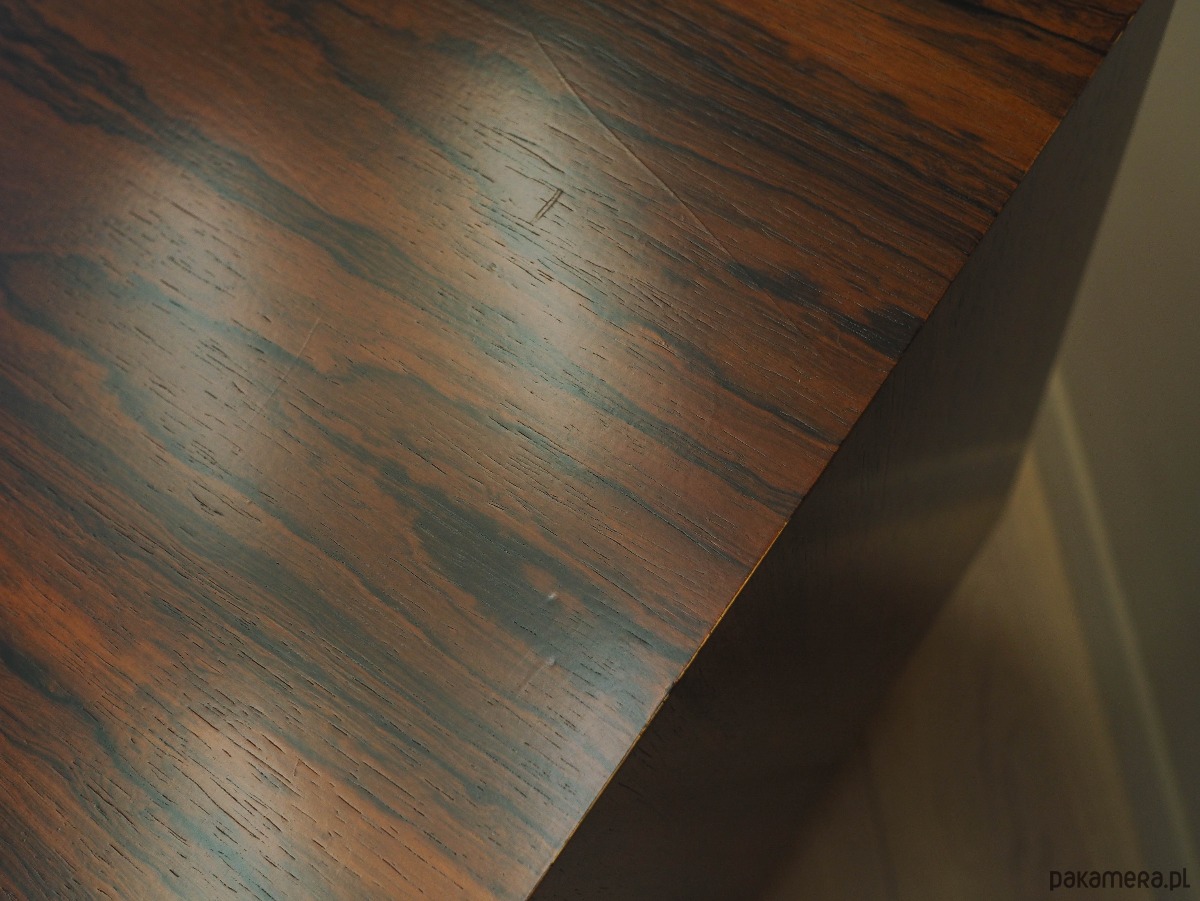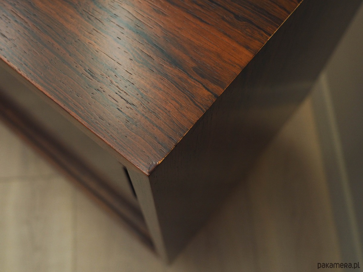 Konstrukcja pokryta jest fornirem palisandrowym. Nogi wykonane z litego drewna. Powierzchnia po odświeżeniu. Wewnątrz przestrzeń została wypełniona dwiema regulowanymi półkami. Szafka posiada praktyczne rozwiązanie drzwi przesuwnych, dzięki czemu ograniczamy konieczność pozostawienia dużej wolnej przestrzeni przed meblem, jednocześnie nie ograniczając sobie dostępu do jego wnętrza. Ponadto przesuwne drzwi są idealnym rozwiązaniem, aby wykorzystać mebel pod sprzęt audio.