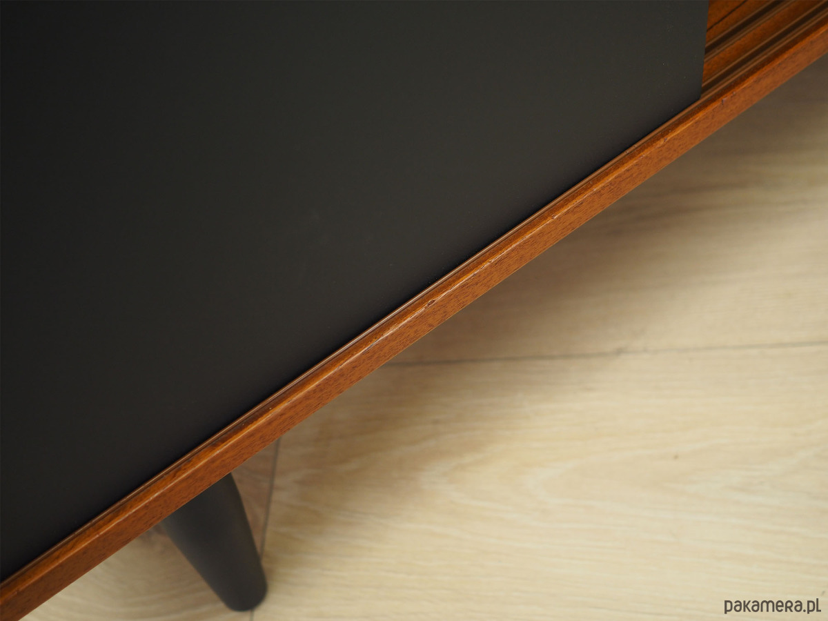 Konstrukcja pokryta jest fornirem tekowym. Nogi wykonane są z litego drewna wybarwionego na kolor czarny. Powierzchnia po odświeżeniu. Wewnątrz przestrzeń została wypełniona półką z możliwością regulacji wysokości. Mebel posiada praktyczne rozwiązanie drzwi przesuwnych, dzięki czemu ograniczamy konieczność pozostawienia dużo wolnej przestrzeni przed meblem, jednocześnie nie ograniczając sobie dostępu do jego wnętrza. Ponadto przesuwne drzwi są idealnym rozwiązaniem, aby wykorzystać mebel pod sprzęt audio.