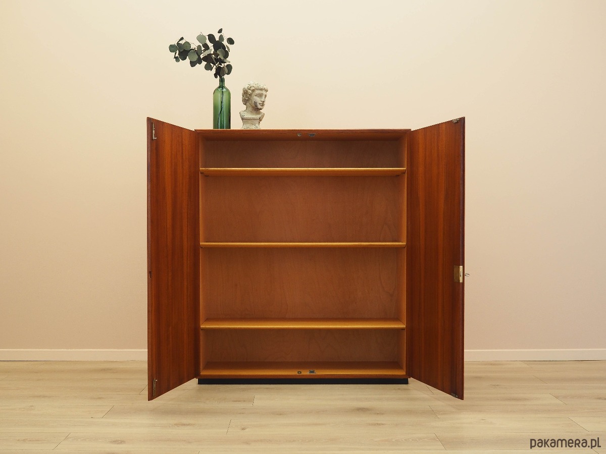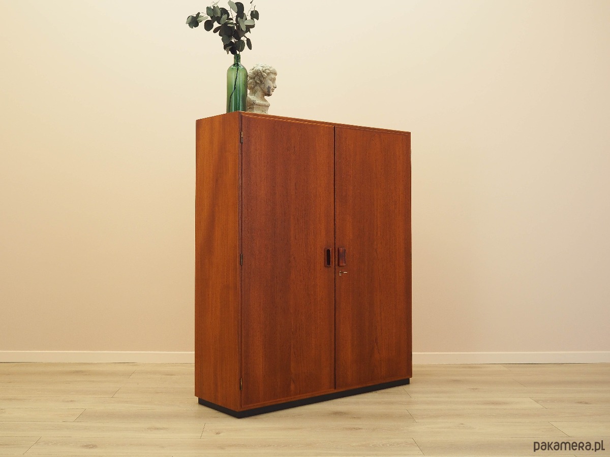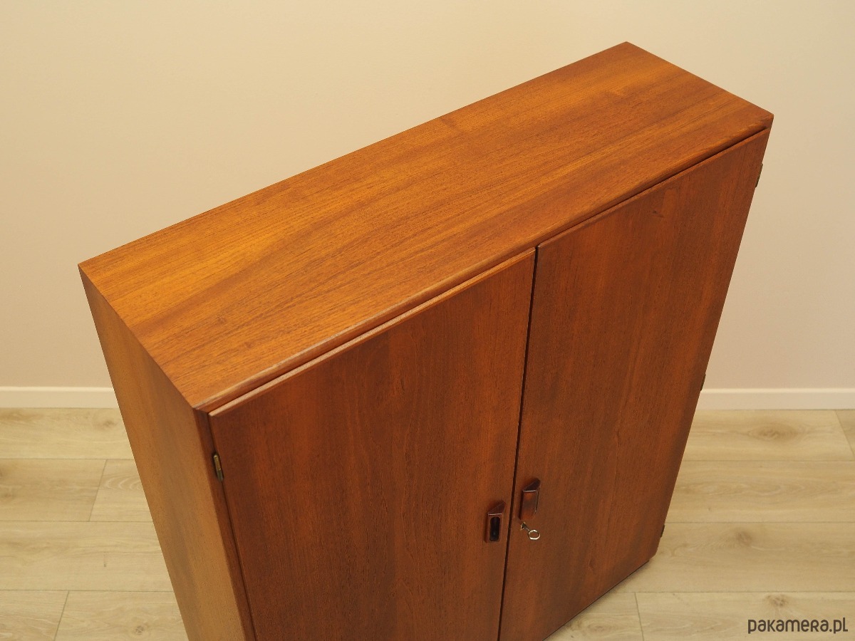 Konstrukcja pokryta jest fornirem tekowym. Mebel umieszczony został na drewnianym cokole. Powierzchnia po odświeżeniu. Wewnątrz przestrzeń została wypełniona trzema praktycznymi półkami z możliwością regulacji wysokości. Szafka z klasycznym rozwiązaniem otwieranych drzwi, dzięki którym mamy swobodny dostęp do całego wnętrza mebla. Klucz w zestawie.