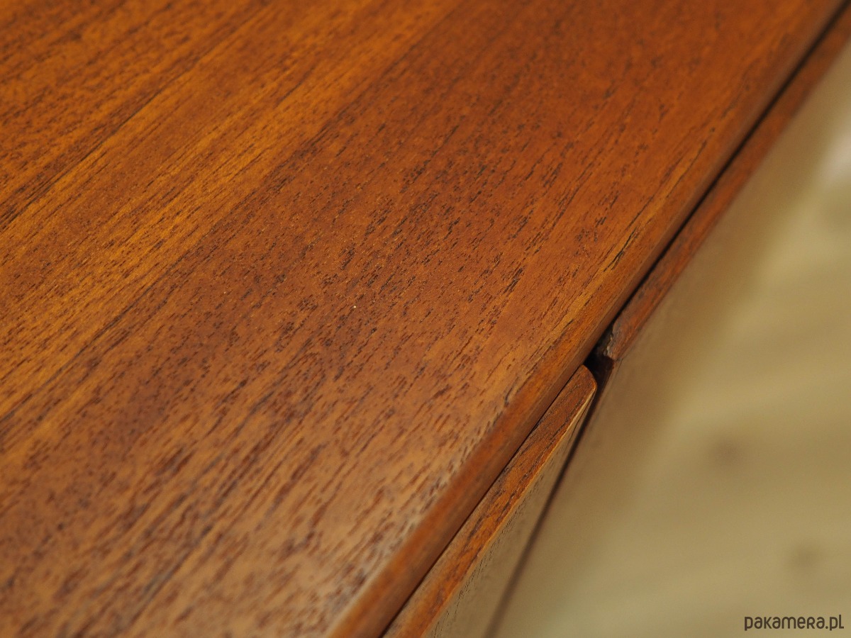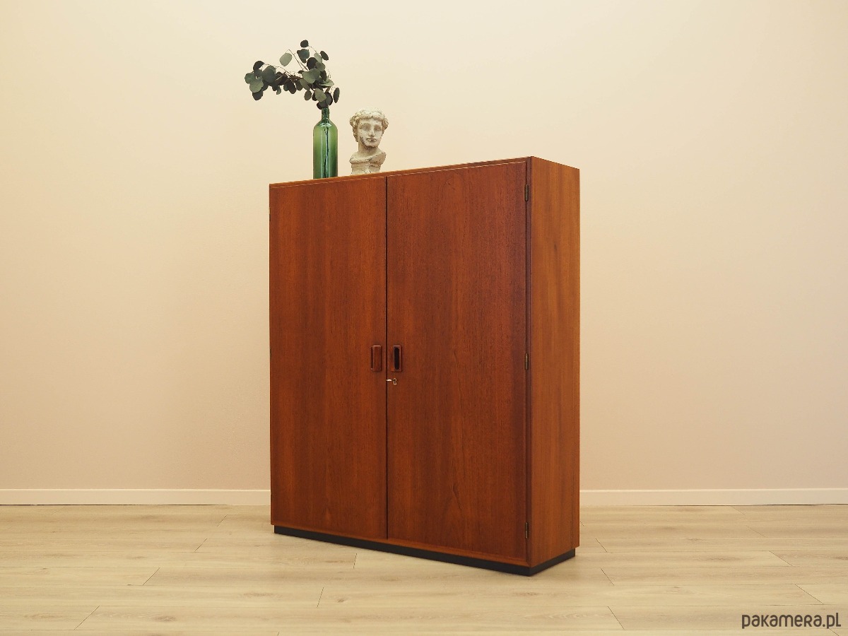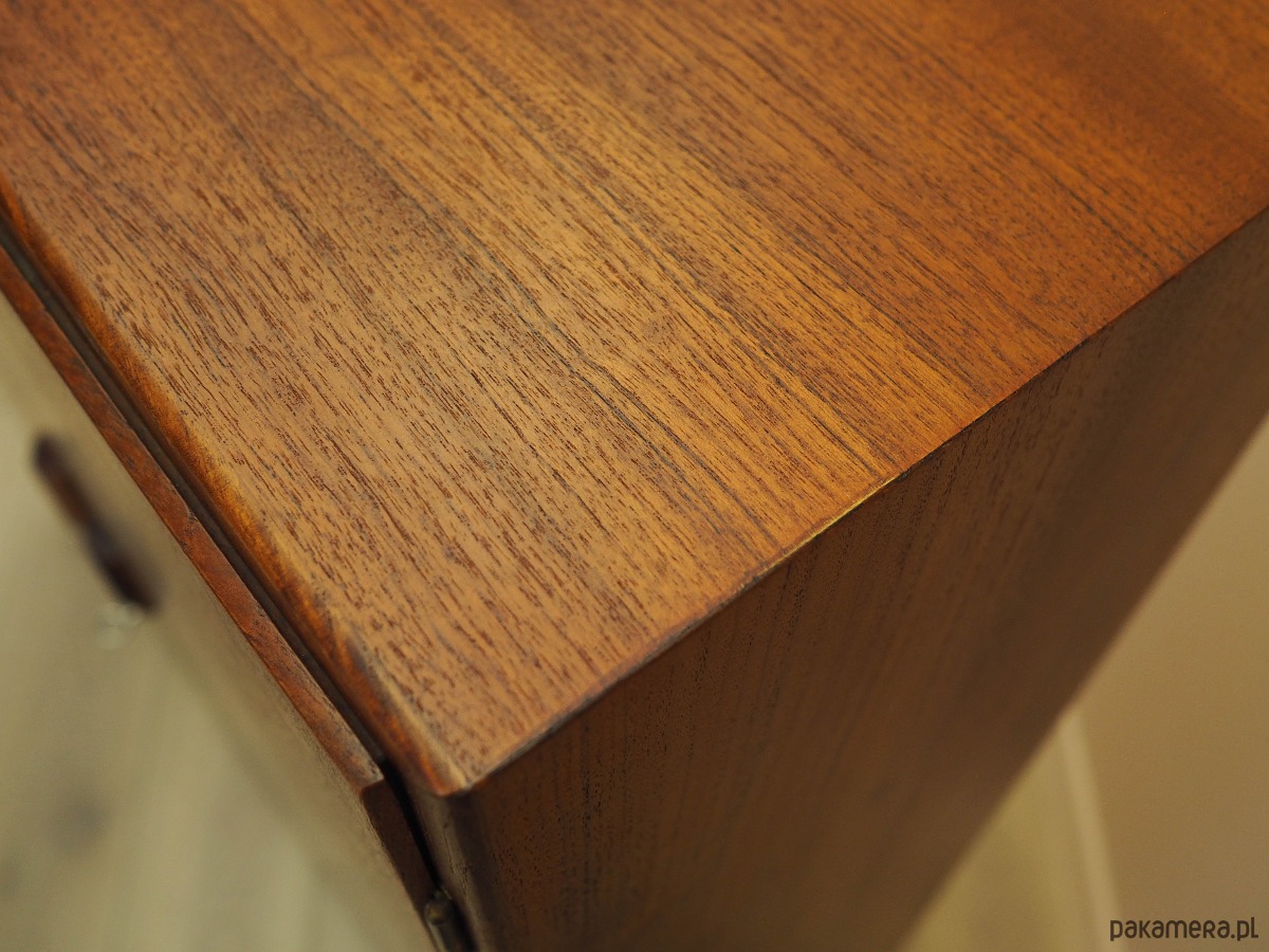 Konstrukcja pokryta jest fornirem tekowym. Mebel umieszczony został na drewnianym cokole. Powierzchnia po odświeżeniu. Wewnątrz przestrzeń została wypełniona trzema praktycznymi półkami z możliwością regulacji wysokości. Szafka z klasycznym rozwiązaniem otwieranych drzwi, dzięki którym mamy swobodny dostęp do całego wnętrza mebla. Klucz w zestawie.