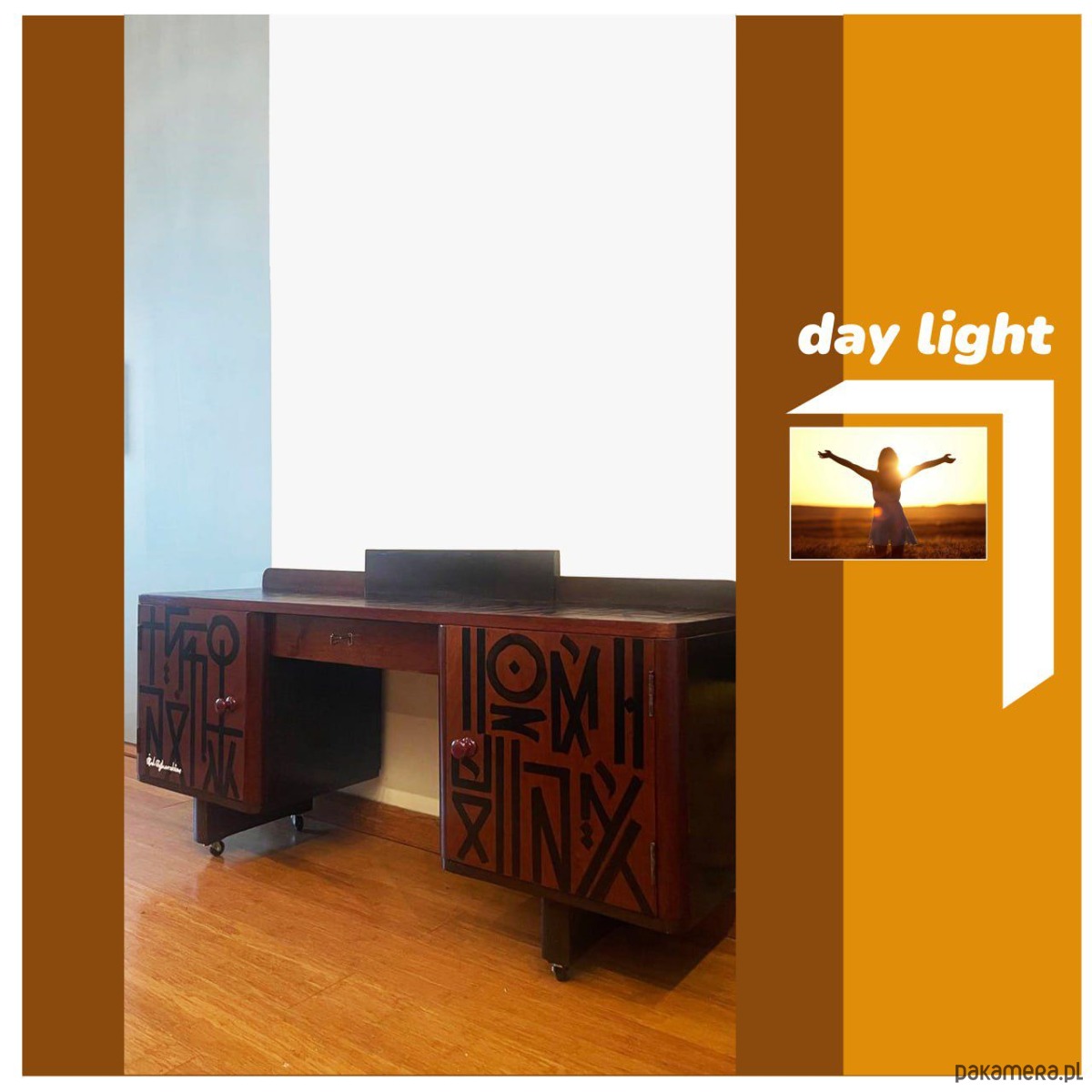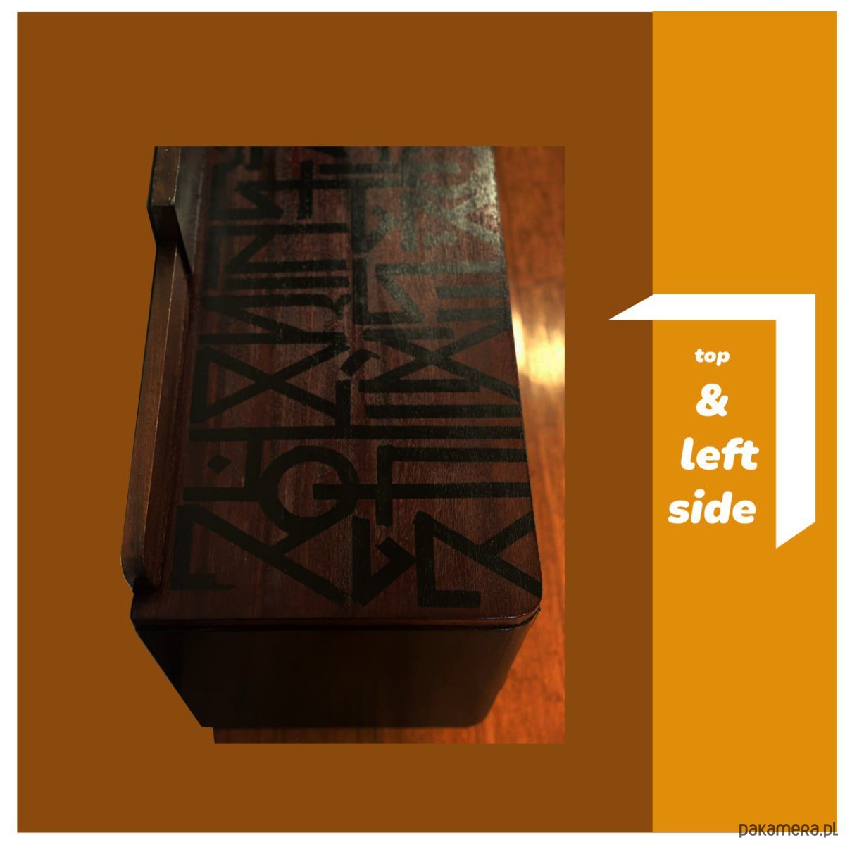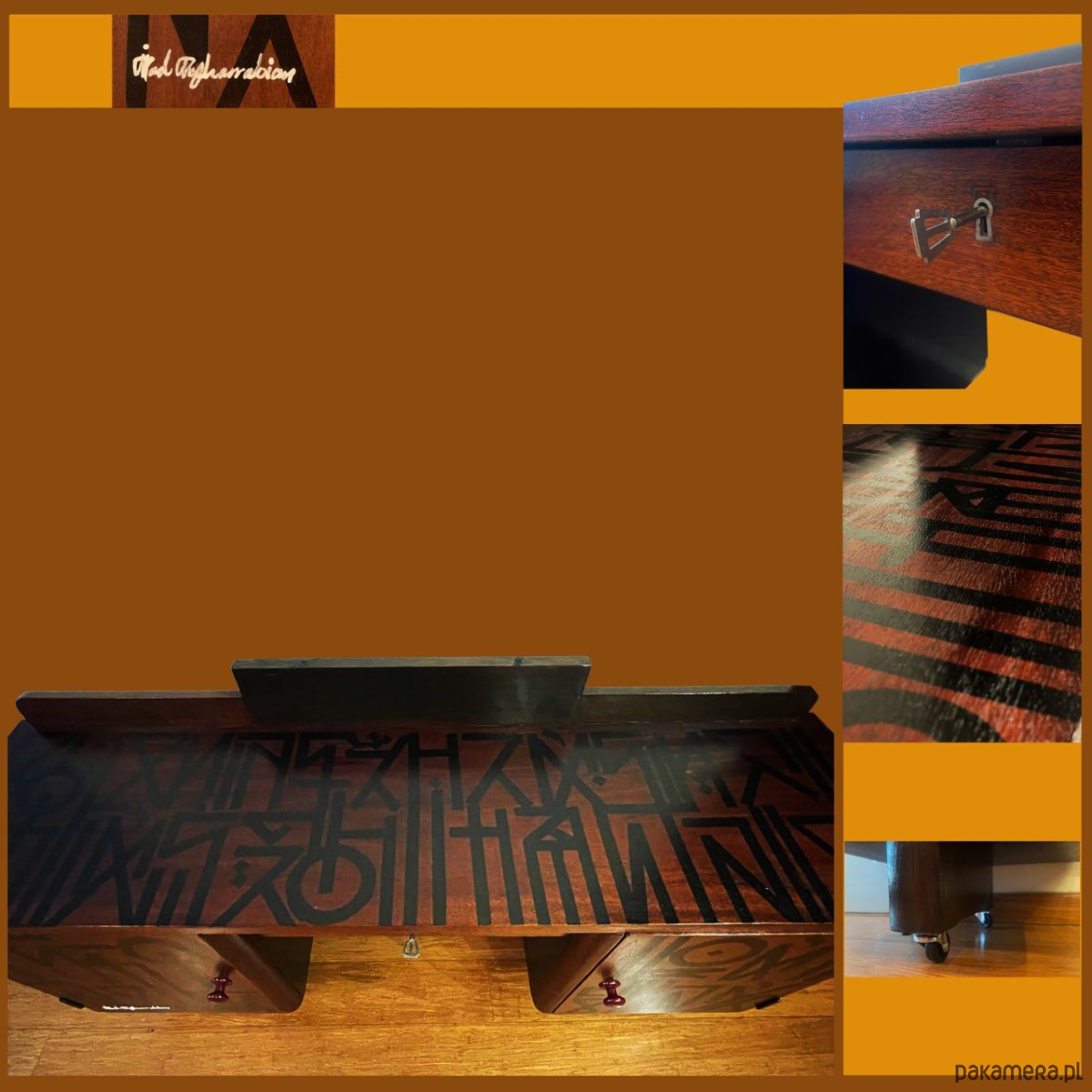 Powierzchnia została ozdobiona unikalnym, autorskim alfabetem stworzonym przez artystę i rozwijanym przez ponad dziesięć lat. Każdy znak został zaprojektowany indywidualnie i opiera się na złożonym algorytmie. Klucz do odczytania alfabetu nie zostanie ujawniony za życia artysty. Ma zostać opublikowany dopiero po jego śmierci, co nadaje obiektowi charakter dzieła konceptualnego oraz długoterminowej inwestycji artystycznej. Umieszczając ten alfabet na przedmiotach użytkowych, artysta przekształca meble w nośniki zaszyfrowanego znaczenia.