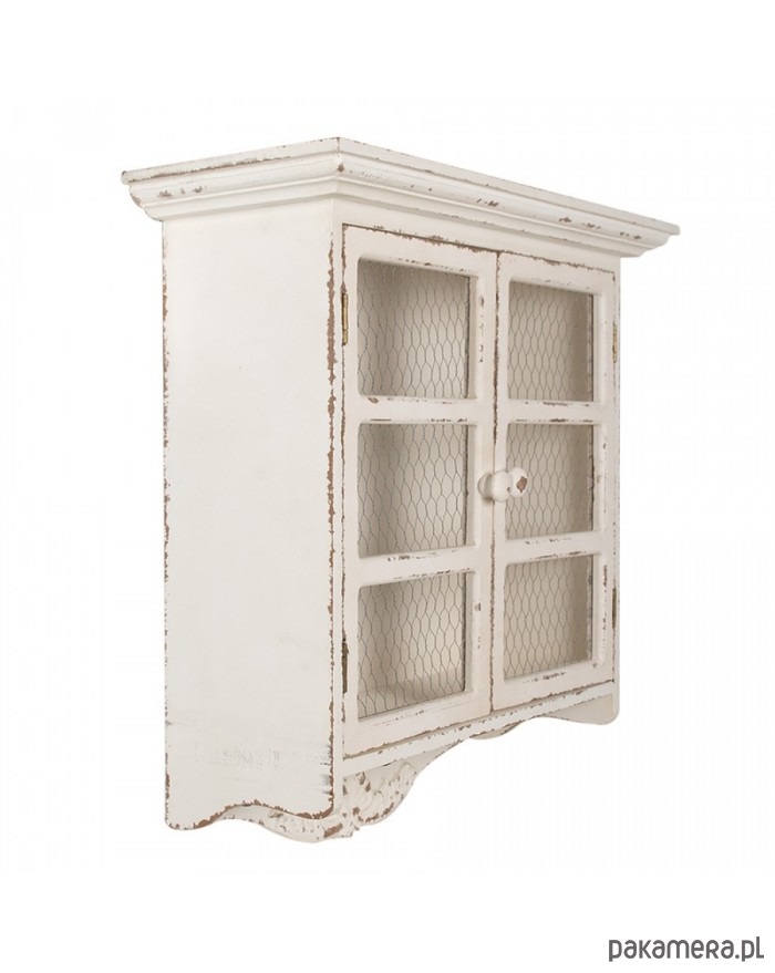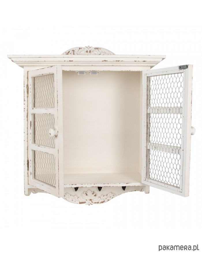 Szafka wisząca wykonana z MDF. W kolorze antycznej bieli. Celowo postarzana. Na drzwiach druciana siatka. W dolnej części posiada haczyki.