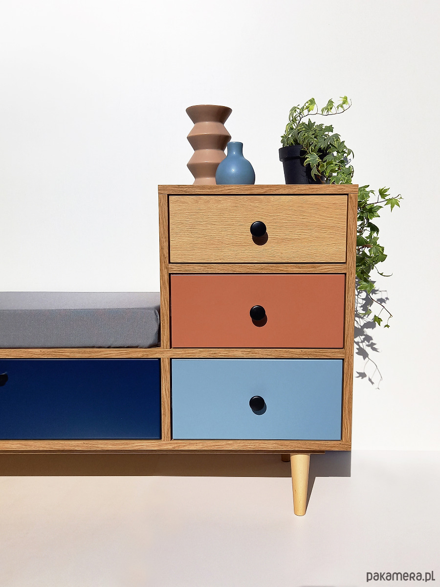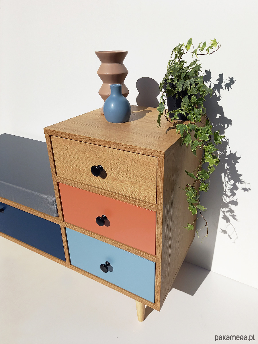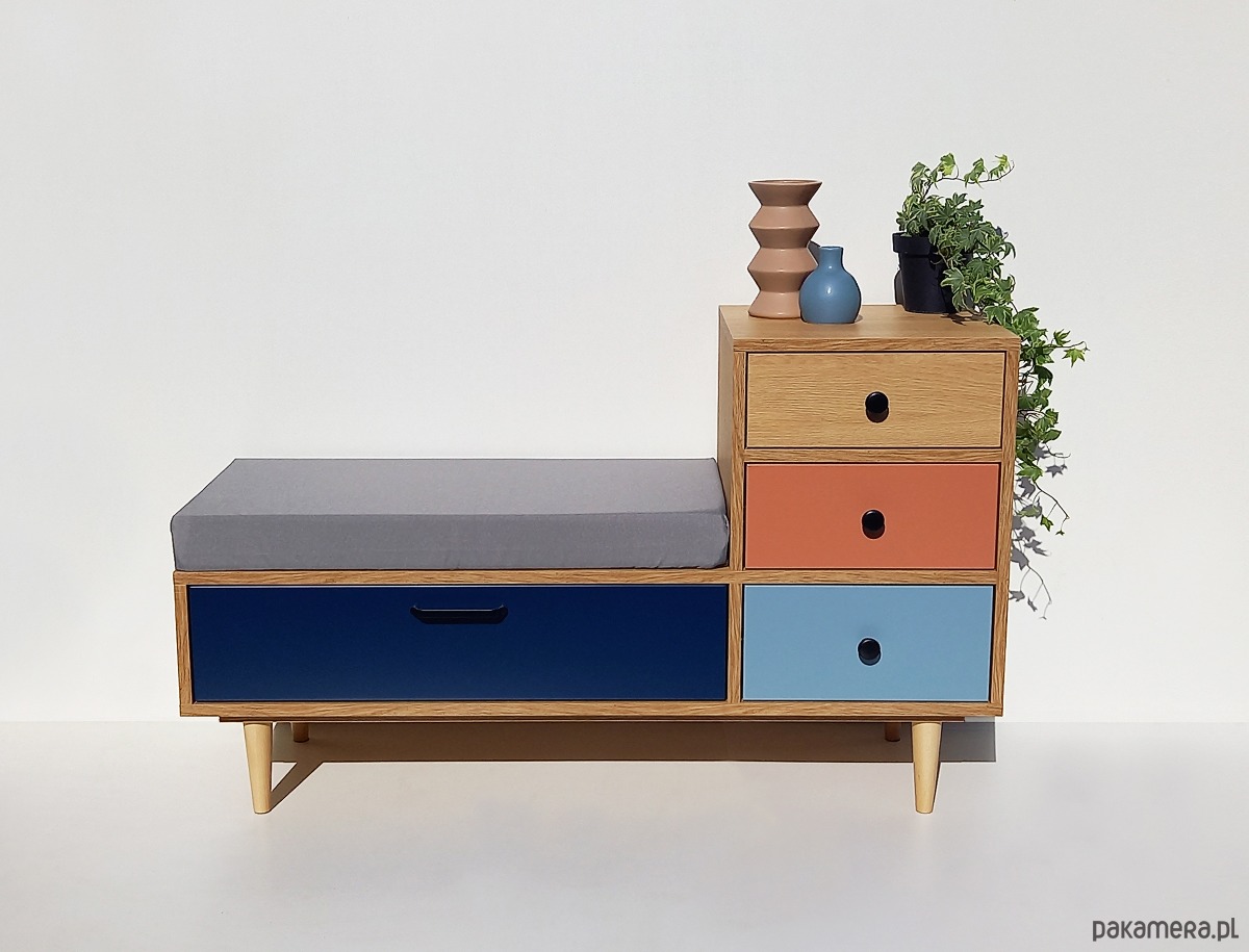 Posiada trzy wygodne szuflady oraz pojemną szafkę z frontem uchylnym (pod siedziskiem).