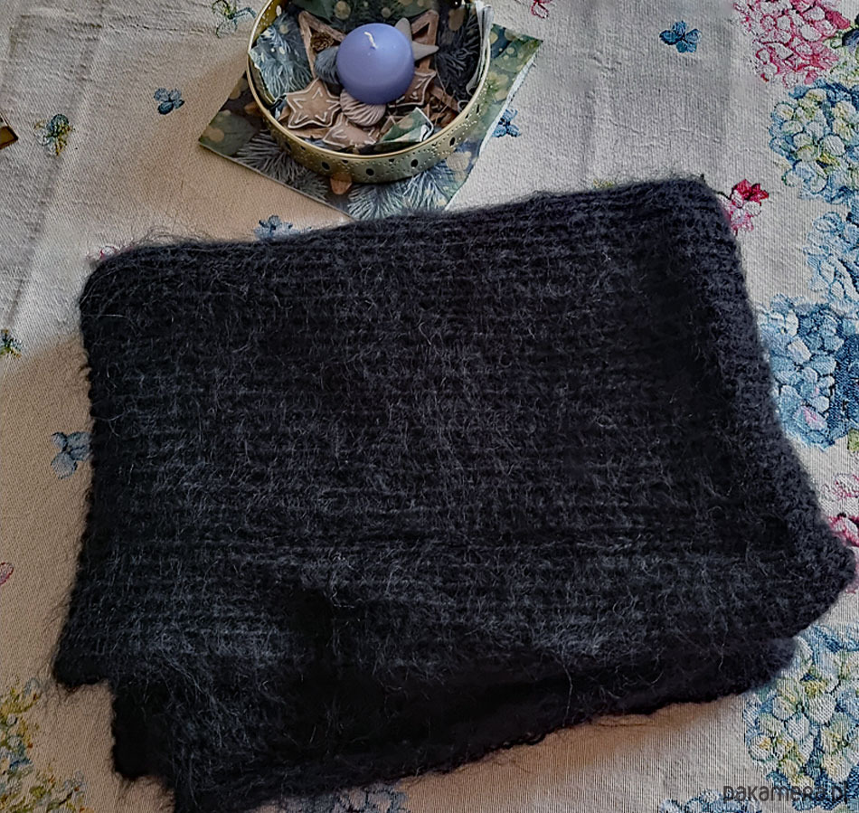 Szal z bardzo ciepłej włóczki moherowej z dodatkiem wełny i akrylu - w odcieniu pięknej głębokiej czerni… Bardzo elegancki :-).