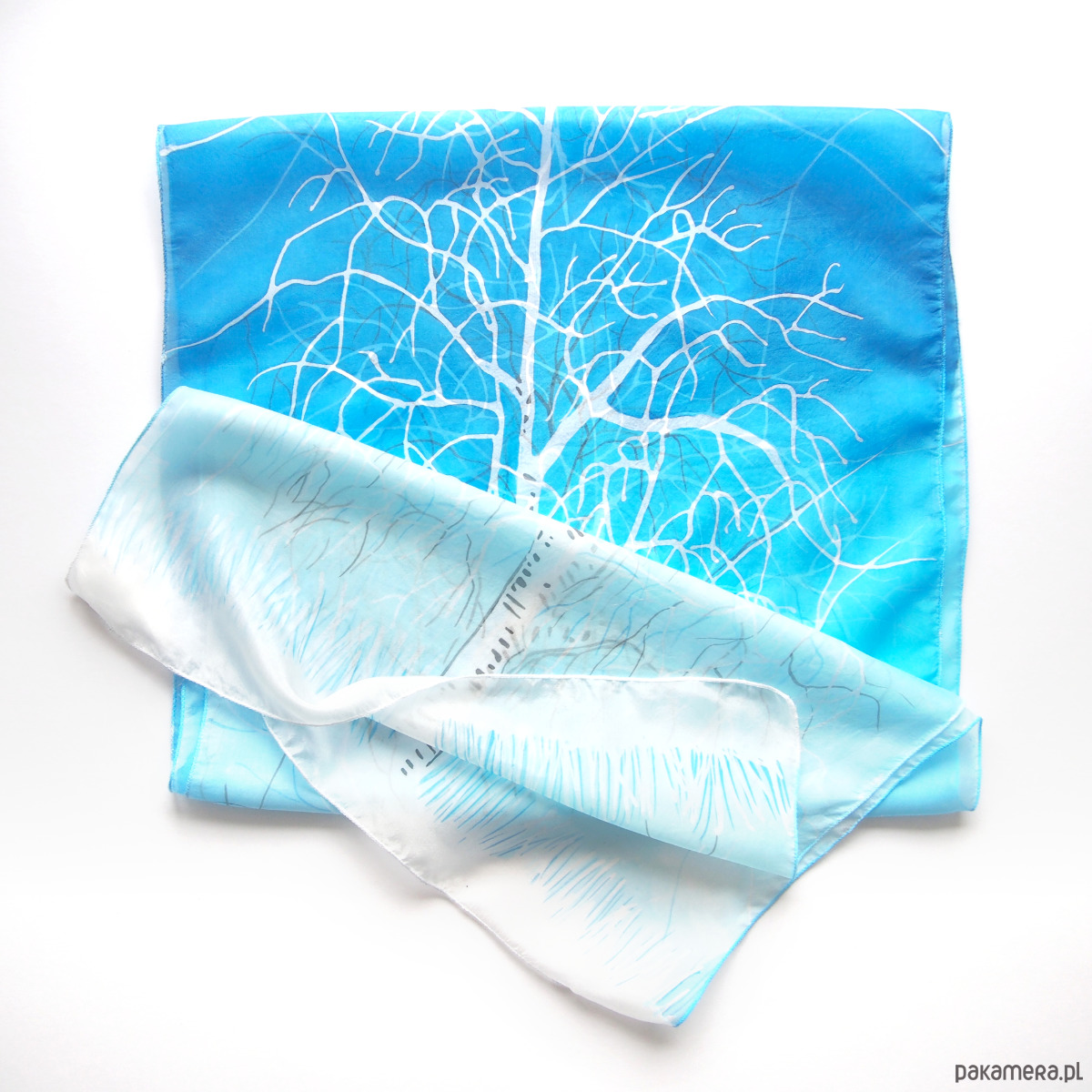 Szal jedwabny, ręcznie malowany z wzorem dwóch drzew brzozy w zimowym krajobrazie.