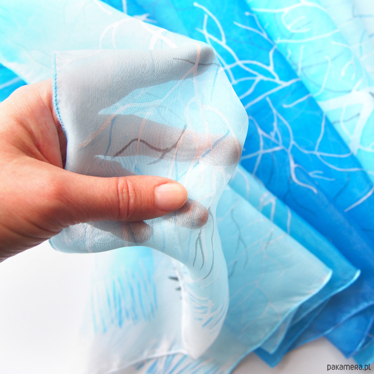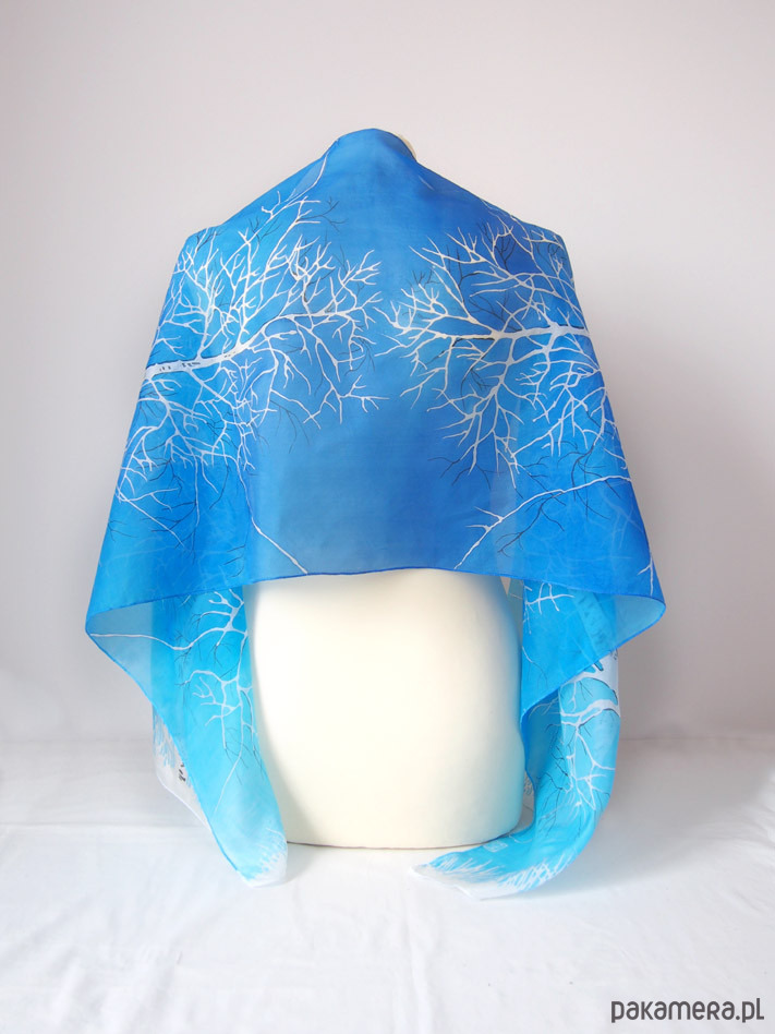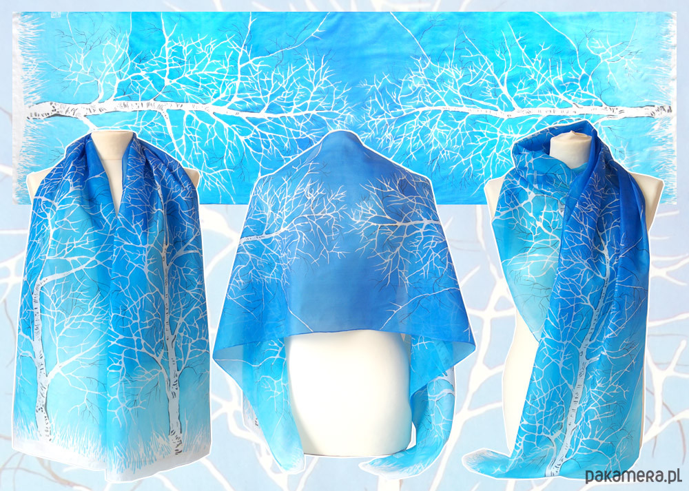 Szal wymaluję dla Ciebie w mocnych odcieniach niebieskiego, mroźnego nieba, na tle którego prezentować się będą dwie białe brzozy. Wzór jest bardzo bogaty, w odcieniach hipnotyzującego, żywego błękitu.