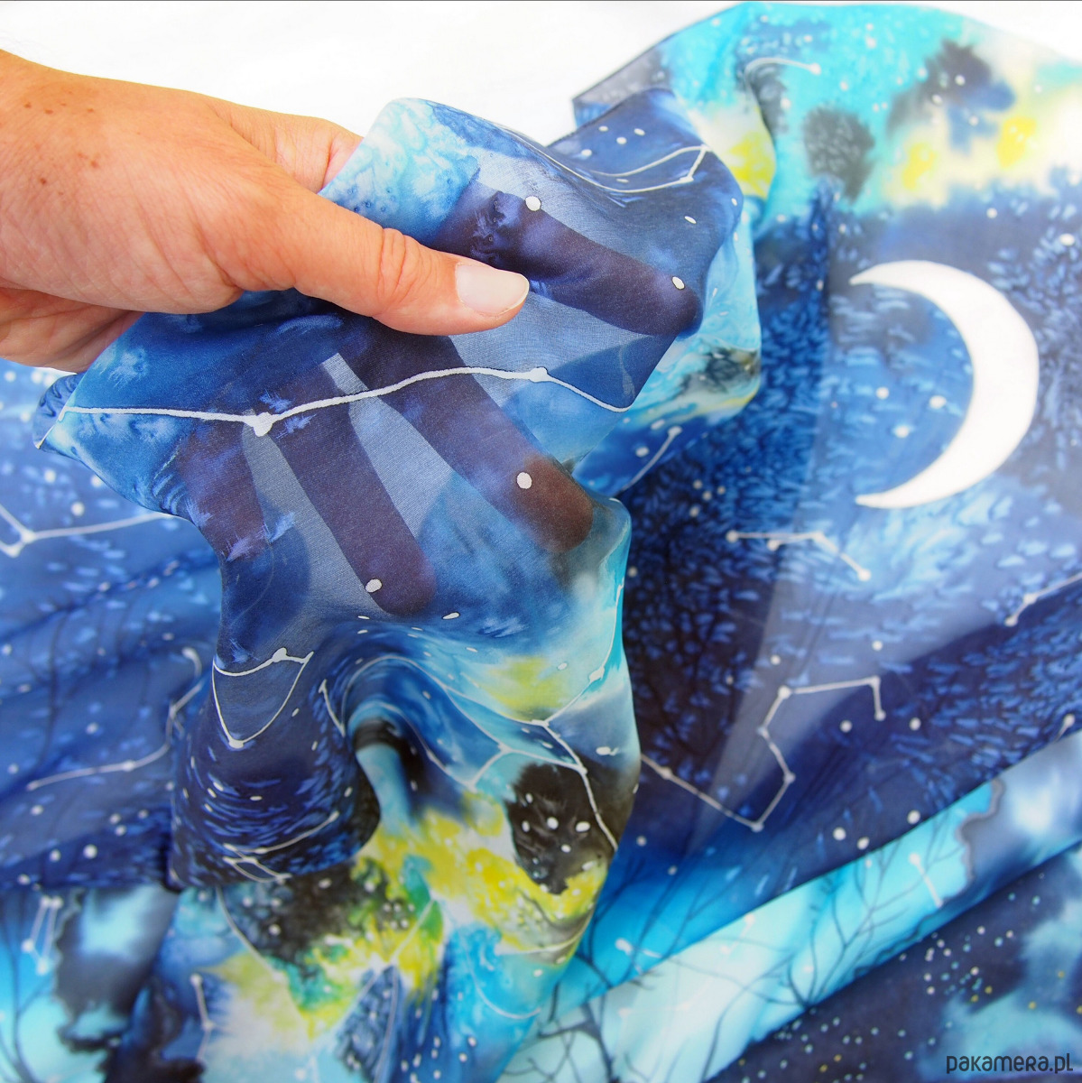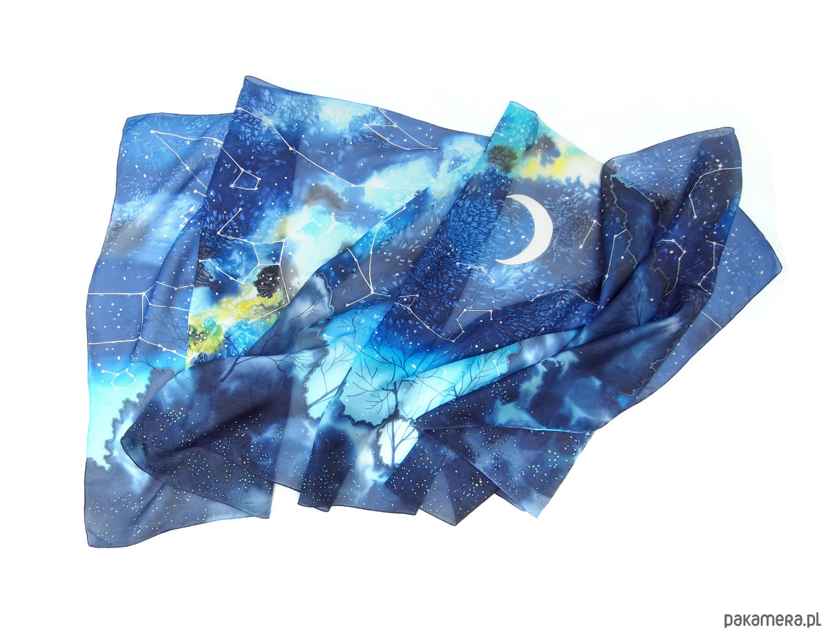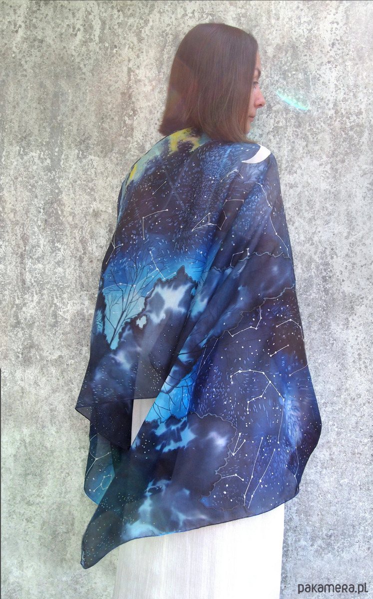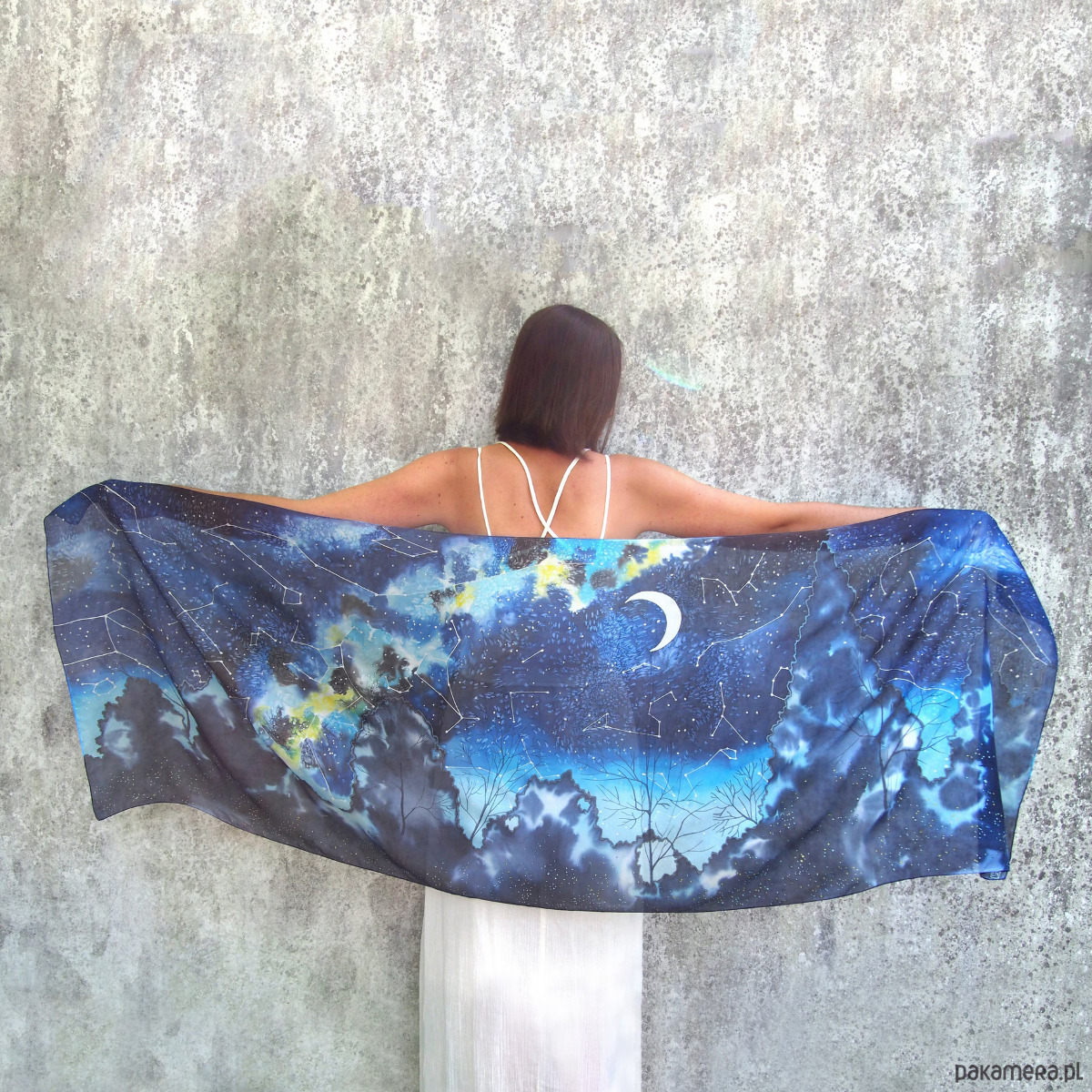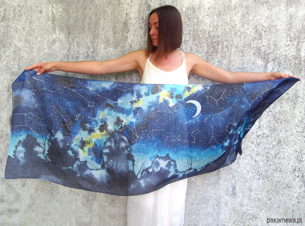 Ogromny szal jedwabny, ręcznie malowany we wzór nocnego krajobrazu z księżycem i Drogą Mleczą.