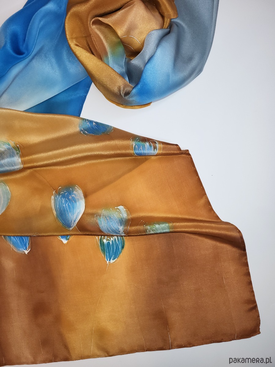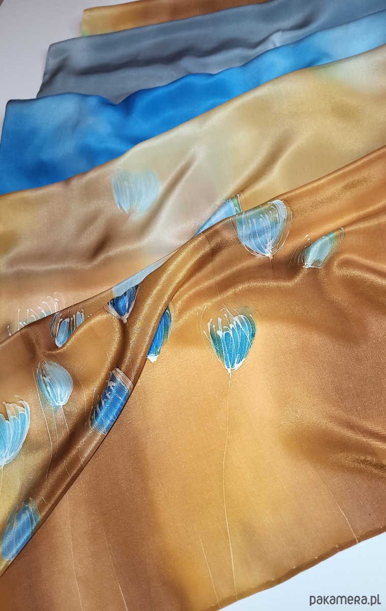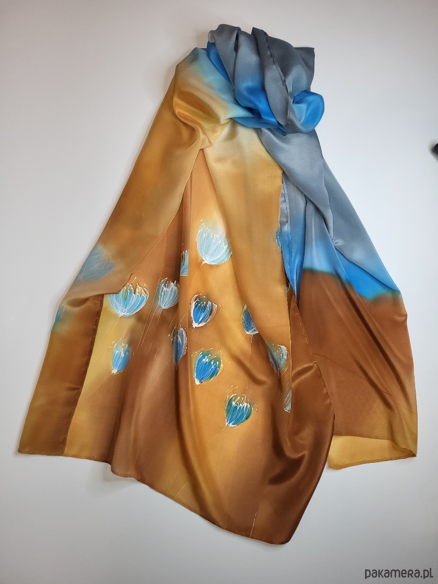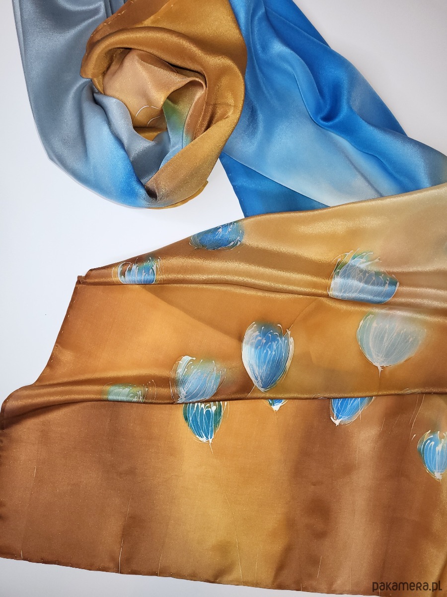 Delikatny, ręcznie malowany szal z wzorem. Naturalny jedwab, doskonały zarówno na jesienne i zimowe chłody, jak i letnie upały. Wymiary pracy to 55x180cm.W szalu dominują błekity i słoneczne beże. Całość namalowana na pięknie lejącej się krepie jedwabnej wysokiej jakości. Praca utrwalana termicznie pod ciśnieniem, praktycznie nie spiera się i nie płowieje, pozwalając cieszyć się pięknem szala przez długie lata. Naturalny jedwab, doskonały zarówno na jesienne i zimowe chłody, jak i letnie upały. Wzór malarski zajmuje około 30% powierzchni szala. Praca opatrzona jest certyfikatem pochodzenia/autentyczności w pięknym opakowaniu, uzupełnionym o przepis prania. Mogę personalizować.