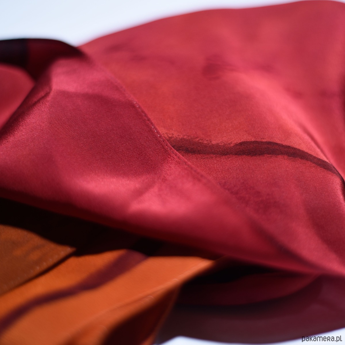 Szale wyróżnia dwustronna grafika, nadająca im wyjątkową głębię i elegancki charakter. Do stworzenia go został wykorzystany 100% naturalny jedwab, starannie dobrany pod względem gęstości i faktury, dzięki czemu materiał pięknie układa się na sylwetce, zachowując trwałość i subtelny połysk.
