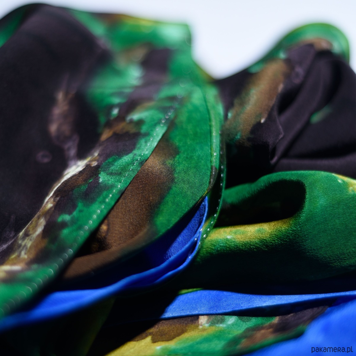Szale wyróżnia dwustronna grafika, nadająca im wyjątkową głębię i elegancki charakter. Do stworzenia go został wykorzystany 100% naturalny jedwab, starannie dobrany pod względem gęstości i faktury, dzięki czemu materiał pięknie układa się na sylwetce, zachowując trwałość i subtelny połysk.
