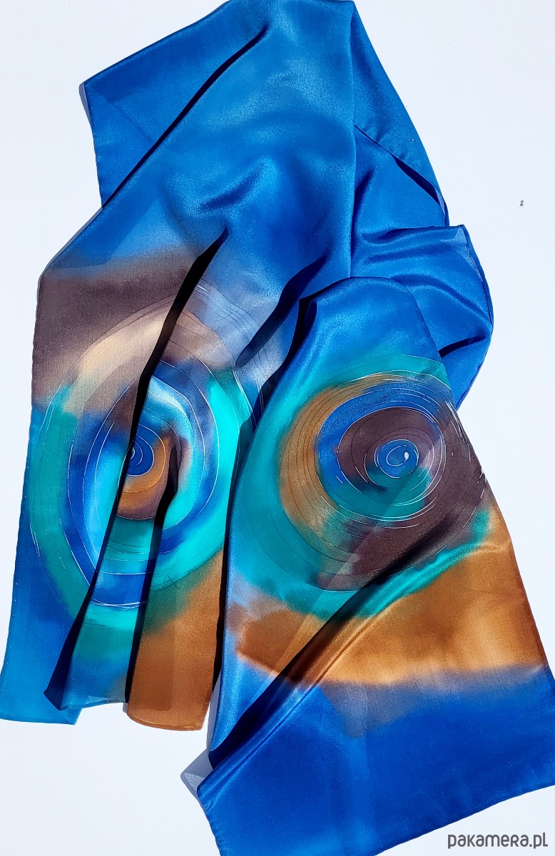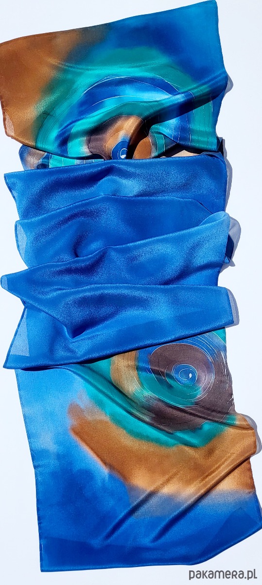Delikatny, ręcznie malowany szal z wzorem. Naturalny jedwab, doskonały zarówno na jesienne i zimowe chłody, jak i letnie upały. Wymiary pracy to 38x180cm.W szalu dominują błekity i słoneczne beże. Całość namalowana na pięknie lejącej się krepie jedwabnej wysokiej jakości. Praca utrwalana termicznie pod ciśnieniem, praktycznie nie spiera się i nie płowieje, pozwalając cieszyć się pięknem szala przez długie lata. Naturalny jedwab, doskonały zarówno na jesienne i zimowe chłody, jak i letnie upały. Wzór malarski zajmuje około 30% powierzchni szala. Praca opatrzona jest certyfikatem pochodzenia/autentyczności w pięknym opakowaniu, uzupełnionym o przepis prania. Mogę personalizować.