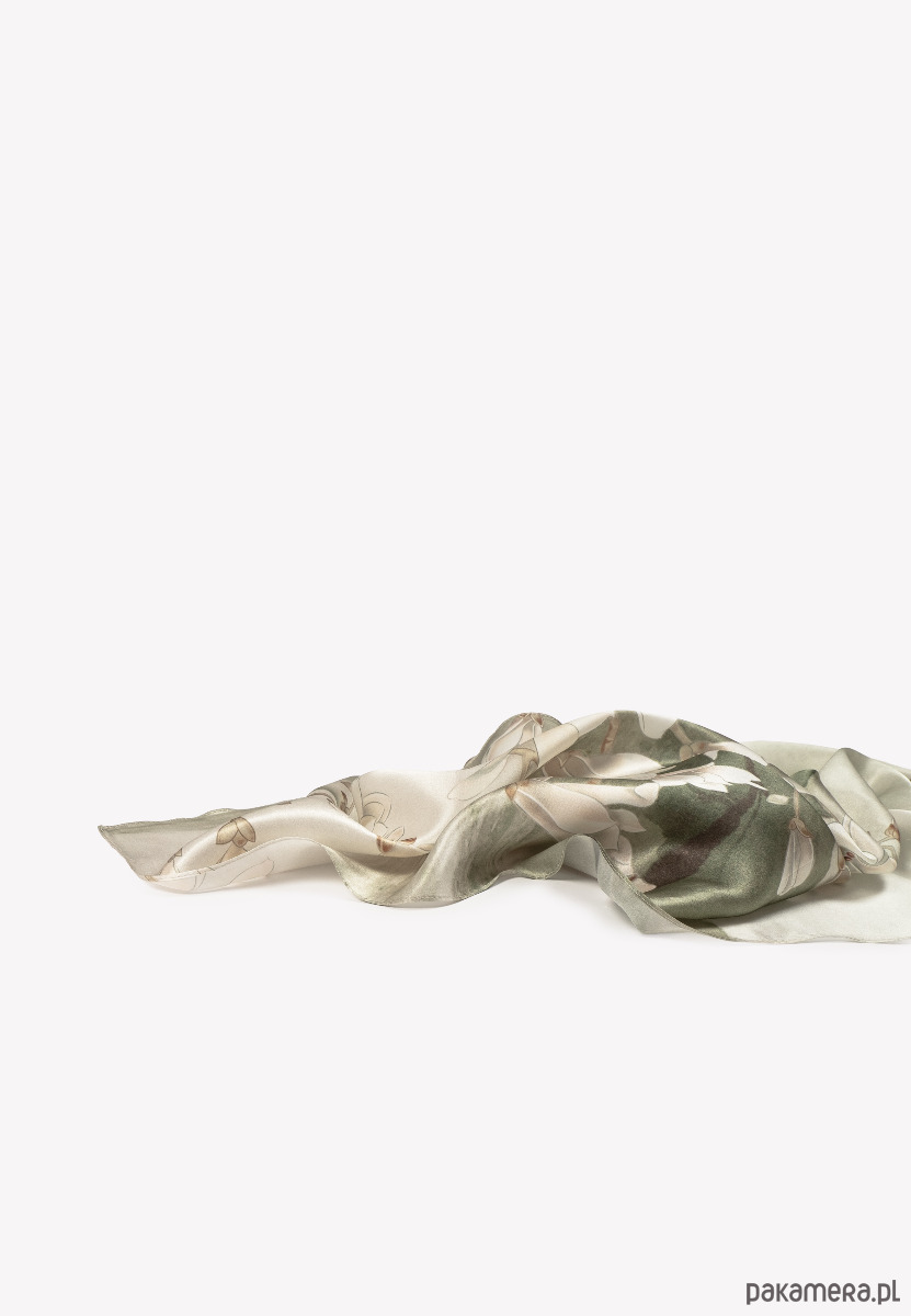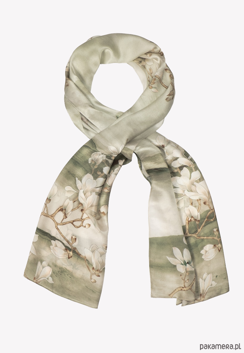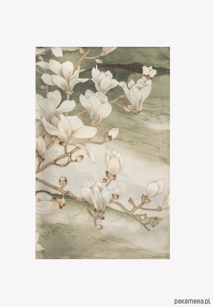 Jedwabny szal damski z subtelnym motywem magnolii zachwyca spokojną, elegancką kolorystyką w odcieniach zieleni, beżu i kremowej bieli.