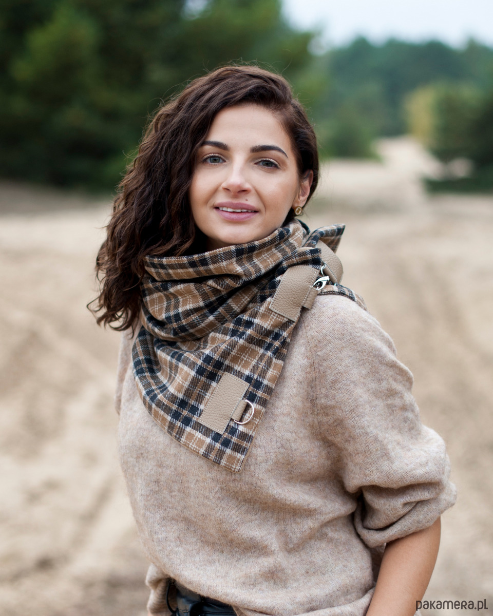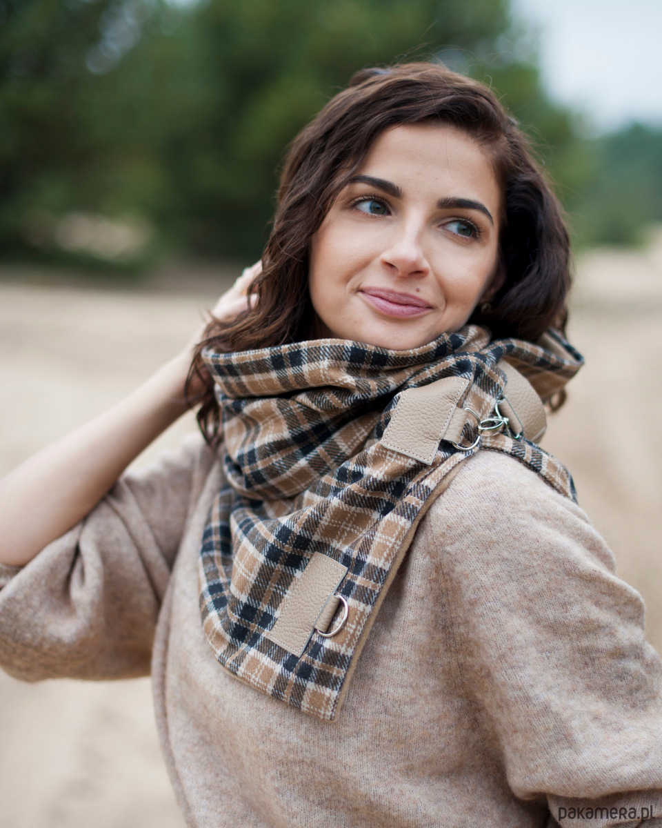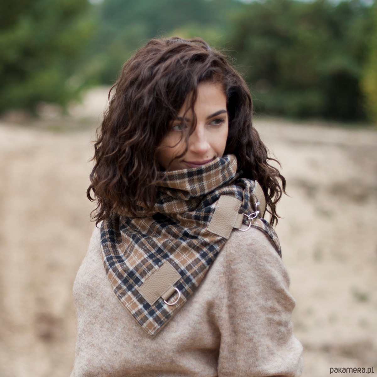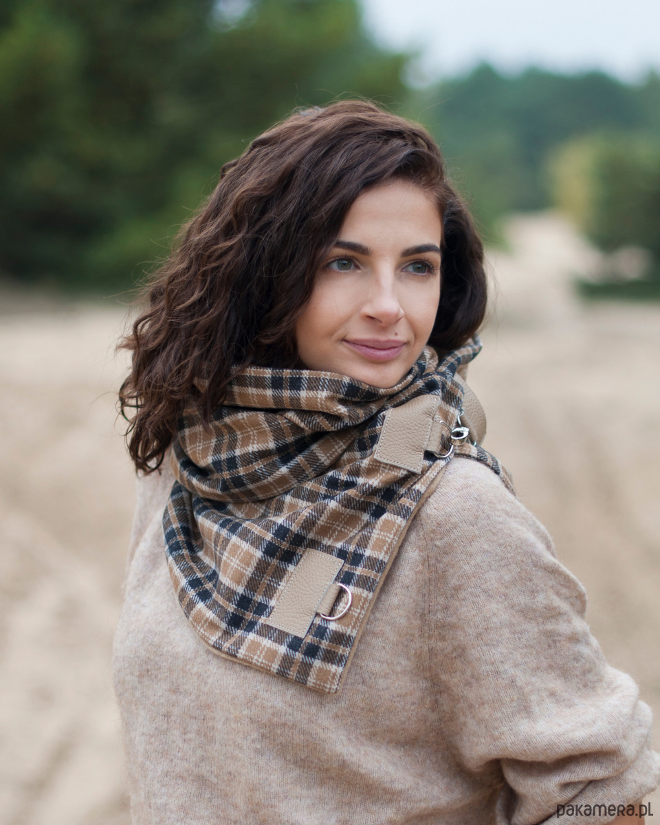 Bardzo starannie wykonany szal zapinany na 2 karabińczyki. Szal zostały uszyty z 2 warstw materiału - wierzchnia - miękka, kraciasta tkanina wełniana w kolorach, beżowobrązowym i czarnym, spód z beżowego, miłego w dotyku polaru. Szal zdobiony jest naturalną skórą oraz metalowymi zapięciami.