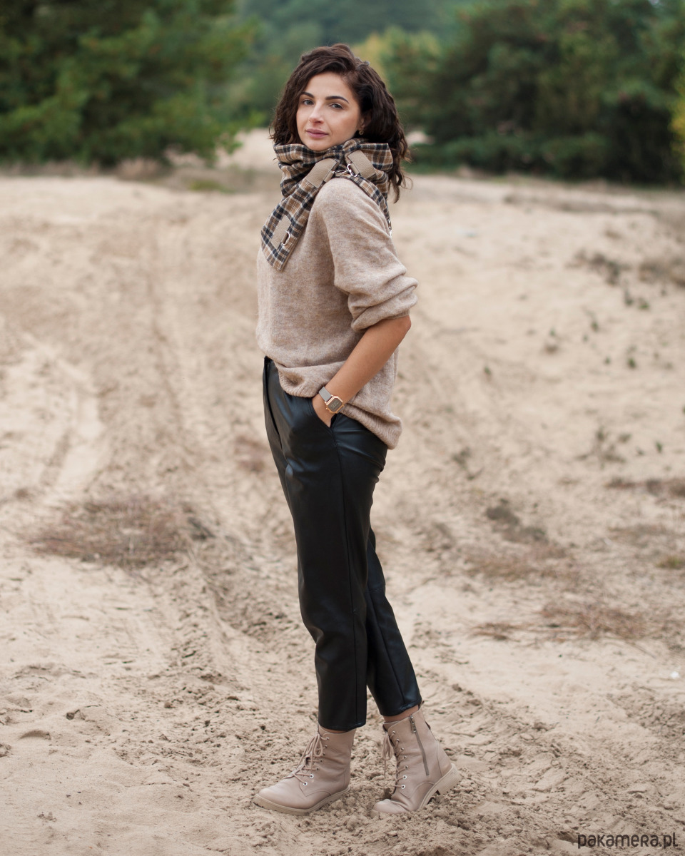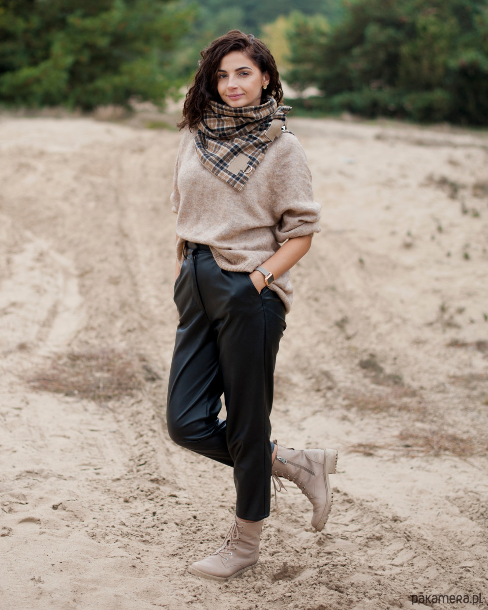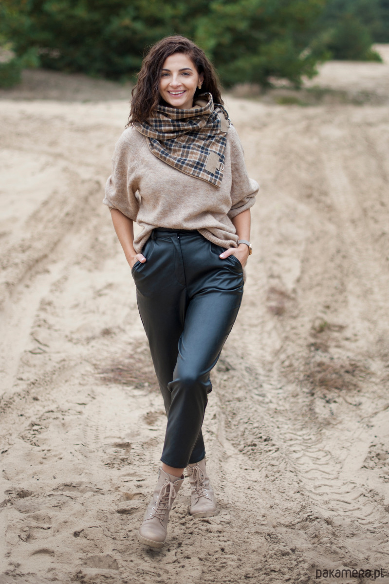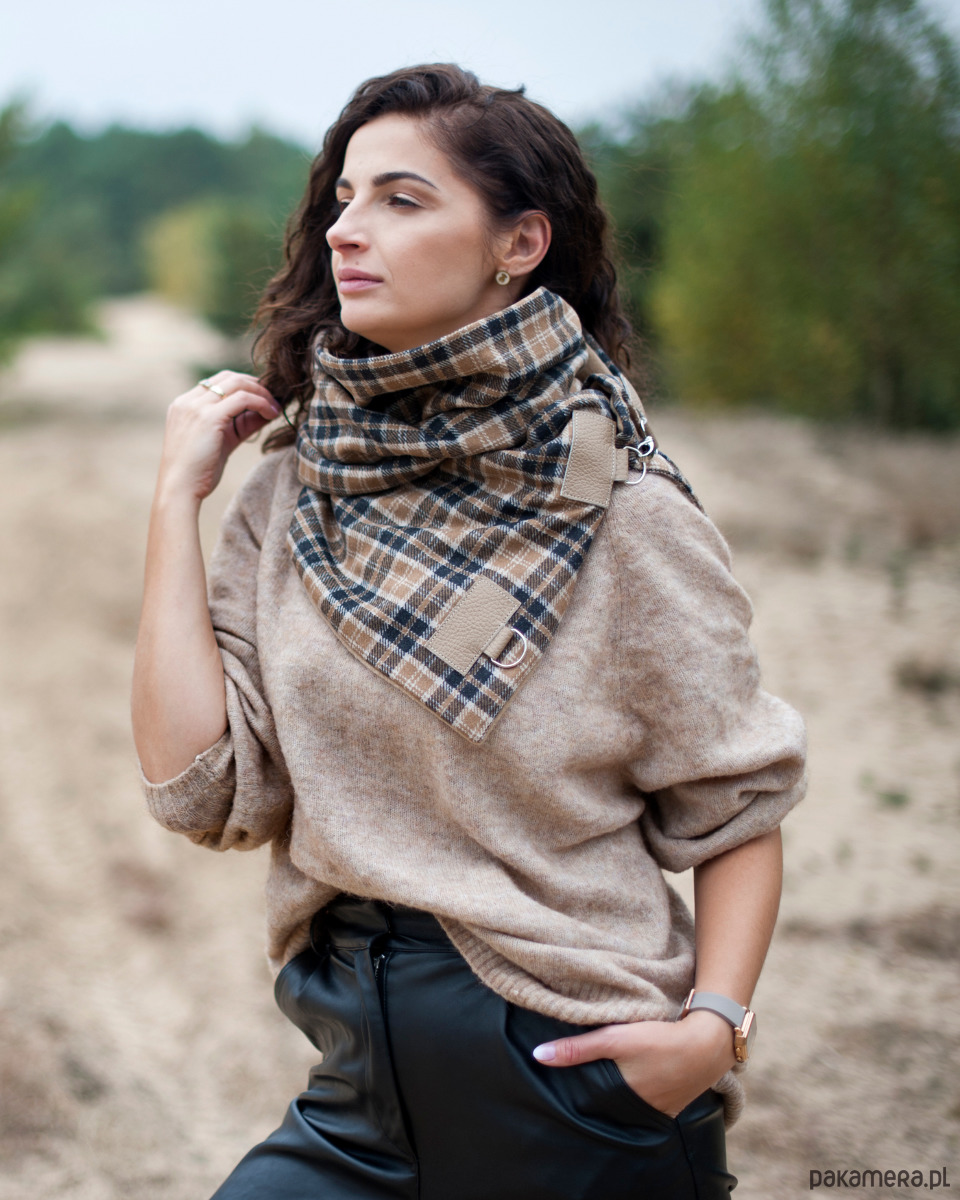 Bardzo starannie wykonany szal zapinany na 2 karabińczyki. Szal zostały uszyty z 2 warstw materiału - wierzchnia - miękka, kraciasta tkanina wełniana w kolorach, beżowobrązowym i czarnym, spód z beżowego, miłego w dotyku polaru. Szal zdobiony jest naturalną skórą oraz metalowymi zapięciami.