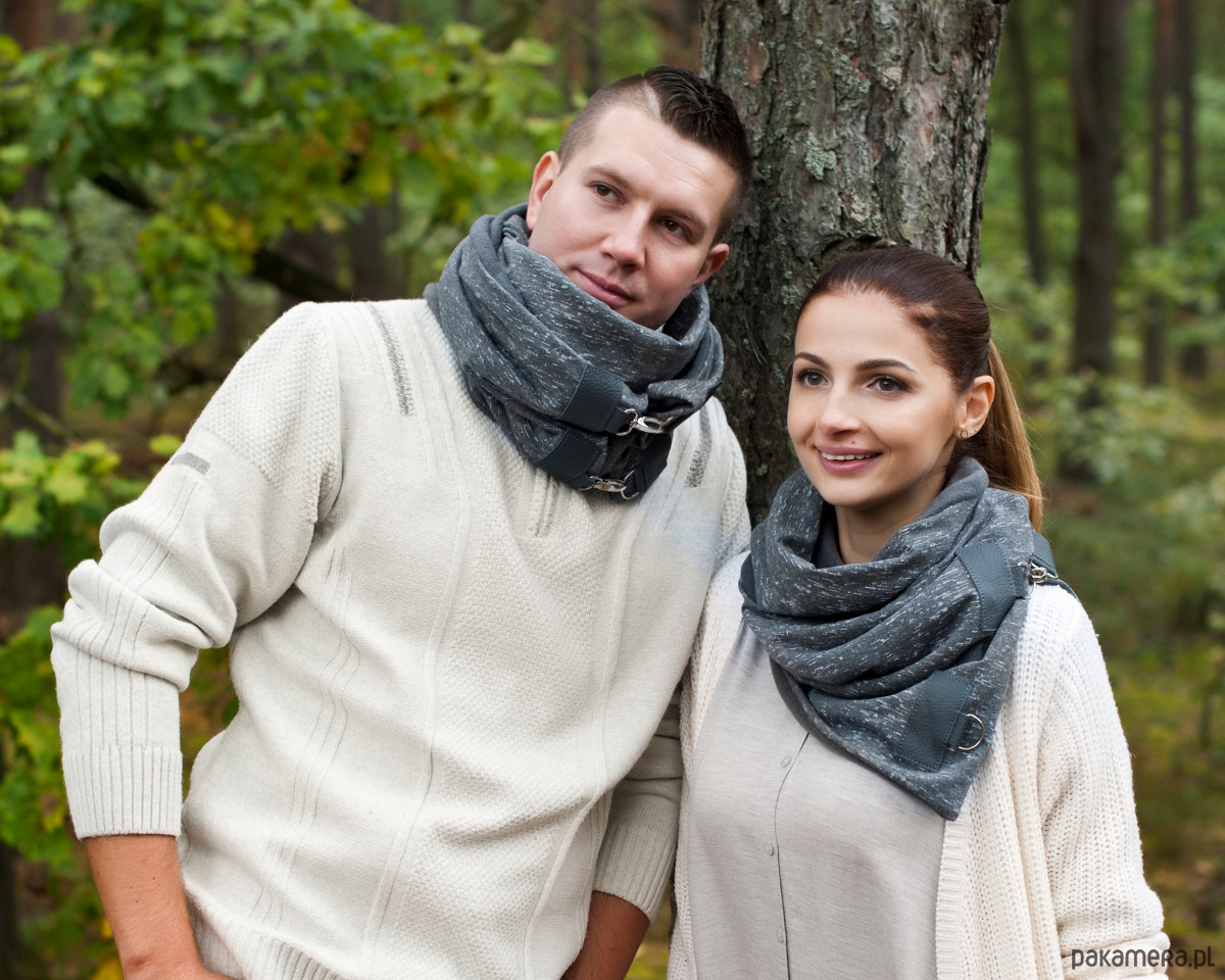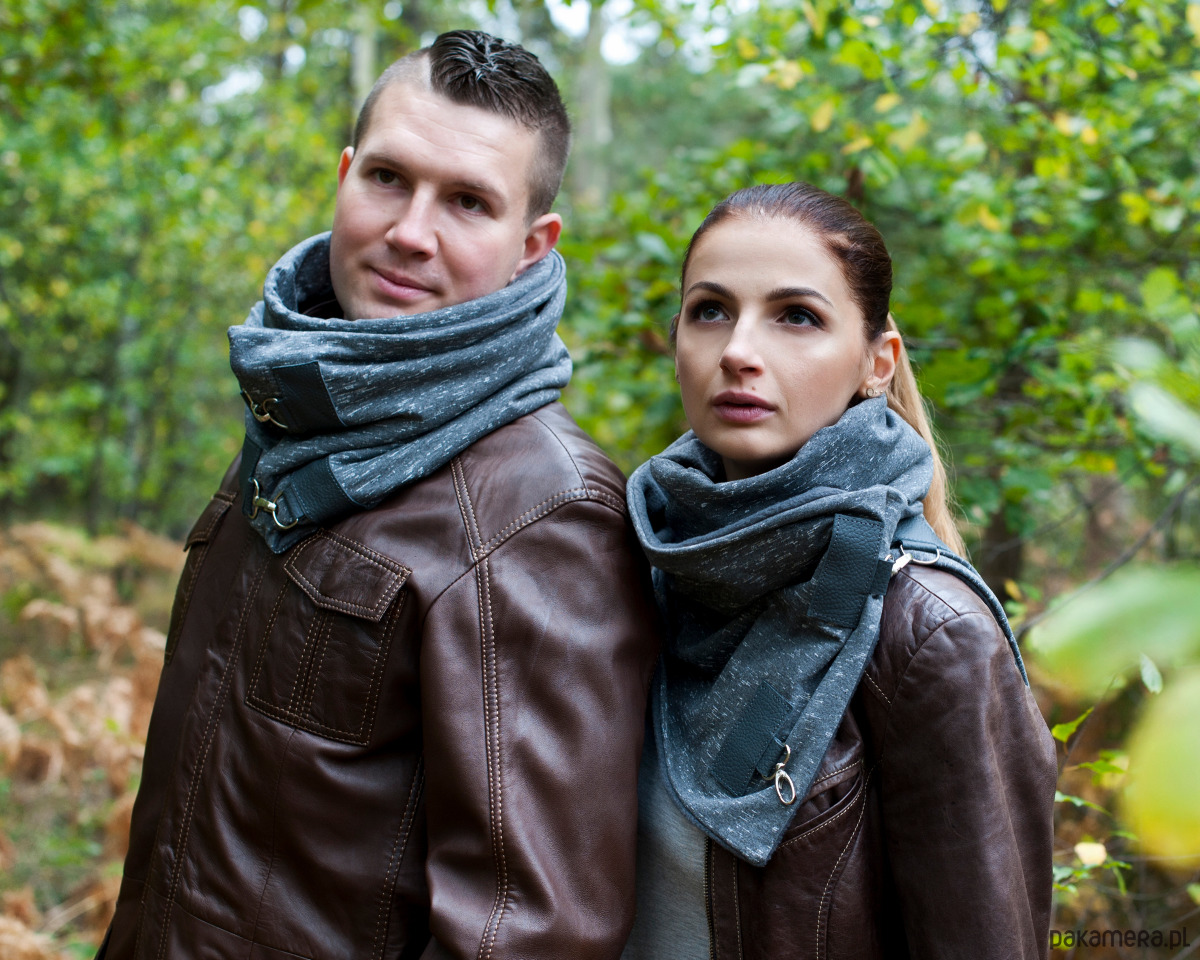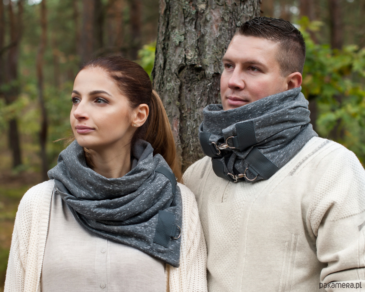 Bardzo starannie wykonany szal zapinany na 2 karabińczyki. Szal zostały wykonany z 2 warstw materiału - wierzchnia - miękka dzianina dresowa w kolorze grafitowym, spód z szarego, miłego w dotyku polaru. Szal zdobiony jest naturalną skórą oraz metalowymi zapięciami.