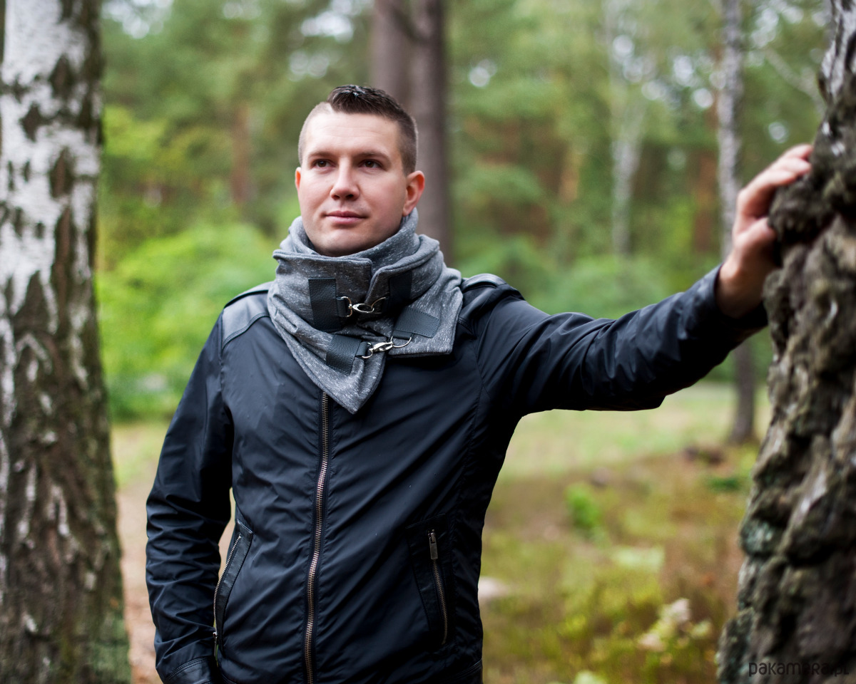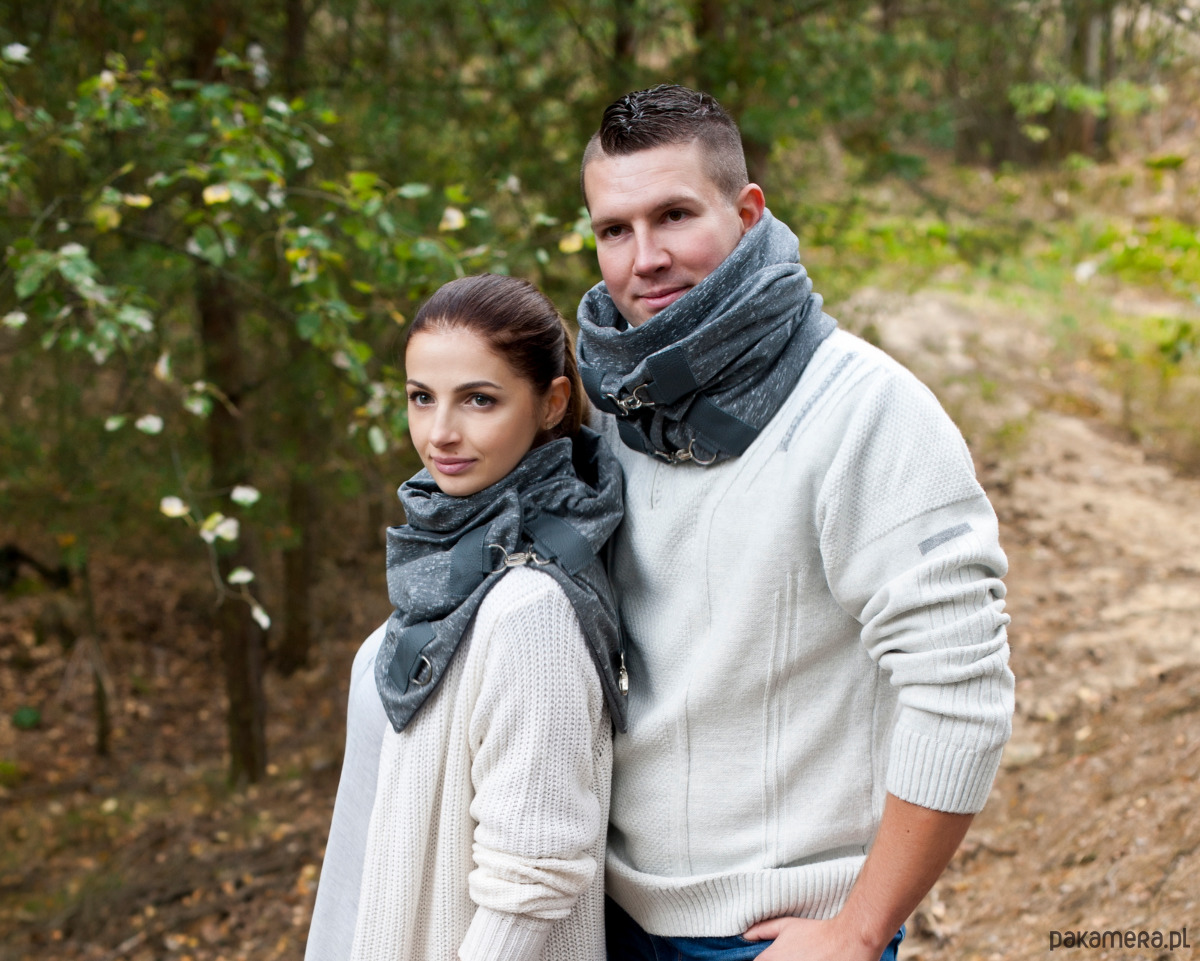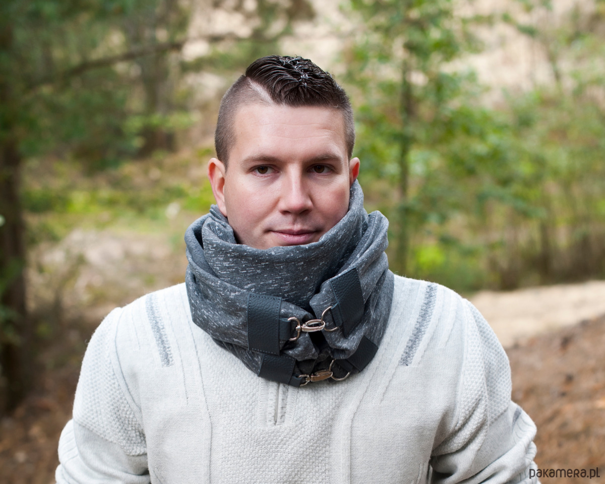 Bardzo starannie wykonany szal zapinany na 2 karabińczyki. Szal zostały wykonany z 2 warstw materiału - wierzchnia - miękka dzianina dresowa w kolorze grafitowym, spód z szarego, miłego w dotyku polaru. Szal zdobiony jest naturalną skórą oraz metalowymi zapięciami.
