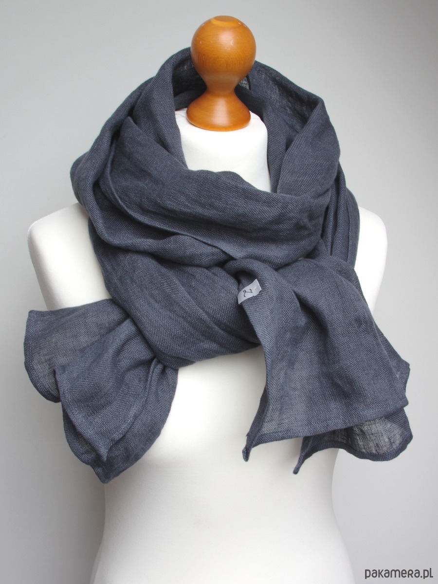 Duży, obszerny szal/apaszka z naturalnej tkaniny lnianej. Szal jest delikatny i miękki w dotyku, bardzo ładnie się układa. Tkanina ma gniecioną fakturę, przez co szal jest puszysty.