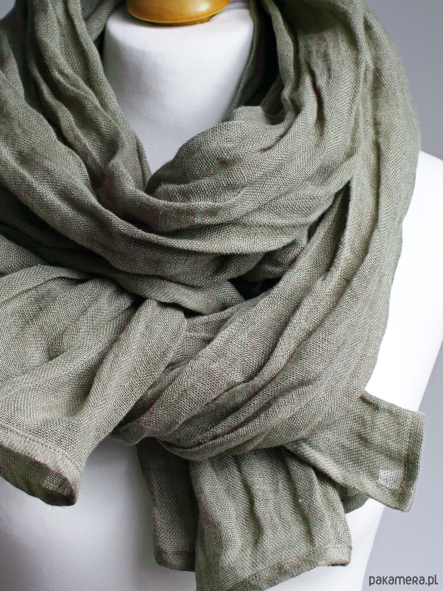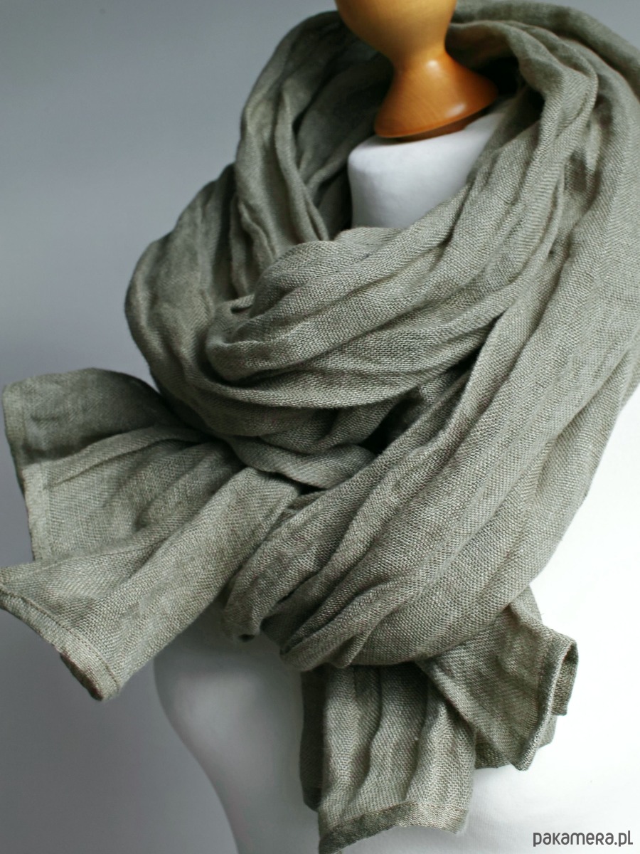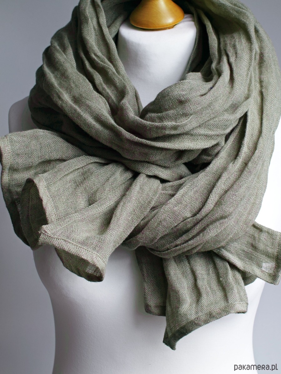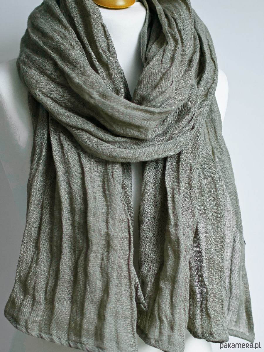 Duży, obszerny szal/apaszka z naturalnej tkaniny lnianej. Szal jest delikatny i miękki w dotyku, bardzo ładnie się układa. Tkanina ma gniecioną fakturę, przez co szal jest puszysty.