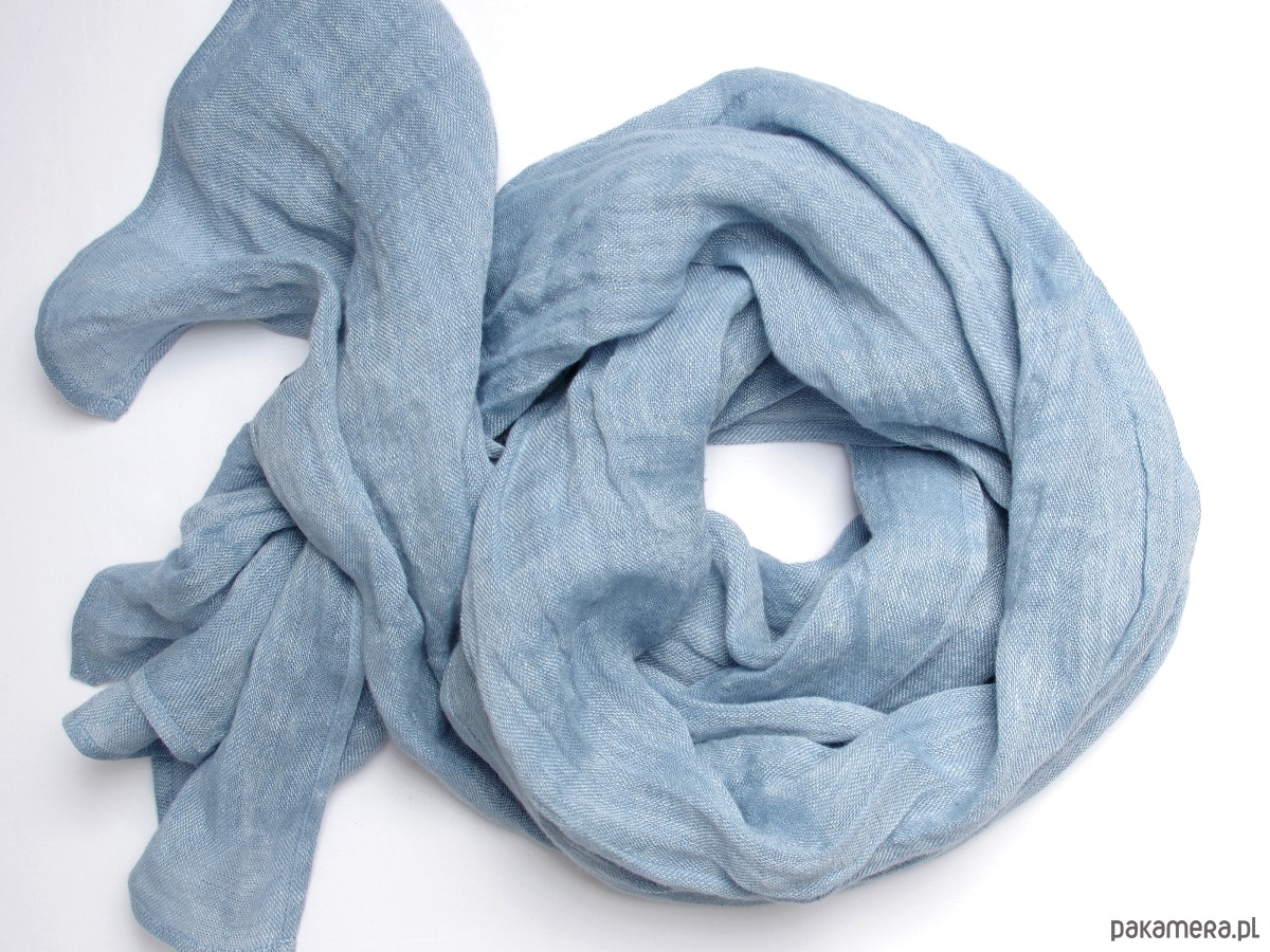 Duży, obszerny szal/apaszka z naturalnej tkaniny lnianej. Szal jest delikatny i miękki w dotyku, bardzo ładnie się układa. Tkanina ma gniecioną fakturę, przez co szal jest puszysty.